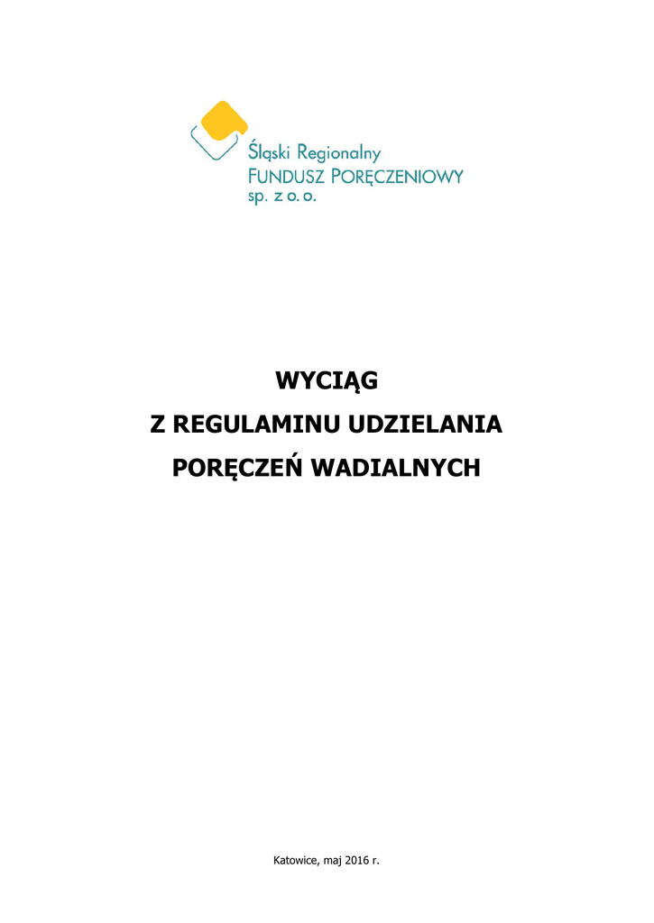 WYCIĄG Z REGULAMINU UDZIELANIA PORĘCZEŃ WADIALNYCH Katowice, maj 2016 r. 1. 2. 3. 4. 5. 6. 7. 8. 9. 10. 11. 12. 13. 14. 15. Regulamin określa zasady udzielania przez Śląski Regionalny Fundusz Poręczeniowy Sp. z o.o. poręczeń zapłaty wadium na rzecz podmiotów przystępujących do przetargów, realizowanych na zasadach określonych w ustawie z dnia 29 stycznia 2004 r. Prawo zamówień publicznych, tekst jednolity: Dz. U. z 2015 r. poz. 2164 z późn. zm. (dalej: ustawa Prawo zamówień publicznych), zobligowanych przez organizatora przetargu do wniesienia wadium. Poręczenia kierowane są wyłącznie dla mikro, małych i średnich przedsiębiorców mających siedzibę na terenie województwa śląskiego lub oddział na terenie województwa śląskiego, lub prowadzących inwestycje na terenie województwa śląskiego, jako forma wniesienia wadium w postępowaniach o udzielenie zamówienia prowadzonych na podstawie ustawy Prawo zamówień publicznych. Poręczenia zapłaty wadium realizowane są przez Śląski Regionalny Fundusz Poręczeniowy Sp. z o.o. w ramach Funduszu Poręczeń Wadialnych (zwanego dalej FPW). Celem FPW jest wspomaganie rozwoju mikro, małych i średnich przedsiębiorców poprzez udzielanie poręczeń zapłaty wadiów dla mikro, małych i średnich przedsiębiorców mających siedzibę na terenie województwa śląskiego lub oddział na terenie województwa śląskiego, lub prowadzących inwestycje na terenie województwa śląskiego, w oparciu o zasady opisane szczegółowo poniżej w niniejszym Regulaminie. Poręczenia udzielane są przez ŚRFP w ramach FPW: a) na wniosek Zobowiązanego, na rzecz Zamawiającego, jako forma wniesienia wadium, b) zgodnie z art. 6b ust. 5 pkt 2 Ustawy z dnia 9 listopada 2000 r. o utworzeniu Polskiej Agencji Rozwoju Przedsiębiorczości (DZ. U. z 2007 r. Nr 42, poz. 275, z późn. zm.), jako jeden z podmiotów uprawnionych do udzielania poręczeń zapłaty wadium, c) w oparciu o art. 45 ust. 6 pkt 5 i art. 148 ust. 1 pkt 5 ustawy Prawo zamówień publicznych, z zachowaniem warunków wykluczających zaistnienie pomocy publicznej, w szczególności warunków o których mowa w Obwieszczeniu Komisji w sprawie zastosowania art. 87 i 88 Traktatu WE do pomocy państwa w formie gwarancji (2008/C 155/02). Przedmiotem poręczenia jest zabezpieczenie zapłaty wadium, od którego wniesienia Zamawiający uzależnia dopuszczenie Zobowiązanego do udziału w przetargu. Poręczenia zapłaty wadium są udzielane w ramach pakietu wadialnego, który może składać się z wielu mniejszych poręczeń wadialnych wystawianych w trakcie obowiązywania pakietu przez ŚRFP, na zlecenie Zobowiązanego, na warunkach i do kwot określonych w punktach poniżej, ze szczególnym uwzględnieniem dotychczasowego doświadczenia Zobowiązanego w przetargach publicznych. W szczególnych przypadkach wartość pakietu może być wykorzystana poprzez udzielenie tylko jednego poręczenia. Zobowiązanymi mogą być wyłącznie przedsiębiorcy, którzy spełniają jednocześnie następujące warunki: a) są mikro, małymi lub średnimi przedsiębiorcami w rozumieniu ustawy z dnia 2 lipca 2004 r. o swobodzie działalności gospodarczej (Dz. U. z 2010 r., Nr 220, poz. 1447 z późn. zm.) oraz załącznika nr I do Rozporządzenia Komisji (UE) nr 651/2014 z dnia 17 czerwca 2014 r. uznającego niektóre rodzaje pomocy za zgodne z rynkiem wewnętrznym w zastosowaniu art. 107 i 108 Traktatu - ogólne rozporządzenie w sprawie wyłączeń blokowych (Dz. Urz. UE L 187/1 z 26.06.2014 r.); b) mają siedzibę na terenie województwa śląskiego lub oddział na terenie województwa śląskiego, lub prowadzą inwestycje na terenie województwa śląskiego, c) prowadzą działalność gospodarczą, d) nie znajdują się w trudnej sytuacji (nie są zagrożonym przedsiębiorstwem) w rozumieniu przepisów Wytycznych wspólnotowych dotyczących pomocy państwa w celu ratowania i restrukturyzacji zagrożonych przedsiębiorstw (Dz. Urz. UE C 244/2 z 01.10.2004 r.). Rozpatrzenie wniosku o poręczenie pakietu wadialnego lub indywidualnego poręczenia jest uzależnione od wniesienia przez Zobowiązanego na rzecz ŚRFP opłaty za rozpatrzenie wniosku, której aktualna wysokość podawana jest na stronie internetowej ŚRFP. Brak wniesienia opłaty za rozpatrzenie wniosku uniemożliwia rozpoczęcie procedury oceny i analizy wniosku. Wnioski o udzielenie poręczenia pakietu wadialnego oraz indywidualnego poręczenia udzielanego w ramach pakietu wadialnego, są zapisywane w rejestrze wniosków ŚRFP z zachowaniem numeracji według daty i kolejności ich wpływu. W przypadku łączenia poręczenia wadialnego z inną formą zabezpieczenia zapłaty wadium, np. gwarancją bankową, Zobowiązany wraz z wnioskiem o udzielenie poręczenia składa oświadczenie o wyrażeniu zgody na przekazywanie informacji między ŚRFP a bankiem lub inną instytucją. ŚRFP dokonuje analizy wniosku wraz z załącznikami, na podstawie której Zarząd ŚRFP ustala maksymalną wartość udzielanego poręczenia. O ile zaistnieje potrzeba, ŚRFP może zwrócić się do Zobowiązanego lub jakiejkolwiek innej instytucji o dostarczenie dodatkowych informacji na temat sytuacji prawnej i ekonomicznej Zobowiązanego. Zobowiązany wyraża zgodę na udostępnianie dokumentacji księgowej i finansowej, w szczególności: podatkowej księgi przychodów i rozchodów, ksiąg handlowych, kart podatkowych, rozliczeń ryczałtów oraz wszelkich innych ewidencji podatkowych oraz dokumentów i informacji pozostających w związku z prowadzoną działalnością. Dokumenty te będą udostępniane na każdorazowe żądanie ŚRFP oraz osób 1 fizycznych i prawnych przez niego upoważnionych. Brak wyżej wymienionej zgody powoduje automatyczne odrzucenie wniosku o poręczenie. 16. Maksymalna kwota indywidualnego poręczenia udzielanego w ramach pakietu wadialnego wynosi 1.000.000,00 zł, jednak nie więcej niż 100% wartości wadium. 17. Maksymalna 