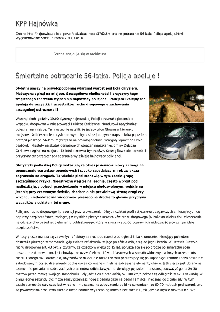 KPP Hajnówka Źródło: http://hajnowka.policja.gov.pl/po8/aktualnosci/3762,Smiertelne-potracenie-56-latka-Policja-apeluje.html Wygenerowano: Środa, 8 marca 2017, 00:16 Strona znajduje się w archiwum. Śmiertelne potrącenie 56-latka. Policja apeluje ! 56-letni pieszy najprawdopodobniej wtargnął wprost pod koła chryslera. Mężczyzna zginął na miejscu. Szczegółowe okoliczności i przyczyny tego tragicznego zdarzenia wyjaśniają hajnowscy policjanci. Policjanci kolejny raz apelują do wszystkich uczestników ruchu drogowego o zachowanie szczególnej ostrożności!! Wczoraj około godziny 19.00 dyżurny hajnowskiej Policji otrzymał zgłoszenie o wypadku drogowym w miejscowości Dubicze Cerkiewne. Mundurowi natychmiast pojechali na miejsce. Tam wstępnie ustalili, że jadący ulica Główną w kierunku miejscowości Kleszczele chrysler po wyminięciu się z jadącym z naprzeciwka pojazdem potrącił pieszego. 56-letni mężczyzna najprawdopodobniej wtargnął wprost pod koła osobówki. Niestety na skutek odniesionych obrażeń mieszkaniec gminy Dubicze Cerkiewne zginął na miejscu. 42-letni kierowca był trzeźwy. Szczegółowe okoliczności i przyczyny tego tragicznego zdarzenia wyjaśniają hajnowscy policjanci. Statystyki podlaskiej Policji wskazują, że okres jesienno–zimowy z uwagi na pogorszenie warunków pogodowych i szybko zapadający zmrok zwiększa zagrożenia na drogach. To właśnie piesi stanowią w tym czasie grupę szczególnego ryzyka. Nieostrożne wejście na jezdnię, często wprost pod nadjeżdżający pojazd, przechodzenie w miejscu niedozwolonym, wejście na jezdnię przy czerwonym świetle, chodzenie nie prawidłową stroną drogi czy w końcu niedostateczna widoczność pieszego na drodze to główne przyczyny wypadków z udziałem tej grupy. Policjanci ruchu drogowego i prewencji przy prowadzeniu różnych działań profilaktyczno-ostrzegawczych zmierzających do poprawy bezpieczeństwa, zachęcają wszystkich pieszych uczestników ruchu drogowego (w każdym wieku) do umieszczania na odzieży choćby jednego elementu odblaskowego, który w znaczny sposób poprawi ich widoczność a co za tym idzie bezpieczeństwo. W nocy pieszy ma szansę zauważyć reflektory samochodu nawet z odległości kilku kilometrów. Kierujący pojazdem dostrzeże pieszego w momencie, gdy światła reflektorów w jego pojeździe odbiją się od jego ubrania. W Ustawie Prawo o ruchu drogowym art. 43 pkt. 2 czytamy, że dziecko w wieku do 15 lat, poruszające się po drodze po zmierzchu poza obszarem zabudowanym, jest obowiązane używać elementów odblaskowych w sposób widoczny dla innych uczestników ruchu. Dlatego tak istotne jest, aby zarówno dzieci, ale także i dorośli poruszający się po zapadnięciu zmroku poza obszarem zabudowanym posiadali elementy odblaskowe i co ważne – mieli na sobie jasne elementy ubioru. Jeśli pieszy jest ubrany na czarno, nie posiada na sobie żadnych elementów odblaskowych to kierujący pojazdem ma szansę zauważyć go na 20-30 metrów przed maską swojego samochodu. Gdy jedzie on z prędkością ok. 100 km/h pokona tę odległość w ok. 1 sekundę. W ciągu jednej sekundy być może zdąży przenieść nogę z pedału gazu na pedał hamulca i nacisnąć go z całej siły. W tym czasie samochód cały czas jest w ruchu – ma szansę na zatrzymanie po kilku sekundach, po 60-70 metrach pod warunkiem, że powierzchnia drogi była sucha a układ hamulcowy i stan ogumienia bez zarzutu. Jeśli jezdnia będzie mokra lub śliska droga hamowania bardzo się wydłuży. Natomiast jeżeli pieszy posiada na sobie elementy odblaskowe na nieoświetlonej drodze pozwala to kierującemu na zauważenie go w światłach mijania samochodu już z odległości 130-150 metrów. Wtedy kierujący ma możliwość podjęcia odpowiednich czynności, które pozwolą na wykonanie odpowiedniego manewru np. bezpiecznego ominięcia pieszego. Właśnie w tym okresie jezdnia jest coraz częściej mokra a przyczepność kół jest o wiele słabsza niż w warunkach letnich. Ze względu na zmieniający się stan nawierzchni należy pamiętać o tym, że poprzez gwałtowny ruch kołem kierownicy, czy też przez gwałtowne hamowanie lub gwałtowne przyspieszanie możemy doprowadzić do poślizgu pojazdu. Jeżeli pojazd nie jest wyposażony w ABS, należy hamować pulsacyjnie, aby nie doprowadzić do zerwania przyczepności kół. Uczestnicy ruchu drogowego muszą pamiętać o obowiązkach wynikających, z Art. 19 Ustawy Prawo o ruchu drogowym tj.: o tym, iż kierujący pojazdem jest obowiązany jechać z prędkością zapewniająca panowanie nad pojazdem, z uwzględnieniem warunków, w jakich ruch się odbywa, w szczególności: rzeźby terenu, stanu i widoczności drogi, stanu i ładunku pojazdu, warunków atmosferycznych i natężenia ruchu. Ponadto jest obowiązany jechać z prędkością nieutrudniającą jazdy innym kierującym, hamować w sposób niepowodujący zagrożenia bezpieczeństwa ruchu lub jego utrudnienia, utrzymywać odstęp niezbędny do uniknięcia zderzenia w razie hamowania lub zatrzymania się poprzedzającego pojazdu. Należy także uważać podczas jazdy na mostach i wiaduktach, na których łatwo wpaść w poślizg. Mimo, iż nie ma przymrozku przy gruncie, na wiadukcie lub moście często występuje miejscowe oblodzenie. Należy wówczas zachować szczególną ostrożność i zmniejszyć prędkość w szczególności nad ranem oraz po opadnięciu mgły. Krótszy dzień powoduje, że częściej jeździmy po zmroku. Podczas jazdy światła innego pojazdu mogą oślepiać nawet na kilka sekund. Aby światła pojazdów jadących z naprzeciwka nie raziły nas, unikajmy patrzenia na przeciwległy pas ruchu, skoncentrujmy się na poboczu i pasie, którym się poruszamy. Eksploatacja pojazdu W okresie jesienno – zimowym, kiedy na drogach jest ślisko, pada deszcz, śnieg, wcześniej zapada zmrok, a temu wszystkiemu dodatkowo towarzyszy często mgła, 