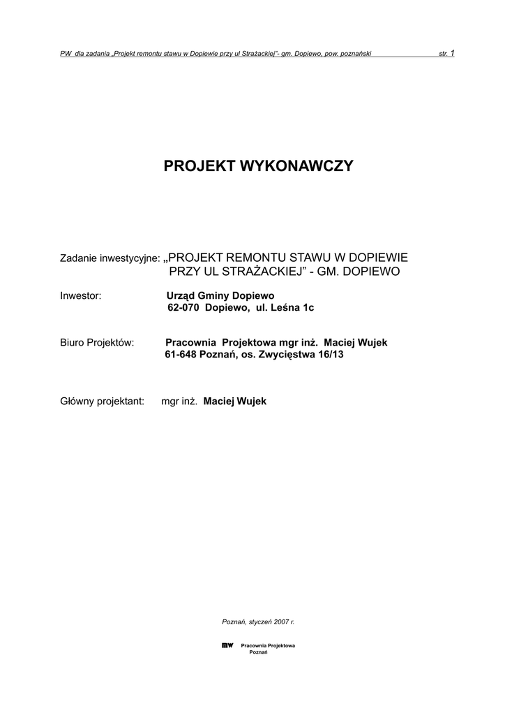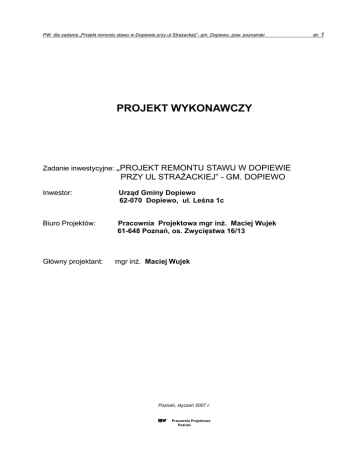 PW dla zadania „Projekt remontu stawu w Dopiewie przy ul Strażackiej”- gm. Dopiewo, pow. poznański PROJEKT WYKONAWCZY Zadanie inwestycyjne: „PROJEKT REMONTU STAWU W DOPIEWIE PRZY UL STRAŻACKIEJ” - GM. DOPIEWO Inwestor: Urząd Gminy Dopiewo 62-070 Dopiewo, ul. Leśna 1c Biuro Projektów: Pracownia Projektowa mgr inż. Maciej Wujek 61-648 Poznań, os. Zwycięstwa 16/13 Główny projektant: mgr inż. Maciej Wujek Poznań, styczeń 2007 r. MW Pracownia Projektowa Poznań str. 1 str. 2 PW dla zadania „Projekt remontu stawu w Dopiewie przy ul Strażackiej”- gm. Dopiewo, pow. poznański Zadanie inwestycyjne: „Projekt remontu stawu w Dopiewie przy ul. Strażackiej” gm. Dopiewo, pow. poznański Inwestor: Urząd Gminy Dopiewo 62-070 Dopiewo, ul. Leśna 1c Biuro Projektów: Pracownia Projektowa mgr inż. Maciej Wujek 61-648 Poznań, os. Zwycięstwa 16/13 Oświadczenie Projekt wykonawczy dla zadania inwestycyjnego pn.: „Projekt remontu stawu w Dopiewie przy ul Strażackiej” - gm. Dopiewo, pow. poznański, został sporządzony zgodnie z obowiązującymi przepisami oraz zasadami wiedzy technicznej. L.p. Funkcja Imię i nazwisko Nr uprawnień Data Podpis 1 2 3 4 5 6 715/Pw/94 w specjalności konstrukcyjno-inżynieryjnej w zakresie budowli hydrotechnicznych 1 Projektant -cz. konstrukcyjna Maciej Wujek 790/Pw/94 w specjalności instalacyjnoinżynieryjnej w zakresie sieci wodociągowych i kanalizacyjnych MW Pracownia Projektowa Poznań 01.2007 PW dla zadania „Projekt remontu stawu w Dopiewie przy ul Strażackiej”- gm. Dopiewo, pow. poznański str. 3 SPIS TREŚCI: CZĘŚĆ I – PROJEKT ZAGOSPODAROWANIA TERENU..........................................................6 I-1. PODSTAWA OPRACOWANIA..........................................................................................................................................6 I-2. PRZEDMIOT INWESTYCJI.............................................................................................................................................6 I-3. ISTNIEJĄCE ZAGOSPODAROWANIE TERENU I PRZEWIDYWANE ZMIANY..................................................................................6 I-3.1. Położenie.....................................................................................................................................................6 I-3.2. Istniejące zagospodarowanie terenu .........................................................................................................6 I-3.3. Przewidywane zmiany w zagospodarowaniu terenu..................................................................................6 I-3.4. Stan prawny nieruchomości.......................................................................................................................6 CZĘŚĆ II – PROJEKT ARCHITEKTONICZNO-KONSTRUKCYJNY...........................................7 II-1. DANE OGÓLNE........................................................................................................................................................7 II-2. PODSTAWOWE DANE INWESTYCJI................................................................................................................................7 II-3. DANE OGÓLNE........................................................................................................................................................7 II-3.1. Dane geodezyjne........................................................................................................................................7 II-3.2. Dane geologiczne.......................................................................................................................................8 II-3.3. Gospodarka wodna....................................................................................................................................8 II-4. ROZWIĄZANIA TECHNICZNE.......................................................................................................................................8 II-4.1. Odmulenie czaszy stawu............................................................................................................................8 Tab. 2....................................................................................................................................................................9 L.p.........................................................................................................................................................................9 WYKOPY W CZASZY STAWU..............................................................................................................................9 NASYPY (UZUPEŁNIENIA SKARP)...................................................................................................................9 stron lewa..............................................................................................................................................................9 strona prawa.........................................................................................................................................................9 Przekrój.................................................................................................................................................................9 Lokalizacja............................................................................................................................................................9 Powierzchnia.........................................................................................................................................................9 w przekroju ...........................................................................................................................................................9 czaszy stawu......................................................................................................................................