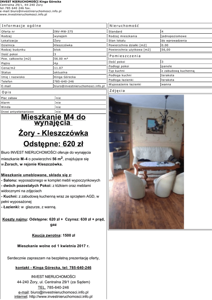 INVEST NIERUCHOMOŚCI Kinga Górecka Centralna 29/1, 44-240 Żory tel.785 640 246 fax. e-mail:[email protected] www.investnieruchomosci.info.pl Informacje ogólne Nieruchomość Oferta nr INV-MW-375 Standard 4 Rodzaj wynajem Rodzaj mieszkania jednopoziomowe Lokalizacja Żory Stan lokalu do wprowadzenia Dzielnica Kleszczówka Powierzchnia działki [m2] 0.00 Rodzaj budynku blok Powierzchnia użytkowa [m2] 56,00 Ilość pokoi 3 Pow. całkowita [m2] 56.00 m² Piętro 4p Cena/m2 11.07 Status aktualna Imię i nazwisko Kinga Górecka Telefon 785-640-246 E-mail [email protected] Pomieszczenia Ilość pokoi 3 Podłogi pokoi panele Typ kuchni z zabudową kuchenną Podłoga kuchni terakota Podłoga łazienki terakota Wyposażenie łazienki wanna Zdjęcia Opis Plac zabaw nie Alarm nie Winda nie Drzwi antywłamaniowe nie Mieszkanie M4 do wynajęcia Żory - Kleszczówka Odstępne: 620 zł Biuro INVEST NIERUCHOMOŚCI oferuje do wynajęcia mieszkanie M-4 o powierzchni 56 m2, znajdujące się w Żorach, w rejonie Kleszczówka. Mieszkanie umeblowane, składa się z: - Salonu: wyposażonego w komplet mebli wypoczynkowych - dwóch pozostałych Pokoi: z łóżkiem oraz meblami widocznymi na zdjęciach - Kuchni: z zabudową kuchenną wraz ze sprzętem AGD, w pełni wyposażonej - Łazienki: w glazurze, z wanną. Koszty najmu: Odstępne: 620 zł + Czynsz: 630 zł + prąd, gaz Kaucja zwrotna: 1500 zł Mieszkanie wolne od 1 kwietnia 2017 r. Serdecznie zapraszam na bezpłatną prezentację oferty, kontakt - Kinga Górecka, tel: 785-640-246 INVEST NIERUCHOMOŚCI 44-240 Żory, ul. Centralna 29/1 (za Sądem) TEL. 785-640-246 e-mail: [email protected] internet: http://www.investnieruchomosci.info.pl Licencja nr 21998 © Wszelkie prawa zastrzeżone - INVEST NIERUCHOMOŚCI