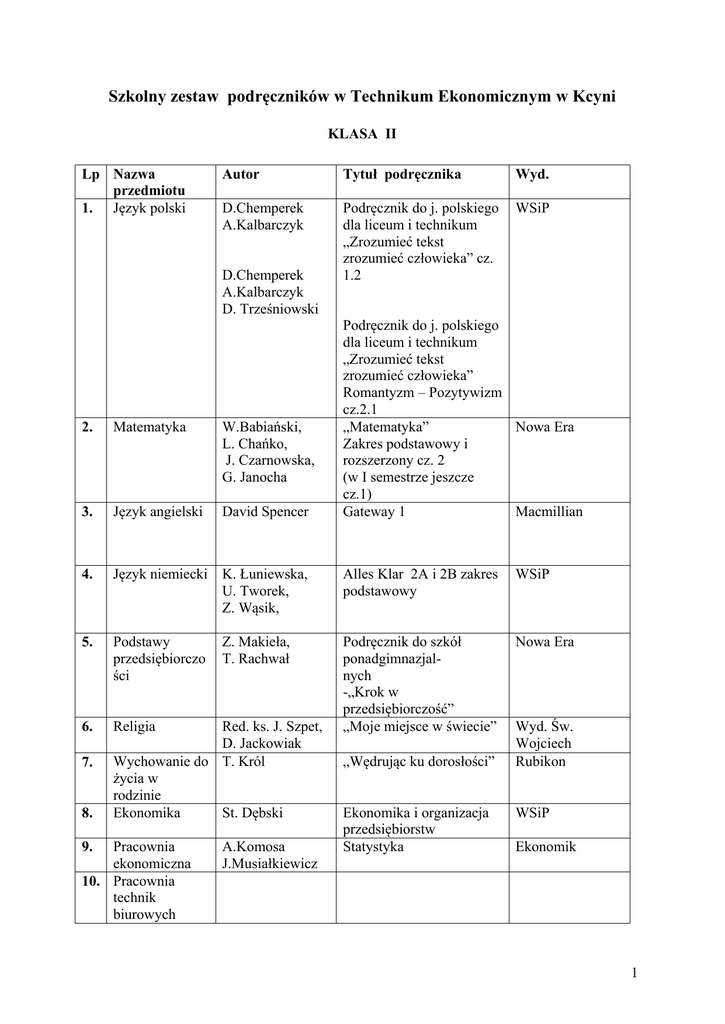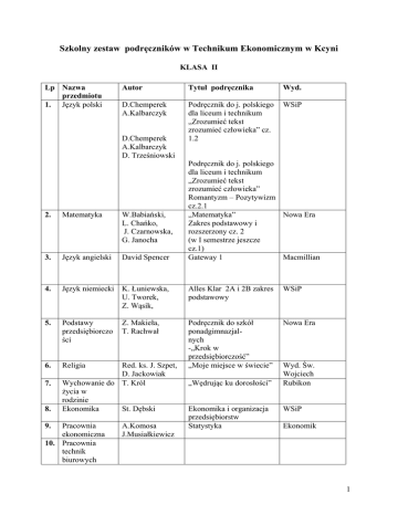 Szkolny zestaw podręczników w Technikum Ekonomicznym w Kcyni KLASA II Lp Nazwa przedmiotu 1. Język polski Autor Tytuł podręcznika Wyd. D.Chemperek A.Kalbarczyk Podręcznik do j. polskiego dla liceum i technikum „Zrozumieć tekst zrozumieć człowieka” cz. 1.2 WSiP D.Chemperek A.Kalbarczyk D. Trześniowski 2. Matematyka W.Babiański, L. Chańko, J. Czarnowska, G. Janocha 3. Język angielski David Spencer 4. Język niemiecki K. Łuniewska, U. Tworek, Z. Wąsik, 5. Podstawy przedsiębiorczo ści 6. Religia 7. 8. Red. ks. J. Szpet, D. Jackowiak Wychowanie do T. Król życia w rodzinie Ekonomika St. Dębski Pracownia ekonomiczna 10. Pracownia technik biurowych 9. Z. Makieła, T. Rachwał A.Komosa J.Musiałkiewicz Podręcznik do j. polskiego dla liceum i technikum „Zrozumieć tekst zrozumieć człowieka” Romantyzm – Pozytywizm cz.2.1 „Matematyka” Nowa Era Zakres podstawowy i rozszerzony cz. 2 (w I semestrze jeszcze cz.1) Gateway 1 Macmillian Alles Klar 2A i 2B zakres podstawowy WSiP Podręcznik do szkół ponadgimnazjalnych -„Krok w przedsiębiorczość” „Moje miejsce w świecie” Nowa Era „Wędrując ku dorosłości” Ekonomika i organizacja przedsiębiorstw Statystyka Wyd. Św. Wojciech Rubikon WSiP Ekonomik 1 11. Podstawy ekonomii 12. Działalność gospodarcza 13. Analiza finansowa 14. Rachunkowość 15. Pracownia rachunkowości 16. Historia i społeczeństwo B.Padurek D. Dębski M. Markiewicz O. Pytlińska A. Wyroda Podstawy ekonomii Difin Planowanie i prowadzenie działalności w org. Planowanie, analiza ekon. i sprawozdawczość Zasady Rachunkowości cz. I i II Pracownia ekonomiczna Cz.III „ Ojczysty Panteon i ojczyste spory „ „Europa i Świat” Wrocław 2014Bożena Padurek WSIP Wyd. B. Padurek Wyd. B Padurek WSiP 2