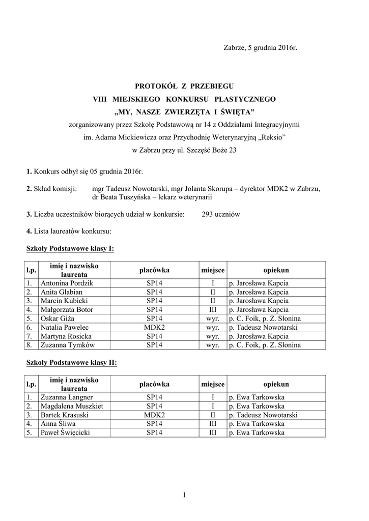 Zabrze, 5 grudnia 2016r. PROTOKÓŁ Z PRZEBIEGU VIII MIEJSKIEGO KONKURSU PLASTYCZNEGO „MY, NASZE ZWIERZĘTA I ŚWIĘTA” zorganizowany przez Szkołę Podstawową nr 14 z Oddziałami Integracyjnymi im. Adama Mickiewicza oraz Przychodnię Weterynaryjną „Reksio” w Zabrzu przy ul. Szczęść Boże 23 1. Konkurs odbył się 05 grudnia 2016r. 2. Skład komisji: mgr Tadeusz Nowotarski, mgr Jolanta Skorupa – dyrektor MDK2 w Zabrzu, dr Beata Tuszyńska – lekarz weterynarii 3. Liczba uczestników biorących udział w konkursie: 293 uczniów 4. Lista laureatów konkursu: Szkoły Podstawowe klasy I: l.p. 1. 2. 3. 4. 5. 6. 7. 8. imię i nazwisko laureata Antonina Pordzik Anita Glabian Marcin Kubicki Małgorzata Botor Oskar Giża Natalia Pawelec Martyna Rosicka Zuzanna Tymków placówka miejsce SP14 SP14 SP14 SP14 SP14 MDK2 SP14 SP14 I II II III wyr. wyr. wyr. wyr. placówka miejsce SP14 SP14 MDK2 SP14 SP14 I I II III III opiekun p. Jarosława Kapcia p. Jarosława Kapcia p. Jarosława Kapcia p. Jarosława Kapcia p. C. Foik, p. Z. Słonina p. Tadeusz Nowotarski p. Jarosława Kapcia p. C. Foik, p. Z. Słonina Szkoły Podstawowe klasy II: l.p. 1. 2. 3. 4. 5. imię i nazwisko laureata Zuzanna Langner Magdalena Muszkiet Bartek Krasuski Anna Śliwa Paweł Święcicki 1 opiekun p. Ewa Tarkowska p. Ewa Tarkowska p. Tadeusz Nowotarski p. Ewa Tarkowska p. Ewa Tarkowska Szkoły Podstawowe klasy III: l.p. 1. 2. 3. 4. 5. 6. 7. 8. imię i nazwisko laureata szkoła miejsce Sara Hyla Daria Przybyła Ewelina Gołdy Amelia Skóra Angelika Hrabowska Wiktoria Kucharska Tomasz Mocek Magdalena Słonina SP14 SP42 SP36 SP36 SP14 SP42 SP42 SP14 I I II II III III III III opiekun p. Ewa Tarkowska p. Mariola Wiśniewska p. Ewa Wojciechowska p. Ewa Wojciechowska p. Ewa Tarkowska p. Mariola Wiśniewska p. Mariola Wiśniewska p. U. Kwapień, p. Z. Słonina Szkoły Podstawowe klasy IV – VI: l.p. imię i nazwisko laureata szkoła miejsce opiekun 1. 2. 3. 4. 5. 6. 7. 8. 9. Adam Bieniek Otylia Rudzka Sandra Wichłacz Nadia Furtak Bartek Sękowski Antoni Szymusiak Oskar Borys Mikołaj Lewicki Sebastian Mentel SP14 SP14 SP14 SP14 SP14 SP14 SP14 SP14 I I I II II II III III III p. Joanna Adamska p. J. Adamska, p. M. Rzymkowska p. Joanna Adamska p. Joanna Adamska p. Joanna Adamska p. Joanna Adamska p. Joanna Adamska, p. I. Banach p. Joanna Adamska, p. I. Banach p. Anna Kossowska 10. 11. 12. 13. 14. 15. Aleksandra Mordas Marta Ziomek Aleksandra Ambroziak Michał Lupa Piotr Pieprz Małgorzata Sołtysik Międzynarodowa Szkoła Podstawowa SP30 SP14 SP14 SP14 SP14 SP14 III III wyr. wyr. wyr. wyr. p. Natalia Bednarz p. Ewa Tarkowska p. Joanna Adamska p. J. Adamska, I. Niestrój p. Joanna Adamska p. Joanna Adamska Gimnazja: l.p. imię i nazwisko laureata 1. Małgorzata Falecka 2. Matylda Nowak szkoła miejsce G3 w ZSO11 Salezjański Zespół Szkół Publicznych I p. Walerian Warzecha I p. Natalia Bednarz opiekun Laureaci konkursu „My, nasze zwierzeta i święta” – uczniowie o specjalnych potrzebach edukacyjnych w klasach IV – VI: l.p. 1. 2. 3. 4. 5. imię i nazwisko laureata Andrzej Sagan Paulina Bigos Grzegorz Pietrzyk Armenda Pewłowski Adam Dudzik szkoła miejsce SP14 ZSS39 ZSS39 ZSS39 SP14 I II III III wyr. opiekun p. Anna Langner p. Małgorzata Baryła p. Aleksandra Piotrowska p. Aleksandra Piotrowska p. J. Adamska, p. K. Kasprzyk 2 Laureaci konkursu „My, nasze zwierzeta i święta” – uczniowie o specjalnych potrzebach edukacyjnych w klasach gimnazjalnych: l.p. 1. 2. 3. imię i nazwisko laureata Kaja Strzałkowska Katarzyna Godlewska Sebastian Wagner szkoła miejsce ZSS39 ZSS38 ZSS38 opiekun p. Małgorzata Baryła p. Elżbieta Klinowska, p. Arleta Nocoń p. Elżbieta Klinowska, p. Arleta Nocoń I II III 3