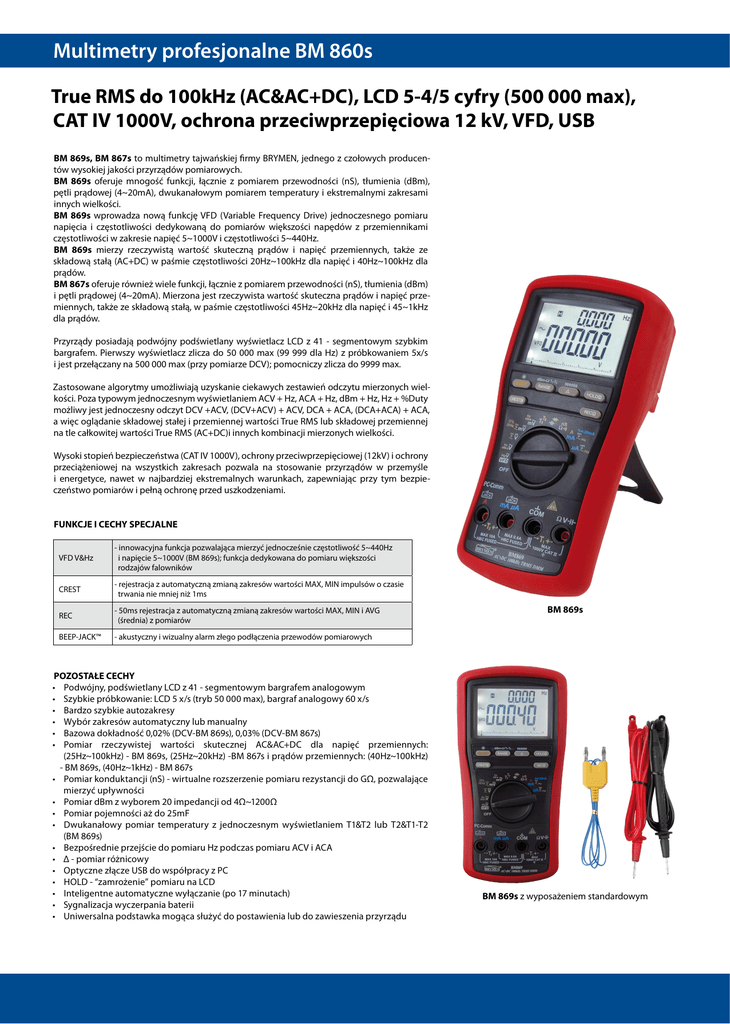 Multimetry profesjonalne BM 860s True RMS do 100kHz (AC&AC+DC), LCD 5-4/5 cyfry (500 000 max), CAT IV 1000V, ochrona przeciwprzepięciowa 12 kV, VFD, USB BM 869s, BM 867s to multimetry tajwańskiej firmy BRYMEN, jednego z czołowych producentów wysokiej jakości przyrządów pomiarowych. BM 869s oferuje mnogość funkcji, łącznie z pomiarem przewodności (nS), tłumienia (dBm), pętli prądowej (4~20mA), dwukanałowym pomiarem temperatury i ekstremalnymi zakresami innych wielkości. BM 869s wprowadza nową funkcję VFD (Variable Frequency Drive) jednoczesnego pomiaru napięcia i częstotliwości dedykowaną do pomiarów większości napędów z przemiennikami częstotliwości w zakresie napięć 5~1000V i częstotliwości 5~440Hz. BM 869s mierzy rzeczywistą wartość skuteczną prądów i napięć przemiennych, także ze składową stałą (AC+DC) w paśmie częstotliwości 20Hz~100kHz dla napięć i 40Hz~100kHz dla prądów. BM 867s oferuje również wiele funkcji, łącznie z pomiarem przewodności (nS), tłumienia (dBm) i pętli prądowej (4~20mA). Mierzona jest rzeczywista wartość skuteczna prądów i napięć przemiennych, także ze składową stałą, w paśmie częstotliwości 45Hz~20kHz dla napięć i 45~1kHz dla prądów. Przyrządy posiadają podwójny podświetlany wyświetlacz LCD z 41 - segmentowym szybkim bargrafem. Pierwszy wyświetlacz zlicza do 50 000 max (99 999 dla Hz) z próbkowaniem 5x/s i jest przełączany na 500 000 max (przy pomiarze DCV); pomocniczy zlicza do 9999 max. Zastosowane algorytmy umożliwiają uzyskanie ciekawych zestawień odczytu mierzonych wielkości. Poza typowym jednoczesnym wyświetlaniem ACV + Hz, ACA + Hz, dBm + Hz, Hz + %Duty możliwy jest jednoczesny odczyt DCV +ACV, (DCV+ACV) + ACV, DCA + ACA, (DCA+ACA) + ACA, a więc oglądanie składowej stałej i przemiennej wartości True RMS lub składowej przemiennej na tle całkowitej wartości True RMS (AC+DC)i innych kombinacji mierzonych wielkości. Wysoki stopień bezpieczeństwa (CAT IV 1000V), ochrony przeciwprzepięciowej (12kV) i ochrony przeciążeniowej na wszystkich zakresach pozwala na stosowanie przyrządów w przemyśle i energetyce, nawet w najbardziej ekstremalnych warunkach, zapewniając przy tym bezpieczeństwo pomiarów i pełną ochronę przed uszkodzeniami. FUNKCJE I CECHY SPECJALNE VFD V&Hz - innowacyjna funkcja pozwalająca mierzyć jednocześnie częstotliwość 5~440Hz i napięcie 5~1000V (BM 869s); funkcja dedykowana do pomiaru większości rodzajów falowników CREST - rejestracja z automatyczną zmianą zakresów wartości MAX, MIN impulsów o czasie trwania nie mniej niż 1ms REC - 50ms rejestracja z automatyczną zmianą zakresów wartości MAX, MIN i AVG (średnia) z pomiarów BEEP-JACK™ - akustyczny i wizualny alarm złego podłączenia przewodów pomiarowych POZOSTAŁE CECHY • Podwójny, podświetlany LCD z 41 - segmentowym bargrafem analogowym • Szybkie próbkowanie: LCD 5 x/s (tryb 50 000 max), bargraf analogowy 60 x/s • Bardzo szybkie autozakresy • Wybór zakresów automatyczny lub manualny • Bazowa dokładność 0,02% (DCV-BM 869s), 0,03% (DCV-BM 867s) • Pomiar rzeczywistej wartości skutecznej AC&AC+DC dla napięć przemiennych: (25Hz~100kHz) - BM 869s, (25Hz~20kHz) -BM 867s i prądów przemiennych: (40Hz~100kHz) - BM 869s, (40Hz~1kHz) - BM 867s • Pomiar konduktancji (nS) - wirtualne rozszerzenie pomiaru rezystancji do GΩ, pozwalające mierzyć upływności • Pomiar dBm z wyborem 20 impedancji od 4Ω~1200Ω • Pomiar pojemności aż do 25mF • Dwukanałowy pomiar temperatury z jednoczesnym wyświetlaniem T1&T2 lub T2&T1-T2 (BM 869s) • Bezpośrednie przejście do pomiaru Hz podczas pomiaru ACV i ACA • Δ - pomiar różnicowy • Optyczne złącze USB do współpracy z PC • HOLD - “zamrożenie” pomiaru na LCD • Inteligentne automatyczne wyłączanie (po 17 minutach) • Sygnalizacja wyczerpania baterii • Uniwersalna podstawka mogąca służyć do postawienia lub do zawieszenia przyrządu BM 869s BM 869s z wyposażeniem standardowym Multimetry profesjonalne BM 860s - dane techniczne DC DC Nazwa / nr kat. 500,00mV 0,02% + 2 DCV ACV True RMS SPECYFIKACJA ELEKTRYCZNA ACV ACV & ACV+DCV DCV True RMS 5,0000V 0,02% + 2 BM 867s [102093] 50,000V 0,03% + 2 500,00V 0,04% + 2 1000,0V*) 0,15% + 2 1000,0V niespec. 0,5% + 40 0,8% + 40 niespec. niespec. 25~45Hz 45~300Hz 300~1kHz 1k~20kHz 20k~100kHz 500,00mV niespec. 0,8% + 60 0,8% + 40 1dB niespec. 5,0000V niespec. 0,8% + 60 2,0% + 60 2dB niespec. 50,000V niespec. 0,8% + 60 2,0% + 60 2dB niespec. 500,00V niespec. 0,8% + 60 2,0% + 60 3dB niespec. 1000,0V niespec. 0,8% + 60 1,0% + 40 niespec. niespec. 25~45Hz 45~300Hz 300Hz~5kHz 5k~20kHz 20k~40kHz 500,00mV 1,5% + 40 0,45% + 40 0,8% + 40 1,0% + 40 3,5% + 40 5,0000V 1,5% + 40 0,7% + 80 0,8% + 40 1,5% + 40 4,0% + 40 50,000V 1,5% + 40 0,7% + 80 0,8% + 40 1,5% + 40 4,0% + 40 500,00V niespec. 0,7% + 40 0,8% + 40 1,5% + 40 niespec. 1000,0V*) niespec. 0,7% + 40 1,0% + 40 niespec. niespec. 25~45Hz DC, 45~300Hz 300~1kHz 1k~20kHz 20k~40kHz 500,00mV niespec. 0,8% + 60 0,8% + 40 1dB niespec. 5,0000V niespec. 0,8% + 60 2,0% + 60 2dB niespec. 50,000V niespec. 0,8% + 60 2,0% + 60 2dB niespec. 500,00V niespec. 0,8% + 60 2,0% + 60 3dB niespec. 1000,0V*) niespec. 0,8% + 60 2,0% + 60 niespec. niespec. 50,000mA 0,15% + 20 500,00mA 0,15% + 30 5000,0µA 0,10% + 20 DC, 50/60Hz 40Hz~1kHz 1k~20kHz 20k~100kHz 0,7% + 50 0,7% + 50 0,7% + 50 0,7% + 50 0,7% + 50 0,7% + 50 2,0% + 50 2,0% + 50 2,0% + 50 2,0% + 50 niespecyfikowane 5,0% + 50 5,0% + 50 5,0% + 50 5,0% + 50 niespecyfikowane 500,00Ω 5,0000kΩ 50,000kΩ 500,00kΩ 5,0000MΩ 50,000MΩ 0,1% + 10 0,1% + 6 0,1% + 6 0,1% + 6 0,4% + 6 2% + 6 500,0nF 0,8% + 3 99,99nS 2% +10 5,000μF 1,5% + 3 10,00A**) 0,5% + 20 500,00µA 5000,0µA 50,000mA 500,00mA 5,0000A 10,00A**) DC, 50/60Hz 1,0% + 40 1,0% + 40 1,0% + 40 1,0% + 40 1,0% + 40 1,0% + 40 40Hz~1kHz 1,0% + 40 1,0% + 40 1,0% + 40 1,0% + 40 1,0% + 40 1,0% + 40 1k~20kHz niespecy