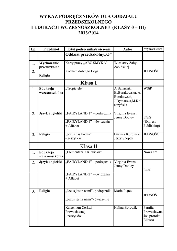 WYKAZ PODRĘCZNIKÓW DLA ODDZIAŁU PRZEDSZKOLNEGO I EDUKACJI WCZESNOSZKOLNEJ (KLASY 0 – III) 2013/2014 Lp. Przedmiot Tytuł podręcznika/ćwiczenia Autor Wydawnictwo Oddział przedszkolny„O” 1. Wychowanie Karty pracy „ABC SMYKA” przedszkolne Wiesławy ŻabyŻabińskiej Kocham dobrego Boga 2. JEDNOŚĆ Religia Klasa I 1. Edukacja „Tropiciele” wczesnoszkolna A.Banasiak, WSiP E..Burakowska, A. Burakowski, J.Dymarska,M.Koł aczyńska 2. Język angielski „FAIRYLAND 1” – podręcznik Virginia Evans, Jenny Dooley „FAIRYLAND 1” – ćwiczenia + Alfabet 3. Religia „Jezus nas kocha” - zeszyt ćw. EGiS (Express Publishing) Dariusz Kurpiński, JEDNOŚĆ Jerzy Snopek Klasa II 1. Edukacja „Elementarz XXI wieku” Nowa era wczesnoszkolna 2. Język angielski „FAIRYLAND 1” – podręcznik Virginia Evans, Jenny Dooley EGiS „FAIRYLAND 2” – ćwiczenia + Alfabet 3. Religia „Jezus jest z nami”- podręcznik Maria Piątek JEDNOŚ „Jezus jest z nami”- ćwiczenie Katechizm Cerkwi Prawosławnej - zeszyt ćw. Halina Borowik Parafia Prawosławna św. proroka Eliasza Klasa III 1. Edukacja „Nasza Klasa” wczesnoszkolna 2. Język angielski 3. Religia A. Baścik-Kołek Cz. Cyrański B. Piechocińska „NEW SPARKS PLUS 3”podręcznik M. Szpotowicz M. Szulc-Kurpalska „NEW SPARKS PLUS 3”ćwiczenie M. Charington „Wzrastamy w przyjaźni z Jezusem”- podręcznik „Wzrastamy w przyjaźni z Jezusem”- ćwiczenie Katechizm Cerkwi Prawosławnej - zeszyt ćw. MAC OXFORD JEDNOŚĆ Halina Borowik Parafia Prawosławna św. proroka Eliasza WYKAZ PODRĘCZNIKÓW OBOWIĄZUJĄCYCH W KLASIE IV W ROKU SZKOLNYM 2013/2014 L.p. Przedmiot Tytuł podręcznika/ćwiczenia 1. Język polski „Jutro pójdę w świat”- podręcznik Wyd. z 2012 r. „Jutro pójdę w świat”- ćwiczenia Wyd. z 2012 r. „Słowa na start” podręcznik do kształcenia językowego Cz. I i II -stare 2. Język angielski 3. Historia i społeczeństwo 4. Matematyka „STARLAND 1” – podręcznik „STARLAND 1” – ćwiczenia „Wczoraj i dziś 4”- podręcznik „Zeszyt ucznia”- ćwiczenia Autor Hanna Dobrowolska Urszula Dobrowolska Hanna Dobrowolska Urszula Dobrowolska D. Chwastniewska A.Gorzałczyńska— Mróz D. Rożek Virginia Evans, Jenny Dooley Grzegorz Wojciechowski Wydawnic two WSiP WSiP Nowa Era EGiS Nowa Era „Matematyka z kluczem” cz. 1 i 2 - Marcin Braun Nowa Era Agnieszka podręcznik Mańkowska „Matematyka z kluczem” cz. 1 i 2 - Małgorzata Paszyńska ćwiczenia 5. Przyroda 6. Religia 7. Zajęcia techniczne 8. Informatyka 9. Muzyka 10. Plastyka „Na tropach przyrody”- podręcznik Marcin Braun z płytą CD Wojciech Grajkowski Nowa Era + atlas do przyrody Marek Więckowski „Na tropach przyrody”- ćwiczenia Atlas. Przyroda „Świat wokół nas” -nowy Wyd. „Słuchamy Boga” JEDNOŚĆ „Jak to działa” - podręcznik z Lech Łabedzki ćwiczeniami do zajęć technicznych Marta Łabecka dla klas 4-6 „Lubię to ”- podręcznik M.Kęska multimedialny do zajęć komputerowych do kl. IV-VI „I gra muzyka” G. Klibach Wyd. z 2012 M. Gromek „Do dzieła”-podręcznik do plastyki J. Lukas dla kl. IV-VI K. Onak Nowa Era Nowa Era Nowa Era Nowa Era WYKAZ PODRĘCZNIKÓW OBOWIĄZUJĄCYCH W KLASIE V W ROKU SZKOLNYM 2013/2014 Lp. 1. Przedmiot Język polski 2. Język angielski 3. Historia i społeczeństwo 4. Matematyka 5. Przyroda 6. Religia 7. Muzyka 8. Plastyka 9. 10. Informatyka Technuka Tytuł podręcznika/ćwiczenia „Jutro pójdę w świat”podręcznik „Jutro pójdę w świat”ćwiczenia „Słowa na start” podręcznik do nauki o języku z ćwiczeniami cz. I i II „STARLAND 2” – podręcznik „STARLAND 2” – ćwiczenia „Wczoraj i dziś 5”- podręcznik „Zeszyt ucznia”- ćwiczenia „Matematyka z kluczem” cz. 1 i 2 - podręcznik „Matematyka z kluczem” cz. 1 i 2 - ćwiczenia „Na tropach przyrody”podręcznik z płytą CD + atlas do przyrody „Na tropach przyrody”- ćw. Atlas. Przyroda „Świat wokół nas” - nowy „Wielbimy Boga”- podręcznik Katechizm Cerkwi Prawosławnej „I gra muzyka” Wyd. z 2012 „Do dzieła”-podręcznik do plastyki dla kl. IV-VI „Lubię to ”- podręcznik multimedialny do zajęć komputerowych do kl. IV-VI „Jak to działa” - podręcznik z ćwiczeniami do zajęć technicznych dla klas 4-6 Autor Wydawnictwo Hanna Dobrowolska WSiP D.Rożek, D.Chwastniewska Nowa Era Virginia Evans, Jenny Dooley Grzegorz Wojciechowski Marcin Braun Agnieszka Mańkowska Małgorzata Paszyńska Marcin Braun Wojciech Grajkowski Marek Więckowski EGiS Nowa Era Nowa Era Nowa Era JEDNOŚĆ Halina Borowik Parafia Prawosławna św. proroka Eliasza G. Klibach M. Gromek Nowa Era J. Lukas K. Onak Michał Kęska Nowa Era Nowa Era Lech Łabedzki Marta Łabecka Nowa Era WYKAZ PODRĘCZNIKÓW OBOWIĄZUJĄCYCH W KLASIE VI W ROKU SZKOLNYM 2013/2014 Lp. 1. Przedmiot Język polski 2. Język angielski 3. Historia i społeczeńst wo 4. Matematyka 5. Przyroda 6. Religia Tytuł podręcznika/ćwiczenia „Jutro pójdę w świat”- podręcznik „Jutro pójdę w świat”- ćwiczenia „Słowa na start” podręcznik do nauki o języku z ćwiczeniami cz. I i II „WINNERS PLUS 3” – podręcznik „WINNERS PLUS 3” – ćwiczenia Autor Hanna Dobrowolska WSiP D.Rożek, D.Chwastniewska Nowa Era Cathy Lawdaj Mark Hancock Lindsay White Cathy Lawdaj Mark Hancock „Moja historia 6”- podręcznik cz. I Michał Błaut Marek Szymański i cz. II „Moja historia”- ćwiczenia cz I i II Małgorzata Dobrowolska „Matematyka 6” – podręcznik M. Jucewicz (Nowa wersja) M. Karpiński „Matematyka 6”– ćw. liczby i Piotr Zarzycki wyrażenia algebraiczne cz.I i II (Nowa wersja) „Matematyka 6”– ćw.- geometria M. Braun Kalendarz szóstoklasisty „Przyrodo witaj”- podręcznik „Przyrodo witaj”- ćwiczenia Dowolny atlas do przyrody „Z Jezusem idziemy do Boga” Katechizm Cerkwi Prawosławnej Wydawnictwo Wawrzyniec Kofta Ewa Kłos Ewa Laskowska E