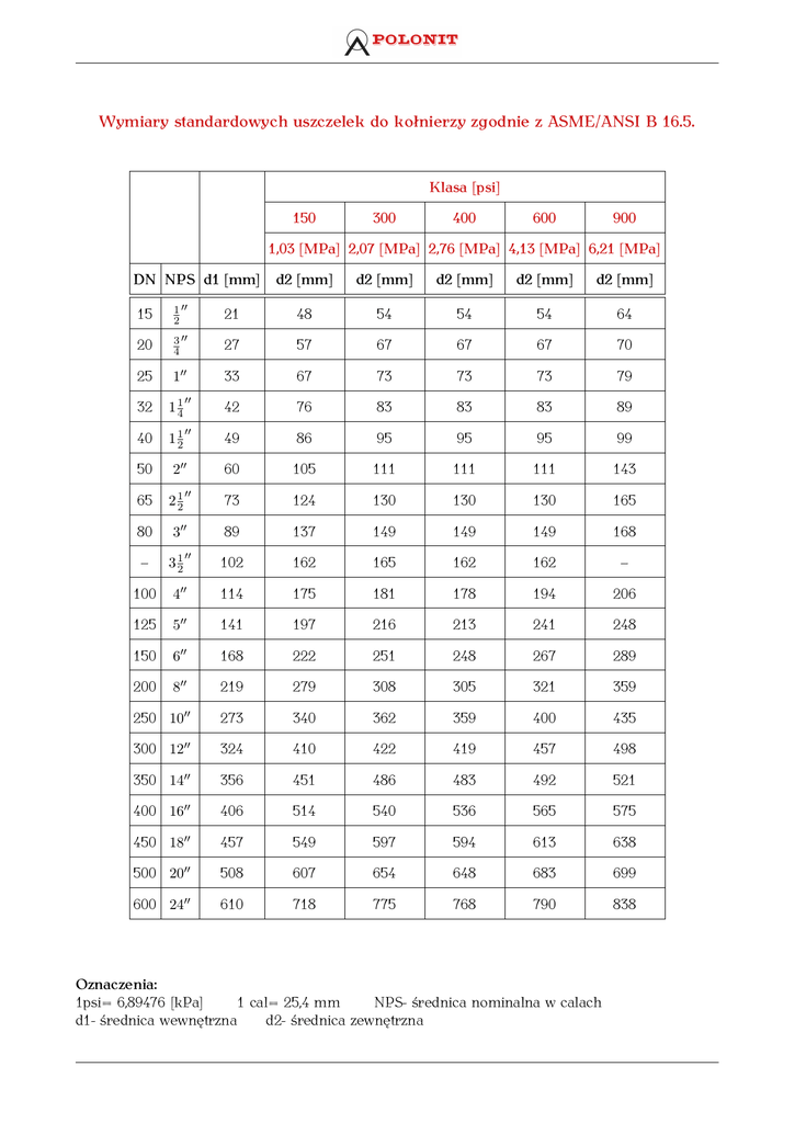 Wymiary standardowych uszczelek do kołnierzy zgodnie z ASME/ANSI B 16.5. Klasa [psi] 150 300 400 600 900 1,03 [MPa] 2,07 [MPa] 2,76 [MPa] 4,13 [MPa] 6,21 [MPa] DN NPS d1 [mm] d2 [mm] d2 [mm] d2 [mm] d2 [mm] d2 [mm] 15 1 00 2 21 48 54 54 54 64 20 3 00 4 27 57 67 67 67 70 25 100 33 67 73 73 73 79 32 1 14 00 42 76 83 83 83 89 40 1 12 00 49 86 95 95 95 99 50 200 60 105 111 111 111 143 65 2 12 73 124 130 130 130 165 80 300 89 137 149 149 149 168 – 3 12 102 162 165 162 162 – 100 400 114 175 181 178 194 206 125 500 141 197 216 213 241 248 150 600 168 222 251 248 267 289 200 800 219 279 308 305 321 359 250 1000 273 340 362 359 400 435 300 1200 324 410 422 419 457 498 350 1400 356 451 486 483 492 521 400 1600 406 514 540 536 565 575 450 1800 457 549 597 594 613 638 500 2000 508 607 654 648 683 699 600 2400 610 718 775 768 790 838 00 00 Oznaczenia: 1psi= 6,89476 [kPa] 1 cal= 25,4 mm NPS- średnica nominalna w calach d1- średnica wewnętrzna d2- średnica zewnętrzna