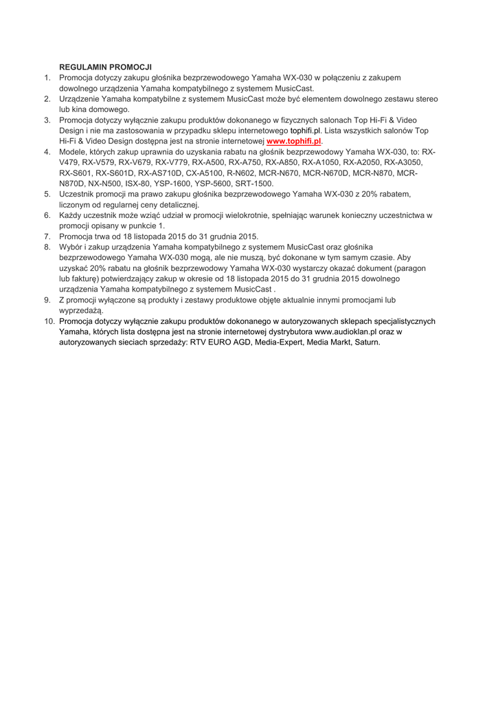 REGULAMIN PROMOCJI 1. Promocja dotyczy zakupu głośnika bezprzewodowego Yamaha WX-030 w połączeniu z zakupem dowolnego urządzenia Yamaha kompatybilnego z systemem MusicCast. 2. Urządzenie Yamaha kompatybilne z systemem MusicCast może być elementem dowolnego zestawu stereo lub kina domowego. 3. Promocja dotyczy wyłącznie zakupu produktów dokonanego w fizycznych salonach Top Hi-Fi & Video Design i nie ma zastosowania w przypadku sklepu internetowego tophifi.pl. Lista wszystkich salonów Top Hi-Fi & Video Design dostępna jest na stronie internetowej www.tophifi.pl. 4. Modele, których zakup uprawnia do uzyskania rabatu na głośnik bezprzewodowy Yamaha WX-030, to: RXV479, RX-V579, RX-V679, RX-V779, RX-A500, RX-A750, RX-A850, RX-A1050, RX-A2050, RX-A3050, RX-S601, RX-S601D, RX-AS710D, CX-A5100, R-N602, MCR-N670, MCR-N670D, MCR-N870, MCRN870D, NX-N500, ISX-80, YSP-1600, YSP-5600, SRT-1500. 5. Uczestnik promocji ma prawo zakupu głośnika bezprzewodowego Yamaha WX-030 z 20% rabatem, liczonym od regularnej ceny detalicznej. 6. Każdy uczestnik może wziąć udział w promocji wielokrotnie, spełniając warunek konieczny uczestnictwa w promocji opisany w punkcie 1. 7. Promocja trwa od 18 listopada 2015 do 31 grudnia 2015. 8. Wybór i zakup urządzenia Yamaha kompatybilnego z systemem MusicCast oraz głośnika bezprzewodowego Yamaha WX-030 mogą, ale nie muszą, być dokonane w tym samym czasie. Aby uzyskać 20% rabatu na głośnik bezprzewodowy Yamaha WX-030 wystarczy okazać dokument (paragon lub fakturę) potwierdzający zakup w okresie od 18 listopada 2015 do 31 grudnia 2015 dowolnego urządzenia Yamaha kompatybilnego z systemem MusicCast . 9. Z promocji wyłączone są produkty i zestawy produktowe objęte aktualnie innymi promocjami lub wyprzedażą. 10. Promocja dotyczy wyłącznie zakupu produktów dokonanego w autoryzowanych sklepach specjalistycznych Yamaha, których lista dostępna jest na stronie internetowej dystrybutora www.audioklan.pl oraz w autoryzowanych sieciach sprzedaży: RTV EURO AGD, Media-Expert, Media Markt, Saturn.