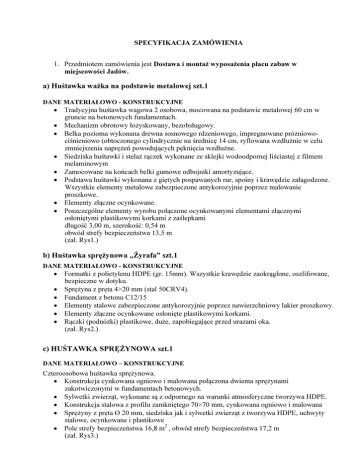 SPECYFIKACJA ZAMÓWIENIA 1. Przedmiotem zamówienia jest Dostawa i montaż wyposażenia placu zabaw w miejscowości Jadów. a) Huśtawka ważka na podstawie metalowej szt.1 DANE MATERIAŁOWO - KONSTRUKCYJNE • Tradycyjna huśtawka wagowa 2 osobowa, mocowana na podstawie metalowej 60 cm w gruncie na betonowych fundamentach. • Mechanizm obrotowy łożyskowany, bezobsługowy. • Belka pozioma wykonana drewna sosnowego rdzeniowego, impregnowane próżniowociśnieniowo (obtoczonego cylindrycznie na średnicę 14 cm, ryflowana wzdłużnie w celu zmniejszenia naprężeń powodujących pęknięcia wzdłużne. • Siedziska huśtawki i stelaż rączek wykonane ze sklejki wodoodpornej liściastej z filmem melaminowym • Zamocowane na końcach belki gumowe odbojniki amortyzujące. • Podstawa huśtawki wykonana z giętych pospawanych rur, spoiny i krawędzie załagodzone. Wszystkie elementy metalowe zabezpieczone antykorozyjnie poprzez malowanie proszkowe. • Elementy złączne ocynkowane. • Poszczególne elementy wyrobu połączone ocynkowanymi elementami złącznymi osłoniętymi plastikowymi korkami z zaślepkami długość 3,00 m, szerokość: 0,54 m obwód strefy bezpieczeństwa 13,5 m (zał. Rys1.) b) Huśtawka sprężynowa „Żyrafa” szt.1 DANE MATERIAŁOWO - KONSTRUKCYJNE • Formatki z polietylenu HDPE (gr. 15mm). Wszystkie krawędzie zaokrąglone, oszlifowane, bezpieczne w dotyku. • Sprężyna z pręta 4>20 mm (stal 50CRV4). • Fundament z betonu C12/15 • Elementy stalowe zabezpieczone antykorozyjnie poprzez nawierzchniowy lakier proszkowy. • Elementy złączne ocynkowane osłonięte plastikowymi korkami. • Rączki (podnóżki) plastikowe, duże, zapobiegające przed urazami oka. (zał. Rys2.) c) HUŚTAWKA SPRĘŻYNOWA szt.1 DANE MATERIAŁOWO – KONSTRUKCYJNE Czteroosobowa huśtawka sprężynowa. • Konstrukcja cynkowana ogniowo i malowana połączona dwiema sprężynami zakotwiczonymi w fundamentach betonowych. • Sylwetki zwierząt, wykonane są z odpornego na warunki atmosferyczne tworzywa HDPE. • Konstrukcja stalowa z profilu zamkniętego 70×70 mm, cynkowana ogniowo i malowana • Sprężyny z pręta Ø 20 mm, siedziska jak i sylwetki zwierząt z tworzywa HDPE, uchwyty stalowe, ocynkowane i plastikowe • Pole strefy bezpieczeństwa 16,8 m2 , obwód strefy bezpieczeństwa 17,2 m (zał. Rys3.) d) Huśtawka sprężynowa „ Biedronka” szt.1 DANE MATERIAŁOWO – KONSTRUKCYJNE Huśtawka sprężynowa jednoosobowa o kształcie biedronki. • Konstrukcja malowana, wykonana z tworzywa HDPE odpornego na warunki atmosferyczne połączona stelażem ze sprężyną przytwierdzoną do prefabrykatu betonowego. • Sprężyna z pręta Ø 20 mm, boki wykonane z tworzywa HDPE, połączone z metalowym stelażem uchwyt z rury Ø 21 mm, nierdzewnej, siedzisko z tworzywa HDPE (zał. Rys4.) e) Karuzela z czterema ramionami szt.1 DANE MATERIAŁOWO – KONSTRUKCYJNE Karuzela z czterema ramionami, z gumowanymi siedziskami, wyposażonymi w oparcia. konstrukcja słupa i ramion z rur Ø 114 i 76 mm oparcia siedzisk z rury Ø 27 mm zastosowano łożyska toczne siedziska gumowane, atestowane talerz napędowy umożliwiający obrót karuzelą wykonany ze stali nierdzewnej. Elementy wykonane ze stali zabezpieczone antykorozyjnie lakierem proszkowym poliestrowym do warunków zewnętrznych. • Wymiary Długość 1,5: Szerokość 1,5; Wysokość 0,85 (zał. Rys5.) • • • • • • Wykonanie i montaż z zachowaniem norm PN-EN 1176:2009 W cenie należy uwzględnić koszt dostawy i montażu. Montaż nastąpi w miejscowości Jadów Gmina Jadów. 2. Zamawiający nie dopuszcza składania ofert częściowych. 3. Zamawiający nie dopuszcza składania ofert wariantowych. 4. Termin wykonania przedmiotu zamówienia – do 31 października 2014 r. 5. Warunki udziału w postępowaniu – złożenie dokumentów wymienionych w pkt. 6 specyfikacji. 6. Dokumenty, jakie mają dostarczyć wykonawcy: a) wypełniony druk „Oferta”, stanowiący załącznik nr 1 do niniejszej specyfikacji. 7. Pracownikiem zamawiającego uprawnionym do bezpośredniego kontaktowania się z wykonawcami jest: Pobudkiewicz Patryk – pokój nr 17, tel. (25) 675 40 44 wew. 47 8. Oferty należy dostarczyć w terminie do dnia 06.10.2014 r. godz.1500. Oferty powinny być dostarczone faksem na nr (25) 675 43 84, przesyłką pocztową lub osobiście. 9. Sposób obliczania ceny: cenę należy podać w formie ryczałtu, którego definicję określa art. 632 kodeksu cywilnego. 10. Rozliczenia pomiędzy zamawiającym a przyszłym wykonawcą odbywać będą się w złotych polskich. Dane Gminy Jadów do faktury: Gmina Jadów, ul. Jana Pawła II 17, 05-280 Jadów, Nr NIP 125-13-34-791. Płatność dokonana będzie w ciągu 14 dni na podstawie złożonej faktury na konto bankowe Wykonawcy po stwierdzeniu prawidłowości wykonania zamówienia przez odpowiedzialnego pracownika UG Jadów. 11. Kryterium wyboru oferty najkorzystniejszej będzie cena – 100%. 12. Z Wykonawcą, który złoży najkorzystniejszą ofertę zostanie podpisana umowa. 13. Postępowanie prowadzone jest na podstawie Zarządzenia nr 7/2009 Wójta Gminy Jadów z dnia 23 stycznia 2009 r. w sprawie wprowadzenia regulaminu udzielania zamówień publicznych o wartości nieprzekraczającej kwoty wyrażonej w złotych równowartości 14 000 euro netto.(30 000 tys. po zmianie ustawy). Jadów, 26 września 2014 r.