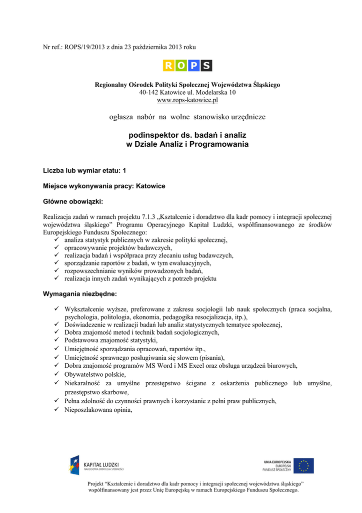 Nr ref.: ROPS/19/2013 z dnia 23 października 2013 roku Regionalny Ośrodek Polityki Społecznej Województwa Śląskiego 40-142 Katowice ul. Modelarska 10 www.rops-katowice.pl ogłasza nabór na wolne stanowisko urzędnicze podinspektor ds. badań i analiz w Dziale Analiz i Programowania Liczba lub wymiar etatu: 1 Miejsce wykonywania pracy: Katowice Główne obowiązki: Realizacja zadań w ramach projektu 7.1.3 „Kształcenie i doradztwo dla kadr pomocy i integracji społecznej województwa śląskiego” Programu Operacyjnego Kapitał Ludzki, współfinansowanego ze środków Europejskiego Funduszu Społecznego: analiza statystyk publicznych w zakresie polityki społecznej, opracowywanie projektów badawczych, realizacja badań i współpraca przy zlecaniu usług badawczych, sporządzanie raportów z badań, w tym ewaluacyjnych, rozpowszechnianie wyników prowadzonych badań, realizacja innych zadań wynikających z potrzeb projektu Wymagania niezbędne: Wykształcenie wyższe, preferowane z zakresu socjologii lub nauk społecznych (praca socjalna, psychologia, politologia, ekonomia, pedagogika resocjalizacja, itp.), Doświadczenie w realizacji badań lub analiz statystycznych tematyce społecznej, Dobra znajomość metod i technik badań socjologicznych, Podstawowa znajomość statystyki, Umiejętność sporządzania opracowań, raportów itp., Umiejętność sprawnego posługiwania się słowem (pisania), Dobra znajomość programów MS Word i MS Excel oraz obsługa urządzeń biurowych, Obywatelstwo polskie, Niekaralność za umyślne przestępstwo ścigane z oskarżenia publicznego lub umyślne, przestępstwo skarbowe, Pełna zdolność do czynności prawnych i korzystanie z pełni praw publicznych, Nieposzlakowana opinia, Projekt “Kształcenie i doradztwo dla kadr pomocy i integracji społecznej województwa śląskiego” współfinansowany jest przez Unię Europejską w ramach Europejskiego Funduszu Społecznego. Wymagania dodatkowe: Znajomość przepisów ustawy z dnia 12 marca 2004 roku o pomocy społecznej dotyczących zadań własnych i zleconych samorządu województwa (tj. DzU.2013 poz.182 ze zm), Znajomość treści Statutu Regionalnego Ośrodka Polityki Społecznej Województwa Śląskiego www.bip.slaskie.pl/jednostki/dokumenty/197/1322056280.pdf Znajomość zagadnień z zakresu polityki społecznej województwa śląskiego na podstawie dokumentu Strategii Polityki Społecznej Województwa Śląskiego na lata 2006-2020 www.rops-katowice.pl/sites/default/filesimages/startpolspo.pdf Znajomość zagadnień dotyczących pomocy i integracji społecznej, zawartych w priorytecie VII, poddziałaniu 7.1 Programu Operacyjnego Kapitał Ludzki 2007-2013, dostępnych w: http://efs.slaskie.pl/zalaczniki/2011/12/30/1325230135.pdf (dok. programowy) http://efs.slaskie.pl/zalaczniki/2013/07/05/1373007863.pdf (opis szczegółowy) http://efs.slaskie.pl/zalaczniki/2013/01/04/1357298270.pdf (zasady realizacji) Umiejętności osobiste: Dobra organizacja pracy, Sumienność i dokładność, Wymagane dokumenty i oświadczenia: List motywacyjny, Życiorys, Kwestionariusz osobowy osoby ubiegającej się o zatrudnienie, Kserokopie dokumentów potwierdzających posiadane wykształcenie, Kserokopie dokumentów potwierdzających ukończenie dodatkowych kursów, szkoleń, Oświadczenie o posiadaniu pełnej zdolności do czynności prawnych i korzystaniu z pełni praw publicznych, Oświadczenie o niekaralności za umyślne przestępstwo ścigane z oskarżenia publicznego lub umyślne przestępstwo skarbowe, Oświadczenie o wyrażeniu zgody na przetwarzanie danych osobowych, Oświadczenie o zgodności kopii dokumentów aplikacyjnych z oryginałem, Inne dokumenty, które kandydat uzna za istotne (np. opinie, referencje), Kopia dokumentu potwierdzającego niepełnosprawność (w przypadku, gdy kandydat zamierza skorzystać z uprawnienia, o którym mowa w art. 13a ust. 2 ustawy o pracownikach samorządowych), Kwestionariusz osobowy i oświadczenia osoby ubiegającej się o zatrudnienie – do pobrania ze strony internetowej http://rops-katowice.pl/rops-do-pobrania. Składanie dokumentów aplikacyjnych: • Termin składania ofert: do 15 listopada 2013 roku, Projekt “Kształcenie i doradztwo dla kadr pomocy i integracji społecznej województwa śląskiego” współfinansowany jest przez Unię Europejską w ramach Europejskiego Funduszu Społecznego. • Dokumenty aplikacyjne w zamkniętych kopertach z podanym adresem zwrotnym i dopiskiem „dotyczy naboru na stanowisko urzędnicze nr ref.: ROPS/19/2013 z dnia 23 października 2013 roku” należy przesłać na adres: Regionalny Ośrodek Polityki Społecznej Województwa Śląskiego ul. Modelarska 10 40-142 Katowice lub złożyć: w kancelarii ROPS (pokój nr 111). Warunki pracy na stanowisku: Budynek jest dostosowany do potrzeb osób niepełnosprawnych. Inne informacje: W miesiącu poprzedzającym datę upublicznienia niniejszego ogłoszenia o naborze, wskaźnik zatrudnienia osób niepełnosprawnych w jednostce, w rozumieniu przepisów o rehabilitacji zawodowej i społecznej oraz zatrudnianiu osób niepełnosprawnych, był niższy niż 6%, Oferty otrzymane po terminie nie będą rozpatrywane (liczy się data stempla pocztowego), Osoby spełniające wymogi formalne zostaną indywidualnie poinformowane o terminie i miejscu postępowania rekrutacyjnego, Informacja o wyniku naboru będzie umieszczona w Biuletynie Informacji Publicznej oraz na tablicy informacyjnej Regionalnego Ośrodka Polityki Społecznej Województwa Śląskiego, Złożonych ofert nie odsyłamy, a nieodebrane po 3 miesiącach od dnia zakończenia procedury naboru podlegają zniszczeniu, Dodatkowe informacje można uzyskać pod numerem telefonu 32 730 68 84 lub 32 730 68 85 Projekt “Kształcenie i doradztwo dla kadr pomocy i integracji społecznej województwa śląskiego” współfinansowany jest przez Unię Europejską w ramach Europejskiego Funduszu Społecznego.