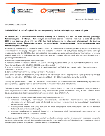Warszawa, 26 sierpnia 2013 r. INFORMACJA PRASOWA GAZ-SYSTEM S.A. zakończył odbiory rur na potrzeby budowy strategicznych gazociągów 23 sierpnia 2013 r. przeprowadzono ostatnią dostawę rur o średnicy 700 mm na teren budowy gazociągu Rembelszczyzna - Gustorzyn. Tym samym zrealizowana została umowa ramowa z dnia 26 stycznia 2011 r. na dostawy około 890 km (184 tys. ton) izolowanych rur stalowych niezbędnych do budowy gazociągów relacji: Świnoujście-Szczecin, Szczecin-Gdańsk, Szczecin-Lwówek, Gustorzyn-Odolanów oraz Rembelszczyzna-Gustorzyn. W realizacji strategicznych projektów GAZ-SYSTEM S.A. zastosował odmienną praktykę niż podczas realizacji wcześniejszych inwestycji. Polegała ona na znacznie większym niż dotychczas zaangażowaniu samego inwestora. Spółka GAZ-SYSTEM S.A. samodzielnie zorganizowała przetargi na zakup rur i armatury, w wyniku których podpisała z Wykonawcami umowy ramowe na dostawę niezbędnych do budowy strategicznych gazociągów materiałów. Wykonawcy wybrani w publicznym przetargu: 1. Konsorcjum firm w składzie: FERRUM S.A. (Lider Konsorcjum); STEELTUBES Sp. z o.o.; UNISET Rury Stalowe-Steel Pipes Janusz Gaczyński; U.S. STEEL KOSICE s.r.o., (Słowacja). 2. Konsorcjum firm w składzie: IZOSTAL S.A. (Lider Konsorcjum); IMPEXRUR S.A.; ArcelorMittal Tubular Products Ostrava a.s. (Czechy). 3. Borusan Mannesmann Boru Sanayi ve Ticaret A.S.(Turcja) przez okres dwóch lat zrealizowali, na podstawie 17 odrębnych umów cząstkowych, łączną dostawę 889 535 metrów rur o średnicy DN 700 ze stali w gatunku L485MB i DN 800 mm ze stali w gatunku L555MB. Umowy te spółka GAZ-SYSTEM S.A. zawierała każdorazowo po zaakceptowaniu najkorzystniejszej oferty dla danej partii rur. Łączna wartość zawartych umów wynosi netto ok. 835 mln złotych. Odbiory dostaw inwestorskich rur w miejscach ich produkcji oraz na placach składowych, przygotowanych przez Wykonawców robót budowlanych, były dokonywane przez inspektorów firmy Bureau Veritas Polska Sp. z o.o. oraz odpowiednio przeszkolonych pracowników GAZ-SYSTEM S.A. Przyjęcie formuły dostaw inwestorskich w szczególności pozwoliło na: • ustalenie jednolitych, najwyższych jakościowych, standardów technicznych GAZ-SYSTEM S.A. dotyczących rur stalowych oraz ich izolacji zewnętrznej i wewnętrznej gwarantujących bezpieczną pracę gazociągów, • wykorzystanie efektu skali przy zakupie rur oraz osiągnięcie konkurencyjnych cen rur w ramach kolejnych zamówień cząstkowych, • znaczne przyśpieszenie realizacji inwestycji - wykonawca robót budowlanych otrzymywał rury od inwestora od razu po podpisaniu umowy. Przejęcie przez GAZ-SYSTEM S.A. finansowania inwestycji w zakresie dostaw inwestorskich znacząco wpłynęło także na polepszenie sytuacji finansowej wykonawców poszczególnych robót budowlanych, ponieważ nie byli oni obciążeni ryzkiem związanym z cenami zakupu rur i armatury. Zastosowanie metody dostaw inwestorskich jest istotnym elementem projektów infrastrukturalnych realizowanych przez GAZ-SYSTEM S.A. Intencją spółki przy wprowadzeniu nowej organizacji procesu inwestycyjnego było lepsze zarządzanie projektami, uzyskanie dodatkowych oszczędności wynikających z dużej skali zakupów oraz znaczne ograniczenie ryzyka. Nowy sposób realizacji inwestycji w trybie dostaw inwestorskich wymagał także dużego nakładu pracy i zaangażowania profesjonalnego zespołu. W przypadku realizacji kolejnych inwestycji strategicznych planowane jest zastosowanie tego samego schematu postępowania polegającego na rozdzieleniu umowy wykonawczej od umowy na dostawę rur i armatury. Do końca 2014 roku GAZ-SYSTEM S.A. zakończy budowę 1000 km nowych gazociągów przesyłowych wysokiego ciśnienia, na których finansowanie przeznaczy ok. 8 mld złotych. *** Operator Gazociągów Przesyłowych GAZ-SYSTEM S.A. jest spółką strategiczną dla polskiej gospodarki, odpowiedzialną za przesył gazu ziemnego oraz zarządzanie najważniejszymi gazociągami w Polsce. Do 2014 r. GAZ-SYSTEM S.A. wybuduje ponad 1000 km nowych gazociągów przesyłowych. Najważniejsze z nich powstaną w północno-zachodniej i środkowej Polsce. Rozbudowa sieci gazociągów może stanowić ważny element Korytarza Gazowego Północ-Południe łączącego terminal LNG w Świnoujściu z planowanym terminalem LNG w Chorwacji poprzez infrastrukturę przesyłową krajów Europy Środkowej. Inwestycje zrealizowane przez GAZ-SYSTEM S.A. oraz usługa wirtualnego rewersu na gazociągu jamalskim pozwoliły na istotne poprawienie bezpieczeństwa energetycznego Polski, poprzez zwiększenie technicznych możliwości importowych z kierunku innego niż wschodni do 43% realizowanego importu (do 2011 r. było to 9%). Kontakt: Małgorzata Polkowska Rzecznik Prasowy GAZ-SYSTEM S.A. tel. 22 220 15 46, tel. kom. 691 911 217 e-mail: [email protected] 2