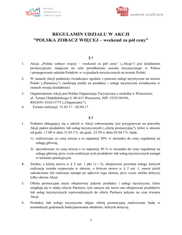 REGULAMIN UDZIAŁU W AKCJI ”POLSKA ZOBACZ WIĘCEJ – weekend za pół ceny” §1 1. Akcja „Polska zobacz więcej – weekend za pół ceny” („Akcja”) jest działaniem promocyjnym, mającym na celu przedłużenie sezonu turystycznego w Polsce i propagowanie udziału Polaków w wyjazdach turystycznych na terenie Polski. 2. W ramach Akcji podmioty świadczące zgodnie z prawem usługi turystyczne na terenie Polski („Partnerzy”) zaoferują zniżki na produkty i usługi turystyczne świadczone w ramach swojej działalności. 3. Organizatorem Akcji jest Polska Organizacja Turystyczna z siedzibą w Warszawie, ul. Tytusa Chałubińskiego 8, 00-613 Warszawa, NIP: 5252150196, REGON: 016213775 („Organizator”). Termin realizacji: 31.03.17 - 02.04.17 4. §2 1. Podmiot ubiegający się o udział w Akcji zobowiązany jest przygotować na potrzeby Akcji pakiet produktów lub usług turystycznych („ofertę promocyjną”), które w okresie od godz. 17.00 w dniu 31.03.17r. do godz. 23:59 w dniu 02.04.17r. będą: 1) realizowane za cenę niższą o co najmniej 50% w stosunku do ceny regularnej na usługę główną, 2) sprzedawane za cenę niższą o co najmniej 50 % w stosunku do ceny regularnej na usługę główną, przy czym realizacja tych produktów lub usług turystycznych nastąpi w terminie późniejszym. 2. Zniżka, o której mowa w § 2 ust. 1 pkt 1) i 2), obejmować powinna usługi, których realizacja została rozpoczęta w okresie, o którym mowa w § 2 ust. 1, nawet jeżeli zakończenie ich realizacji nastąpi po upływie tego okresu, przy czym zniżka dotyczy tylko okresu Akcji. 3. Oferta promocyjna może obejmować jedynie produkty i usługi turystyczne, które znajdują się w stałej ofercie Partnera, tym samym nie może ona obejmować produktów lub usług turystycznych wprowadzonych do oferty Partnera jedynie na czas trwania Akcji. 4. Produkty lub usługi turystyczne objęte ofertą promocyjną realizowane będą w normalnych godzinach funkcjonowania obiektów, których dotyczą. 1 §3 1. Podmiot zainteresowany udziałem w Akcji zobowiązany jest do wypełnienia formularza zgłoszeniowego zamieszczonego na stronie prowadzonej przez Organizatora: http://www.polskazobaczwiecej.pl oraz zaakceptować regulamin Akcji. Zgłoszenie musi zawierać: 1) nazwę obiektu, 2) charakter usługi 3) adres obiektu, 4) logo, 5) 4 zdjęcia (2 zewnątrz, 2 wewnątrz), 6) informację, czy liczba produktów lub usług turystycznych objętych ofertą promocyjną jest ograniczona, a jeżeli tak, to jakie są limity dla produktów lub usług turystycznych objętych promocją, 7) odnośnik do strony internetowej (bezpośrednio do właściwej podstrony), na której podmiot zainteresowany udziałem w Akcji zamieścił ofertę promocyjną, 8) nazwę podmiotu (właściciela), 9) adres podmiotu, 10) nr KRS albo informacja o wpisie do CEIDG 11) NIP 12) imię i nazwisko, adres e-mail oraz nr tel. osoby wyznaczonej do kontaktu z Organizatorem, 13) oświadczenie o zapoznaniu się i akceptacji regulaminu Akcji oraz o wyrażeniu zgody na przetwarzanie danych osobowych przez Organizatora dla celów związanych z realizacją Akcji. 2. Wypełnienie formularza elektronicznego, o którym mowa w ust. 1 wraz z akceptacją Regulaminu Akcji jest równoznaczne z przystąpieniem do niej Podmiotu zainteresowanego. 3. Zgłoszenia, o których mowa w ust. 1, powinny zostać wypełnione do dnia 28 lutego 2017 r. Zgłoszenia otrzymane przez Organizatora po tym terminie nie będą przez niego rozpatrywane. 4. Organizator zastrzega sobie prawo do zmiany terminu, o którym mowa w § 1 ust. 4, o czym poinformuje publicznie na stronie internetowej Akcji. 5. Po otrzymaniu od podmiotu ubiegającego się o udział w Akcji zgłoszenia, o którym mowa w ust. 1, Organizator dokonuje weryfikacji informacji zawartych w tym zgłoszeniu, w tym sprawdza, czy na stronie internetowej podmiotu zainteresowanego 2 6. udziałem w Akcji zamieszczona została oferta spełniająca warunki określone w Regulaminie. 7. W przypadku, gdy: 1) podane przez podmiot zainteresowany udziałem w Akcji informacje są nieprawdziwe, 2) podmiot zainteresowany udziałem w Akcji lub jego oferta nie spełniają wskazanych w Regulaminie warunków udziału w Akcji, 3) zakres danych podanych w zgłoszeniu, o którym mowa w ust. 1, lub oferta promocyjna budzą uzasadnione podejrzenie dotyczące rzetelności podmiotu zainteresowanego udziałem w Akcji; – Organizator nie kwalifikuje takiego podmiotu jako Partnera, o czym powiadamia przesyłając stosowną informację na adres e-mail, wskazany w formularzu zgłoszeniowym. 8. Po pozytywnym wyniku weryfikacji, o której mowa w ust. 6, Organizator kwalifikuje podmiot, który przesłał zgłoszenie, o którym mowa w ust. 1, jako Partnera i umieszcza na stronie internetowej Akcji http://www.polskazobaczwiecej.pl informację o Partnerze, o czym powiadamia Partnera przesyłając stosowną informację na adres e-mail, wskazany w formularzu zgłoszeniowym §4 1. Oferta promocyjna, o której mowa w par. 2 ust. 1, musi znaleźć się na stronie Partnera w momencie wypełniania formularza, gotowa do weryfikacji pod względem merytorycznym przez Organizatora, lecz nie może być widoczna (opublikowana) na stronie Partnera. Partner jest zobowiązany do opublikowania pozytywnie zweryfikowanej oferty promocyjnej na swojej stronie dla wszystkich odwiedzających w dniu 15 marca o godz. 9:00. 2. Partner zobowiązany jest do rozpoczęcia sprzedaży od dnia 17 marca, od godz. 12:00. Start Akcji zostaje zakomunikowany na konferencji prasowej POT, w tym dniu. 3. Partner zobowiązuje się zamieścić na swojej stronie głównej informacje o udziale w Akcji, w postaci logo Akcji z przekierowaniem na stronę http://www.polskazobaczwiecej.pl na 7 dni przed rozpoczęciem Akcji i do 7 dni po jej zakończeniu. Logo zostanie przygotowane i dostarczone przez Organizatora. 4. Partner zobowiązuje się umożliwić każdemu klientowi skorzystanie z 