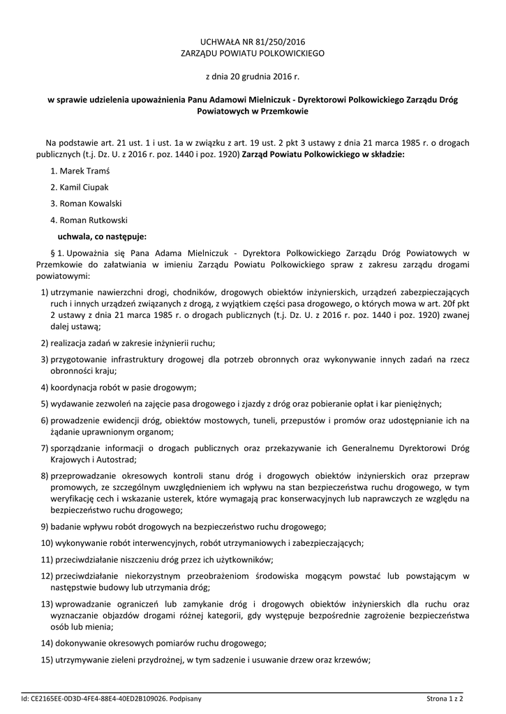 UCHWAŁA NR 81/250/2016 ZARZĄDU POWIATU POLKOWICKIEGO z dnia 20 grudnia 2016 r. w sprawie udzielenia upoważnienia Panu Adamowi Mielniczuk - Dyrektorowi Polkowickiego Zarządu Dróg Powiatowych w Przemkowie Na podstawie art. 21 ust. 1 i ust. 1a w związku z art. 19 ust. 2 pkt 3 ustawy z dnia 21 marca 1985 r. o drogach publicznych (t.j. Dz. U. z 2016 r. poz. 1440 i poz. 1920) Zarząd Powiatu Polkowickiego w składzie: 1. Marek Tramś 2. Kamil Ciupak 3. Roman Kowalski 4. Roman Rutkowski uchwala, co następuje: § 1. Upoważnia się Pana Adama Mielniczuk - Dyrektora Polkowickiego Zarządu Dróg Powiatowych w Przemkowie do załatwiania w imieniu Zarządu Powiatu Polkowickiego spraw z zakresu zarządu drogami powiatowymi: 1) utrzymanie nawierzchni drogi, chodników, drogowych obiektów inżynierskich, urządzeń zabezpieczających ruch i innych urządzeń związanych z drogą, z wyjątkiem części pasa drogowego, o których mowa w art. 20f pkt 2 ustawy z dnia 21 marca 1985 r. o drogach publicznych (t.j. Dz. U. z 2016 r. poz. 1440 i poz. 1920) zwanej dalej ustawą; 2) realizacja zadań w zakresie inżynierii ruchu; 3) przygotowanie infrastruktury drogowej dla potrzeb obronnych oraz wykonywanie innych zadań na rzecz obronności kraju; 4) koordynacja robót w pasie drogowym; 5) wydawanie zezwoleń na zajęcie pasa drogowego i zjazdy z dróg oraz pobieranie opłat i kar pieniężnych; 6) prowadzenie ewidencji dróg, obiektów mostowych, tuneli, przepustów i promów oraz udostępnianie ich na żądanie uprawnionym organom; 7) sporządzanie informacji o drogach publicznych oraz przekazywanie ich Generalnemu Dyrektorowi Dróg Krajowych i Autostrad; 8) przeprowadzanie okresowych kontroli stanu dróg i drogowych obiektów inżynierskich oraz przepraw promowych, ze szczególnym uwzględnieniem ich wpływu na stan bezpieczeństwa ruchu drogowego, w tym weryfikację cech i wskazanie usterek, które wymagają prac konserwacyjnych lub naprawczych ze względu na bezpieczeństwo ruchu drogowego; 9) badanie wpływu robót drogowych na bezpieczeństwo ruchu drogowego; 10) wykonywanie robót interwencyjnych, robót utrzymaniowych i zabezpieczających; 11) przeciwdziałanie niszczeniu dróg przez ich użytkowników; 12) przeciwdziałanie niekorzystnym przeobrażeniom środowiska mogącym powstać lub powstającym w następstwie budowy lub utrzymania dróg; 13) wprowadzanie ograniczeń lub zamykanie dróg i drogowych obiektów inżynierskich dla ruchu oraz wyznaczanie objazdów drogami różnej kategorii, gdy występuje bezpośrednie zagrożenie bezpieczeństwa osób lub mienia; 14) dokonywanie okresowych pomiarów ruchu drogowego; 15) utrzymywanie zieleni przydrożnej, w tym sadzenie i usuwanie drzew oraz krzewów; Id: CE2165EE-0D3D-4FE4-88E4-40ED2B109026. Podpisany Strona 1 z 2 16) opracowywanie projektów planów rozwoju sieci drogowej oraz bieżące informowanie o tych planach organów właściwych do sporządzania miejscowych planów zagospodarowania przestrzennego; 17) opracowywanie projektów planów finansowania budowy, przebudowy, remontu, utrzymania i ochrony dróg oraz drogowych obiektów inżynierskich; 18) pełnienie funkcji inwestorskiej; 19) zarządzanie i utrzymywanie kanałów technologicznych i pobieranie opłat, o których mowa w art. 39 ust. 7 ustawy; wraz z prawem do wydawania w powyższych sprawach decyzji administracyjnych. § 2. Upoważnienia udziela się na czas zatrudnienia na stanowisku Dyrektora Polkowickiego Zarządu Dróg Powiatowych w Przemkowie. § 3. Uchwała wchodzi w życie z dniem podjęcia, z mocą obowiązującą od 01.01.2017 r. Starosta Polkowicki Marek Tramś Id: CE2165EE-0D3D-4FE4-88E4-40ED2B109026. Podpisany Strona 2 z 2