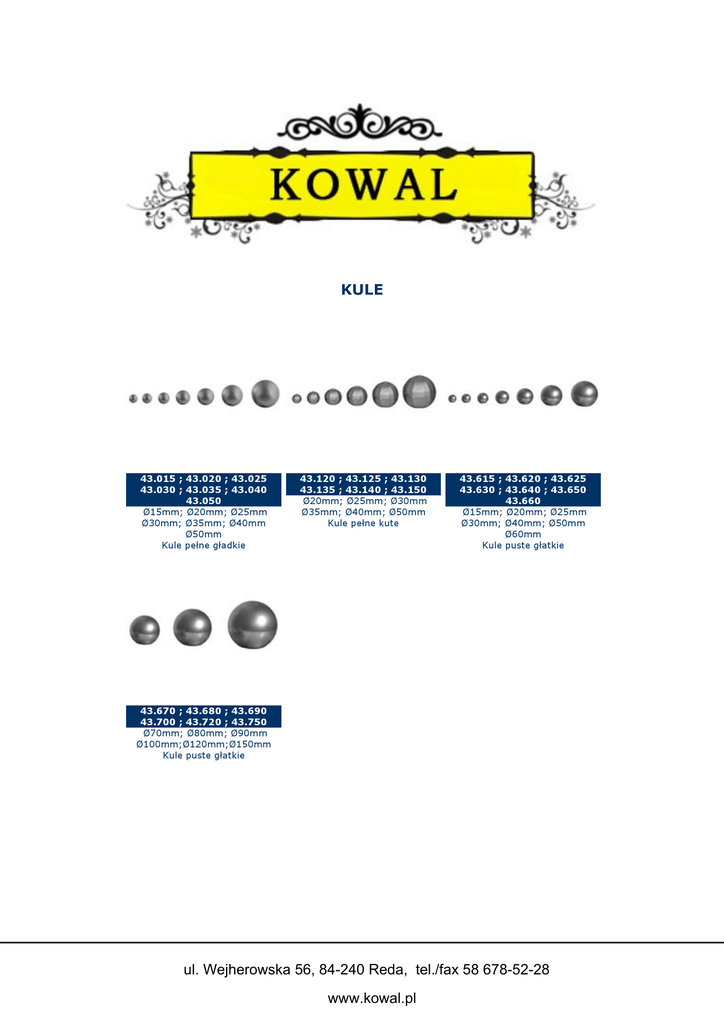 KULE 43.015 ; 43.020 ; 43.025 43.030 ; 43.035 ; 43.040 43.050 Ø 1 5 m m ; Ø 2 0 m m ; Ø 2 5 m m Ø 3 0 m m ; Ø 3 5 m m ; Ø 4 0 m m Ø 5 0 m m K u le p e łn e g ła d k ie 43.6 43.7 Ø 7 0 Ø 1 0 0 7 0; 00 ; m m ; m m ; Ø K u le 43.6 43.7 Ø 8 0 1 2 0 p u s t 43.120 ; 43.135 ; Ø 2 0 m m ; Ø 3 5 m m ; K u le 43.125 ; 43.130 43.140 ; 43.150 Ø 2 5 m m ; Ø 3 0 m m Ø 4 0 m m ; Ø 5 0 m m p e łn e k u t e 43.6 15 ; 43.6 20 ; 43.6 43.6 30 ; 43.6 40 ; 43.6 43.6 6 0 Ø 1 5 m m ; Ø 2 0 m m ; Ø 2 5 m Ø 3 0 m m ; Ø 4 0 m m ; Ø 5 0 m Ø 6 0 m m K u le p u s t e g ła t k ie 8 0 ; 43.6 9 0 20 ; 43.7 50 m m ; Ø 9 0 m m m m ; Ø 1 5 0 m m e g ła t k ie ul. Wejherowska 56, 84-240 Reda, tel./fax 58 678-52-28 www.kowal.pl 25 50 m m