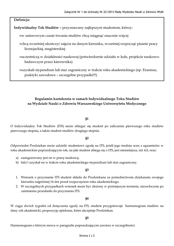 Załącznik Nr 1 do Uchwały Nr 22/2013 Rady Wydziału Nauki o Zdrowiu WUM Definicja: Indywidualny Tok Studiów – przyznawany najlepszym studentom, którzy: • w ustawowym czasie trwania studiów chcą osiągnąć znacznie więcej • chcą wcześniej ukończyć zajęcia na danym kierunku, wcześniej rozpocząć pisanie pracy licencjackiej, magisterskiej • uczestniczą w działalności naukowej (potwierdzenie udziału w kole, projekcie naukowobadawczym przez kierownika) • uzyskali stypendium lub staż zagraniczny w trakcie roku akademickiego (np. Erasmus, praktyki zawodowe – szczególne przypadki!!!) Regulamin kształcenia w ramach Indywidualnego Toku Studiów na Wydziale Nauki o Zdrowiu Warszawskiego Uniwersytetu Medycznego §1 O Indywidualny Tok Studiów (ITS) może ubiegać się student po zaliczeniu pierwszego roku studiów pierwszego stopnia, a także student studiów drugiego stopnia. §2 Odpowiedni Prodziekan może udzielić studentowi zgodę na ITS, jeżeli jego średnia ocen z egzaminów w roku akademickim poprzedzającym rok, na jaki student ubiega się o ITS, jest niemniejsza, niż 4,0, oraz: a) zaangażowany jest on w pracę naukową; b) lub/i uzyskał on w trakcie roku akademickiego stypendium lub staż zagraniczny. §3 1. Wniosek o przyznanie ITS student składa do Prodziekana za pośrednictwem dziekanatu swojego kierunku najpóźniej 14 dni przed rozpoczęciem roku akademickiego. 2. W szczególnych przypadkach wniosek może być złożony w późniejszym terminie, niezwłocznie po zaistnieniu przesłanki do przyznania ITS. §4 W ciągu dwóch tygodni od doręczenia zgody na ITS, student przygotowuje harmonogram studiów na dany rok akademicki, propozycję opiekuna, które akceptuje Prodziekan. §5 Harmonogram o którym mowa w paragrafie poprzedzającym zawiera w szczególności: Strona 1 z 2 Załącznik Nr 1 do Uchwały Nr 22/2013 Rady Wydziału Nauki o Zdrowiu WUM 1. Szczegółowy plan zaliczeń i egzaminów w danym roku akademickim. 2. Wykaz zajęć w jakich uczestniczył będzie student w celu realizacji wszystkich założonych efektów kształcenia. §6 Student, któremu przyznano ITS ma prawo do: a) modyfikacji formy oraz terminów zaliczeń i egzaminów, w uzgodnieniu z odpowiednią jednostką naukowo –dydaktyczną; b) zaliczenia w uzgodnionej z prowadzącym formie, materiału z zajęć w których z usprawiedliwionych powodów nie jest w stanie uczestniczyć. c) udziału w zajęciach niewchodzących w zakres aktualnego etapu studiów, z możliwością ich zaliczenia, zgodnie z limitami zawartymi w ustawie Prawo o szkolnictwie wyższym. d) rozszerzonego programu edukacyjnego z wybranego przedmiotu pod kierunkiem nauczyciela akademickiego prowadzącego takie zajęcia. §7 ITS rozpoczyna się wraz z początkiem roku akademickiego na jaki został przyznany lub dniem decyzji Prodziekana. §8 Prodziekan może cofnąć decyzję przyznającą studentowi prawo studiowania w ramach ITS, w przypadku nieprzestrzegania podstawowych obowiązków studenta wynikających ze Statutu, a także Regulaminu Studiów Warszawskiego Uniwersytetu Medycznego. §9 Od decyzji Prodziekana studentowi przysługuje odwołanie do Dziekana Wydziału, a od decyzji Dziekana do Prorektora ds. dydaktyczno-wychowawczych Warszawskiego Uniwersytetu Medycznego. §10 Studia według Indywidualnego Toku Studiów mogą prowadzić do przedłużenia terminu ukończenia studiów. §11 Powyższy Regulamin obowiązuje w kadencji 2012-2016. Strona 2 z 2