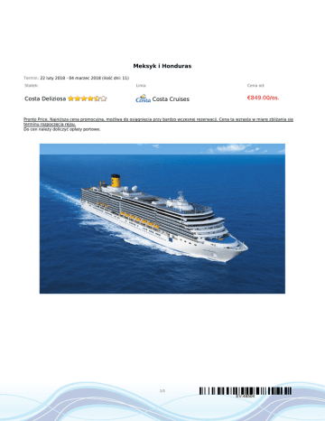 Meksyk i Honduras Termin: 22 luty 2018 - 04 marzec 2018 (ilość dni: 11) Statek: Costa Deliziosa Linia: Cena od: Costa Cruises €849.00/os. Pronto Price. Najniższa cena promocyjna, możliwa do osiągnięcia przy bardzo wczesnej rezerwacji. Cena ta wzrasta w miarę zbliżania się terminu rozpoczęcia rejsu. Do cen należy doliczyć opłaty portowe. 1/3 EV:48504 TRASA REJSU dzień 1 Data Port Wpłynięcie Wypłynięcie czwartek 22.02.2018 Port Everglades --:-- 23:00 12:00 18:00 Stany Zjednoczone piątek 23.02.2018 Key West, Floryda dzień 3 sobota 24.02.2018 Dzień na morzu --:-- --:-- dzień 4 niedziela 25.02.2018 Cozumel 09:00 18:00 poniedziałek 26.02.2018 Costa Maya 09:00 19:00 wtorek 27.02.2018 Belize City 08:00 18:00 08:00 19:00 dzień 2 dzień 5 dzień 6 dzień 7 środa 28.02.2018 Legenda Stany Zjednoczone Meksyk Meksyk Belize Roatan Honduras dzień 8 czwartek 01.03.2018 Dzień na morzu --:-- --:-- dzień 9 piątek 02.03.2018 Playa del Carmen 07:00 18:00 dzień 10 sobota 03.03.2018 Dzień na morzu --:-- --:-- dzień 11 niedziela 04.03.2018 Port Everglades 06:00 --:-- Meksyk Stany Zjednoczone CENNIK Kabina wewnętrzna Cena katalogowa Cena promocyjna na zapytanie od €849.00 2/3 EV:48504 Kabina zewnętrzna z oknem na zapytanie od €999.00 Kabina zewnętrzna z balkonem na zapytanie od €1 149.00 Suite (apartament) na zapytanie od €1 729.00 Samsara Suite na zapytanie Kabina jednoosobowa na zapytanie 3 i 4 osoba dorosła w kabinie na zapytanie dziecko do 18 lat jako 3 i 4 osoba w kabinie Opłaty portowe tylko opłaty portowe €150.00 Uwaga! Ceny za osobę w kabinie dwuosobowej. Cena zawiera: zakwaterowanie w kabinie wybranej kategorii; wyżywienie - 3 główne posiłki, przekąski między posiłkami; napoje serwowane do śniadania i w bufetach samoobsługowych; serwis bagażowy podczas wejścia i zejścia ze statku; serwis kabinowy; korzystanie ze wszystkich urządzeń sportowo - rekreacyjnych znajdujących się na pokładzie statku (basen, jacuzzi, sala fitness, itp.); udział we wszystkich imprezach organizowanych na statku (przedstawienia w teatrze, koncerty, programy animacyjne itp.). Cena nie zawiera: kosztów dojazdu do portu; opłat portowych; ewentualnych noclegów w hotelu przed/po rejsie i transferów; wycieczek fakultatywnych w trakcie rejsu; korzystania z barów, mini baru w kabinie oraz napojów zamawianych w restauracji; korzystania z punktów usługowych (fryzjer, pralnia, fotograf, salon piękności i odnowy biologicznej, internet) i wydatków osobistych; napiwków dla obsługi na statku (kwota uzależniona od długości rejsu); ubezpieczenia KL, NNW i bagaż, kosztów wiz (tam gdzie wymagane). Uwagi: Od 01.12.2015 na wszystkich rejsach Costa Cruises (z min. 5 noclegów) można zarezerwować następujące pakiety all inclusive: dla dzieci 4-17 lat Giovani od 15.99€/os./dzień, dla dorosłych: Brindiamo od 24.99€/os./dzień, Piu Gusto od 27.99€/os./dzień, Intenditore od 45.99€/os./dzień (pakiet musi być wykupiony przez każdą osobę zakwaterowaną w kabinie - można zakupić w biurze przed rejsem). Na Państwa życzenie zarezerwujemy przelot, transfery do/z portu, parking, dodatkowe noclegi oraz zadbamy o odpowiednie ubezpieczenie podróżne. 3/3 EV:48504