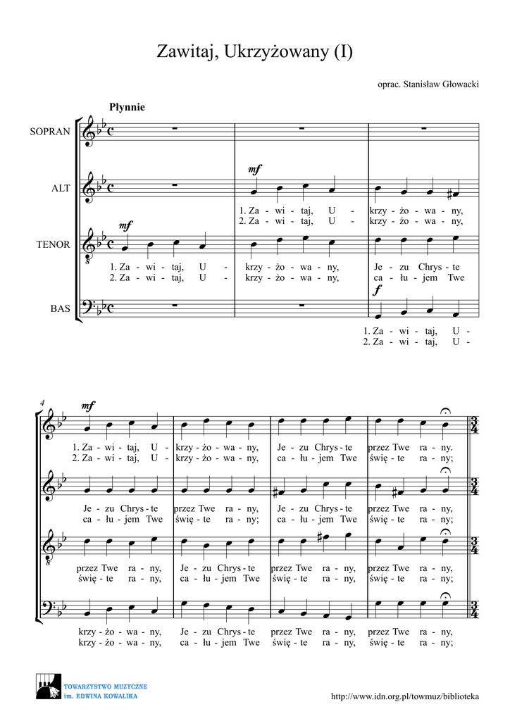 Zawitaj, Ukrzyżowany (I) oprac. Stanisław Głowacki ° b &b c Płynnie SOPRAN ALT b &b c ∑ mf ∑ b &b c œ ‹ 1. Za mf TENOR ∑ œ œ BAS ? bc ¢ b œ œ - œ œ œ œ U U œ - krzy - żo - wa - ny, krzy - żo - wa - ny, ∑ ∑ œ œ #œ œ œ krzy - żo - wa - ny, krzy - żo - wa - ny, œ 4 1. Za - wi - taj, 2. Za - wi - taj, œ œ œ œ œ U - krzy - żo - wa - ny, U - krzy - żo - wa - ny, b &b œ œ œ œ Je - zu Chrys - te ca - łu - jem Twe b œ œ œ œ &b ‹ przez Twe ra - ny, ra - ny, ?b œ œ ¢ b œ œ krzy - żo - wa - ny, krzy - żo - wa - ny, œ œ œ œ œ œ Je - zu Chrys - te ca - łu - jem Twe przez Twe świę - te ra - ny, ra - ny; przez Twe świę - te ra - ny, ra - ny; œ œ #œ œ œ œ œ œ Je - zu Chrys - te ca - łu - jem Twe œ œ œ U œ ra - ny. ra - ny; œ œ œ œ Je - zu Chrys - te ca - łu - jem Twe U U - przez Twe świę - te œ œ œ œ ra - ny, ra - ny; œ Je - zu Chrys - te ca - łu - jem Twe œ œ #œ œ przez Twe świę - te œ Je - zu Chrys - te ca - łu - jem Twe f 1. Za - wi - taj, 2. Za - wi - taj, ° b mf &b œ œ œ œ świę - te U U œ 1. Za - wi - taj, 2. Za - wi - taj, œ - wi - taj, 2. Za - wi - taj, œ ∑ przez Twe świę - te ra - ny, ra - ny, œ œ œ œ przez Twe świę - te ra - ny, ra - ny, 43 U œ #œ œ œ 43 œ œ œ U œ 43 œ œ œ U œ przez Twe świę - te ra - ny, ra - ny; 43 http://www.idn.org.pl/towmuz/biblioteka ° b 3 pœ œ œ œ ˙ &b 4 2 8 b3 &b 4 Kró - lu na prze - bi - te ∑ nie - bie, rę - ce, p pro - si - my no - gi w Twej œ œ #œ ˙ Kró - lu na nie prze - bi - te rę - b3 ˙ &b 4 œ œ œ œ ‹ Kró - lu na nie - bie, p prze - bi - te ? b3 ¢ b4 œ œ œ ∑ rę - ce, mf œ œ ˙ Cie - bie, mę - ce, œ œ œ œ œ œ œ ˙ ra - tuj nas w każ - dej po - trze- bie. miej - cież nas w swo - jej o - pie - ce. œ œ œ œ œ œ œ œ œ œ ˙ bie, pro - si - my, ra - tuj nas w każ - dej po - trze- bie. ce, w Twej mę - ce, miej - cież nas w swo - jej o - pie - ce. œ œ œ pro - si - my no - gi w Twej œ ˙ Cie - bie, mę - ce, œ œ œ œ œ œ œ ˙ ra - tuj nas w każ - dej po - trze- bie. miej - cież nas w swo - jej o - pie - ce. #œ nœ œ ˙ nœ œ œ œ œ œ œ œ œ œ œ ˙ Kró - lu na nie prze - bi - te rę - bie, pro - si - my, ra - tuj nas w każ - dej po - trze- bie. ce, w Twej mę - ce, miej - cież nas w swo - jej o - pie - ce. http://www.idn.org.pl/towmuz/biblioteka