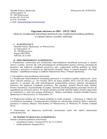 Ośrodek Pomocy Społecznej ul.Partyzantów 14 29 -100 Włoszczowa tel./fax 041 39 43 261 tel 0 41 39 44 009 e- mail: [email protected] Włoszczowa dn. 03.09.2012r. Zapytanie ofertowe nr OPS – ZP/21 /2012 (dotyczy świadczenia konsultacji prawnych oraz wygłoszenia krótkiej prelekcji w ramach umowy cywilno- prawnej) I. ZAMAWIAJĄCY Ośrodek Pomocy Społecznej we Włoszczowie ul. Partyzantów 14 29- 100 Włoszczowa Regon 290519036 NIP 656-18-11-058 II. OPIS PRZEDMIOTU ZAMÓWIENIA 1. Przedmiotem zamówienia jest świadczenie indywidualnych konsultacji prawnych w ramach umowy cywilno- prawnej dla osób potrzebujących profesjonalnej pomocy prawnej (doznających przemocy lub będących świadkami przemocy) oraz wygłoszenie krótkiej prelekcji na temat związany z przemocą w rodzinie po zakończeniu projekcji filmu, w ramach projektu „Nie bądź obojętny”, współfinansowanego ze środków Ministerstwa Pracy i Polityki Społecznej. 2. Szczegółowy opis przedmiotu zamówienia: 2.1 Świadczenie indywidualnych konsultacji prawnych w wymiarze 8 godzin zegarowych przez okres czterech miesięcy t.j.: od września 2012r do końca grudnia 2012r czyli po dwie godziny zegarowe w miesiącu dla osób potrzebujących profesjonalnej pomocy prawnej (doznających przemocy lub będących świadkami przemocy). Dni tygodnia, spośród których będą ustalane terminy konsultacji: od poniedziałku do piątku, natomiast przedział godzinny pozostaje również do uzgodnienia po zawarciu umowy. W ramach dyżurów prawnik udzielać będzie również odpowiedzi na wiadomości e- mail oraz pytania telefoniczne. Miejsce konsultacji: siedziba Ośrodka Pomocy Społecznej we Włoszczowie, ul. Partyzantów 14. 2.2 Wygłoszenie krótkiej (do 30 minut) prelekcji na temat związany z przemocą w rodzinie (po wcześniejszej konsultacji z koordynatorami projektu) po zakończeniu projekcji filmu o tematyce przemocy w rodzinie. Miejsce: Dom Kultury we Włoszczowie, ul. Wiśniowa 19. Termin: Listopad 2012r. 3. Zamawiający nie dopuszcza możliwości powierzenia części lub całości zamówienia podwykonawcom. III.TERMIN WYKONANIA ZAMÓWIENIA Termin wykonania podmiotu zamówienia: – konsultacje/ dyżury: wrzesień 2012r. do 31.12.2012r. – krótka prelekcja: listopad 2012r. IV. OPIS SPOSOBU PRZYGOTOWANIA OFERTY Oferent powinien stworzyć ofertę na formularzu załączonym do niniejszego zapytania. Oferta powinna być: - opatrzona pieczątką, - posiadać datę sporządzenia, - zawierać adres lub siedzibę oferenta, numer telefonu, numer NIP, - podpisana czytelnie przez wykonawcę. V. MIEJSCE ORAZ TERMIN SKŁADANIA OFERT 1.Oferta powinna być przesłana za pośrednictwem: poczty elektronicznej na adres e- mail: [email protected] , za pośrednictwem poczty, kuriera lub też dostarczona osobiście na adres: Ośrodek Pomocy Społecznej,ul. Partyzantów 14, 29 -100 Włoszczowa lub faksem na nr: 041 39 43 261, do dnia 07.09.2012r. do godziny 15.30. 2. Ocena ofert zostanie dokonana w dniu 10.09.2012r, a wyniki i wybór najkorzystniejszej oferty zostanie ogłoszony o godzinie 14:00 w siedzibie Ośrodka Pomocy Społecznej we Włoszczowie oraz na stronie internetowej pod adresem http://www.ops-wloszczowa.pl . 3. Oferty złożone po terminie nie będą rozpatrywane. 4. Oferent może przed upływem terminu składania ofert zmienić lub wycofać swoją ofertę. 5. W toku badania i oceny ofert Zamawiający może żądać od oferentów wyjaśnień dotyczących treści złożonych ofert. 6. Zapytanie ofertowe zamieszczono na stronie http://www.ops-wloszczowa.pl . VI. OCENA OFERT Zamawiający dokona oceny ważnych ofert na podstawie następujących kryteriów: 1 - Cena 50% 2 – Oczekiwania, co do wykształcenia i uprawnień- 50 % Wymagane wykształcenie: uzyskane wyższe wykształcenie prawnicze Preferowane uprawnienia zawodowe: aplikacja radcowska. VII. INFORMACJE DOTYCZĄCE WYBORU NAJKORZYSTNIEJSZEJ OFERTY O wyborze najkorzystniejszej oferty Zamawiający zawiadomi oferentów za pośrednictwem strony internetowej znajdującej się pod adresem http://www.ops-wloszczowa.pl, oraz poczty elektronicznej na podany przez Wykonawcę adres. VIII. DODATKOWE INFORMACJE Dodatkowych informacji udziela Anna Popczyk pod numerem telefonu: 0 41 39 43 261 wew. 34 oraz pod adresem e- mail: [email protected] IX. ZAŁĄCZNIKI Wzór formularza ofertowego. Załącznik nr 1 Formularz ofertowy FORMULARZ OFERTOWY na świadczenie indywidualnych konsultacji prawnych oraz wygłoszenie krótkiej prelekcji w ramach realizacji projektu „Nie bądź obojętny” przez Ośrodek Pomocy Społecznej, 29-100 Włoszczowa ul. Partyzantów 14 WYKONAWCA:................................................................................................................................. (nazwa / imię i nazwisko wykonawcy składającego ofertę) ADRES:................................................................................................................................................. ( dokładny adres wykonawcy ) ADRES KORESPONDENCYJNY (jeżeli jest inny niż powyżej): ........................................................................................................................................... (dokładny adres dla korespondencji jeżeli jest inny niż powyżej) TEL./FAX. ........................................................................................................................................... ( dokładne numery telefonu/ numer faksu do wykonawcy dla korespondencji dot. niniejszego postępowania) adres e-mail wykonawcy: ............................................................................................. (dla korespondencji dotyczącej niniejszego postępowania) KRS lub nr i data wpisu do ewidencji działalności gospodarczej oraz organ prowadzący : (jeżeli wykonawca prowadzi własną działalność) .................................................................................................................................