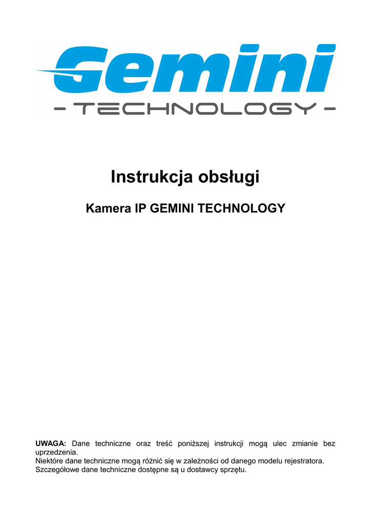 Instrukcja obsługi Kamera IP GEMINI TECHNOLOGY UWAGA: Dane techniczne oraz treść poniższej instrukcji mogą ulec zmianie bez uprzedzenia. Niektóre dane techniczne mogą różnić się w zależności od danego modelu rejestratora. Szczegółowe dane techniczne dostępne są u dostawcy sprzętu. Spis treści 1. Interfejs logowania.............................................................................................................3 2. Podgląd obrazu na żywo....................................................................................................4 2.1 Wybór strumienia.........................................................................................................5 2.2 Sterowanie PTZ...........................................................................................................5 2.3 Konfiguracja wyświetlanego obrazu............................................................................5 2.4 Obsługa presetów........................................................................................................6 2.5 Pozostałe funkcje.........................................................................................................6 2.6 Zoom cyfrowy...............................................................................................................6 3. Odtwarzanie.......................................................................................................................7 4. Ustawienia..........................................................................................................................8 4.1 Informacje o urządzeniu..............................................................................................9 4.2 Kod QR......................................................................................................................10 4.3 Ustawienia PTZ.........................................................................................................10 4.4 Ustawienia wyświetlania............................................................................................11 4.5 Kodowanie.................................................................................................................12 4.6 Ustawienia wideo.......................................................................................................13 4.7 Detekcja ruchu...........................................................................................................15 4.8 Sabotaż kamery.........................................................................................................16 4.9 Strefy prywatności.....................................................................................................17 4.10 Ustawienia sieciowe................................................................................................18 4.11 Platform management..............................................................................................19 4.12 Ustawienia Multicast................................................................................................20 4.13 Ustawienia DDNS....................................................................................................21 4.14 Ustawienia NTP.......................................................................................................22 4.15 Ustawienia E-mail....................................................................................................23 4.16 Ustawienia FTP.......................................................................................................24 4.17 Wejścia alarmowe....................................................................................................25 4.18 Wyjścia alarmowe....................................................................................................26 4.19 Zdarzenia systemowe..............................................................................................26 4.20 Użytkownicy.............................................................................................................27 4.21 Aktualizacja systemu...............................................................................................28 4.22 Automatyczny restart...............................................................................................29 4.23 Dyski........................................................................................................................29 4.24 Przywracanie ustawień domyślnych........................................................................30 4.25 Ustawienia lokalne...................................................................................................30 5. Zarządzanie plikami.........................................................................................................31 6. Logi systemowe...............................................................................................................32 7. Wylogowanie....................................................................................................................33 1. Interfejs logowania W oknie przeglądarki internetowej wprowadź adres IP kamery. Wyświetlony zostanie ekran logowania. Wprowadź domyślną nazwę użytkownika oraz hasło: Ustawienia domyślne: IP: 192.168.1.188 User Name: admin Password: brak hasła Korzystając z ekranu logowania należy ustawić preferowany język interfejsu. Kliknij przycisk „Submit”, aby się zalogować. Przy pierwszym wyświetleniu ekranu logowania system poprosi o zainstalowanie kontrolek Active-X. Należy pobrać i zainstalować kontrolki W przypadku przeglądarek IE 8 I wyższych, system poinformuje o niepodpisanym dodatku Active-X i zablokuje instalację. Aby zezwolić na instalacje komponentu należny zmienić ustawienia zabezpieczeń przeglądarki. 1. W IE wybierz “Opcje internetowe” → “Zabezpieczenia” → “Poziom niestandardowy” 2. „Inicjowanie i wykonywanie 