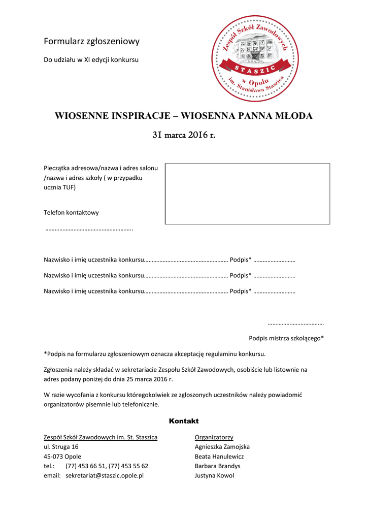 Formularz zgłoszeniowy Do udziału w XI edycji konkursu WIOSENNE INSPIRACJE – WIOSENNA PANNA MŁODA 31 marca 2016 r. Pieczątka adresowa/nazwa i adres salonu /nazwa i adres szkoły ( w przypadku ucznia TUF) Telefon kontaktowy ……………………………………………….. Nazwisko i imię uczestnika konkursu……………………………………………… Podpis* ……………………… Nazwisko i imię uczestnika konkursu……………………………………………… Podpis* ……………………… Nazwisko i imię uczestnika konkursu……………………………………………… Podpis* ……………………… ……………………………… Podpis mistrza szkolącego* *Podpis na formularzu zgłoszeniowym oznacza akceptację regulaminu konkursu. Zgłoszenia należy składać w sekretariacie Zespołu Szkół Zawodowych, osobiście lub listownie na adres podany poniżej do dnia 25 marca 2016 r. W razie wycofania z konkursu któregokolwiek ze zgłoszonych uczestników należy powiadomić organizatorów pisemnie lub telefonicznie. Kontakt Zespół Szkół Zawodowych im. St. Staszica ul. Struga 16 45-073 Opole tel.: (77) 453 66 51, (77) 453 55 62 email: [email protected] Organizatorzy Agnieszka Zamojska Beata Hanulewicz Barbara Brandys Justyna Kowol