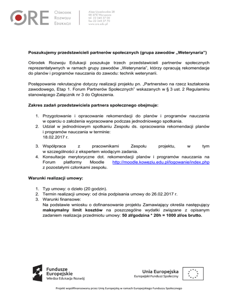 Poszukujemy przedstawicieli partnerów społecznych (grupa zawodów „Weterynaria”) Ośrodek Rozwoju Edukacji poszukuje trzech przedstawicieli partnerów społecznych reprezentatywnych w ramach grupy zawodów „Weterynaria”, którzy opracują rekomendacje do planów i programów nauczania do zawodu: technik weterynarii. Postępowanie rekrutacyjne dotyczy realizacji projektu pn. „Partnerstwo na rzecz kształcenia zawodowego, Etap 1. Forum Partnerów Społecznych” wskazanych w § 3 ust. 2 Regulaminu stanowiącego Załącznik nr 3 do Ogłoszenia. Zakres zadań przedstawiciela partnera społecznego obejmuje: 1. Przygotowanie i opracowanie rekomendacji do planów i programów nauczania w oparciu o założenia wypracowane podczas jednodniowego spotkania. 2. Udział w jednodniowym spotkaniu Zespołu ds. opracowania rekomendacji planów i programów nauczania w terminie: 18.02.2017 r. 3. Współpraca z pracownikami Zespołu projektu, w tym w szczególności z ekspertem wiodącym zadania. 4. Konsultacje merytoryczne dot. rekomendacji planów i programów nauczania na Forum platformy Moodle http://moodle.koweziu.edu.pl/logowanie/index.php z pozostałymi członkami zespołu. Warunki realizacji umowy: 1. Typ umowy: o dzieło (20 godzin). 2. Termin realizacji umowy: od dnia podpisania umowy do 26.02.2017 r. 3. Warunki finansowe: Na podstawie wniosku o dofinansowanie projektu Zamawiający określa następujący maksymalny limit kosztów na poszczególne wydatki związane z opisanym zadaniem realizacja przedmiotu umowy: 50 zł/godzina * 20h = 1000 zł/os brutto. Projekt współfinansowany przez Unię Europejską w ramach Europejskiego Funduszu Społecznego Informacje uzupełniające: 1. Wykonawcy zobowiązani będą do przedstawiania oświadczenia w postaci protokołu o faktycznej liczbie godzin, którą przeznaczyli na realizację umowy w ujęciu miesięcznym oraz poświadczą, że łączna miesięczna liczba godzin zadań realizowanych w ramach wszystkich projektów finansowanych z funduszy strukturalnych i Funduszu Spójności oraz zadań finansowanych z innych źródeł, obejmujących okres realizacji umowy zawartej z ORE nie przekracza łącznie 276 godzin miesięcznie. Jednocześnie wykonawca będzie zobowiązany do złożenia oświadczenia, że obciążenie zawodowe nie wyklucza możliwości prawidłowej i efektywnej realizacji wszystkich zadań powierzonych mu w ramach projektu. 2. W ramach spotkań określonych w pkt 3 Zakresu zadań przedstawiciela partnera społecznego, Zamawiający zapewnia i finansuje nocleg przed spotkaniem oraz wyżywienie w trakcie spotkania. Uczestnikom spotkania zwracane są koszty podróży uczestnikom spotkania (do 200 zł - zgodnie z cennikiem biletów II klasy). 3. Spotkanie BZPS odbywać się będą w weekendy. Zamawiający zastrzega sobie możliwość zmiany terminów spotkań (zgodnie z harmonogramem realizacji zadań). 4. Osoby będące Partnerami Społecznymi w projekcie nie mogą brać udziału w niniejszej rekrutacji. Zamawiający zastrzega sobie możliwość niewyłonienia Wykonawców bez podania przyczyny. Wymagania stawiane Wykonawcy Wymagania obowiązkowe (oceniane: spełnia/ nie spełnia): 1. Min. 3-letnie doświadczenie zawodowe w wybranym/ych zawodzie/zawodach w ramach grupy zawodów „Weterynaria”. 2. Wykształcenie adekwatne do wybranego/ych zawodu/zawodów zadeklarowanego/ych w ramach grupy zawodów „Weterynaria”. 3. Rekomendacja co najmniej jednego partnera społecznego, reprezentatywnego dla wybranego/ych zawodu/zawodów w ramach grupy zawodowej „Weterynaria”. 4. Średnie miesięczne zaangażowanie w realizację zadań we wszystkich projektach finansowanych z funduszy strukturalnych i Funduszu Spójności oraz z zadań Projekt współfinansowany przez Unię Europejską w ramach Europejskiego Funduszu Społecznego finansowanych z innych źródeł (w tym umowa o pracę, umowy zlecenie, umowy o dzieło, działalność gospodarcza) nieprzekraczające 250 godzin. Kryteria oceny wyboru najkorzystniejszej oferty: 1. Oferent może zdobyć maksymalnie 50 punktów. 2. W ramach oceny kompetencje i doświadczenia oferent może uzyskać maksymalnie 40 punktów – kryteria wraz z punktacją zostały podane w formularzu zgłoszeniowym (Załącznik nr 1). Punktacja w zakresie kompetencji i doświadczenia stanowi sumę punktów uzyskanych przez kandydata w części 3 formularza zgłoszeniowego. 3. Zaproponowana cena, za którą można uzyskać maks. 10 pkt: - 10 pkt otrzyma oferta z najniższą ceną, wobec której pozostałe oferty będą porównywane; - cena winna być wyrażona w złotych polskich, zaokrąglona do dwóch miejsc po przecinku zgodnie z zasadami rachunkowymi; - wykonawca może podać tylko jedną cenę – bez proponowania rozwiązań wariantowych. 4. Przyjęty algorytm obliczania ceny: Cena – wzór obliczenia punktów: 𝑃= 𝐶𝑛 ∗ 10 𝑝𝑘𝑡 𝐶𝑏 P – liczba punktów przyznanych badanej ofercie w zakresie ceny Cn – najniższa cena spośród badanych ofert Cb – cena oferty badanej P= Cn Za najkorzystniejszą Zamawiający uzna tę ofertę, która po zsumowaniu obu kryteriów uzyska największą liczbę punktów. W pierwszej kolejności dokonana zostanie ocena formalna. Oferty niespełniające wymogów obowiązkowych nie będą poddawane dalszej ocenie. Projekt współfinansowany przez Unię Europejską w ramach Europejskiego Funduszu Społecznego Minimum punktowe konieczne do uzyskania w kryterium doświadczenie i kompetencje oferenta wynosi 7 punktów. Oferty, które nie spełnią minimum nie będą podlegały dalszej ocenie w kryterium „Zaproponowana cena”. Ponadto w kryteriach wskazane zostały obszary, w których oferent powinien uzyskać minimalną liczbę punktów, nieuzyskanie minimum w co najmniej jednym z ww. obszarów powoduje, że oferta taka nie będzie podlegała dalszej ocenie. Warunki zmiany umowy Zamawiający zastrzega możliwość zmiany treści umowy w stosunku do treści oferty, 