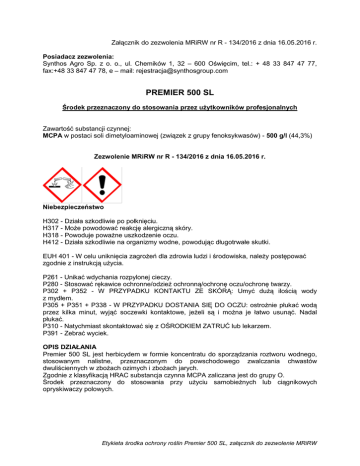 Załącznik do zezwolenia MRiRW nr R - 134/2016 z dnia 16.05.2016 r. Posiadacz zezwolenia: Synthos Agro Sp. z o. o., ul. Chemików 1, 32 – 600 Oświęcim, tel.: + 48 33 847 47 77, fax:+48 33 847 47 78, e – mail: [email protected] PREMIER 500 SL Środek przeznaczony do stosowania przez użytkowników profesjonalnych Zawartość substancji czynnej: MCPA w postaci soli dimetyloaminowej (związek z grupy fenoksykwasów) - 500 g/l (44,3%) Zezwolenie MRiRW nr R - 134/2016 z dnia 16.05.2016 r. Niebezpieczeństwo H302 - Działa szkodliwie po połknięciu. H317 - Może powodować reakcję alergiczną skóry. H318 - Powoduje poważne uszkodzenie oczu. H412 - Działa szkodliwie na organizmy wodne, powodując długotrwałe skutki. EUH 401 - W celu uniknięcia zagrożeń dla zdrowia ludzi i środowiska, należy postępować zgodnie z instrukcją użycia. P261 - Unikać wdychania rozpylonej cieczy. P280 - Stosować rękawice ochronne/odzież ochronną/ochronę oczu/ochronę twarzy. P302 + P352 - W PRZYPADKU KONTAKTU ZE SKÓRĄ: Umyć dużą ilością wody z mydłem. P305 + P351 + P338 - W PRZYPADKU DOSTANIA SIĘ DO OCZU: ostrożnie płukać wodą przez kilka minut, wyjąć soczewki kontaktowe, jeżeli są i można je łatwo usunąć. Nadal płukać. P310 - Natychmiast skontaktować się z OŚRODKIEM ZATRUĆ lub lekarzem. P391 - Zebrać wyciek. OPIS DZIAŁANIA Premier 500 SL jest herbicydem w formie koncentratu do sporządzania roztworu wodnego, stosowanym nalistne, przeznaczonym do powschodowego zwalczania chwastów dwuliściennych w zbożach ozimych i zbożach jarych. Zgodnie z klasyfikacją HRAC substancja czynna MCPA zaliczana jest do grupy O. Środek przeznaczony do stosowania przy użyciu samobieżnych lub ciągnikowych opryskiwaczy polowych. Etykieta środka ochrony roślin Premier 500 SL, załącznik do zezwolenie MRiRW DZIAŁANIE NA CHWASTY Premier 500 SL jest selektywnym herbicydem o działaniu układowym, pobieranym poprzez liście chwastów powodując ich deformację, a następnie zahamowanie wzrostu roślin i ich zamieranie. Najskuteczniej niszczy chwasty znajdujące się w fazie 2-6 liści. Zboża jare Chwasty wrażliwe: dymnica pospolita, gorczyca polna, komosa biała, ostrożeń polny, szarłat szorstki, samosiewy rzepaku, tasznik pospolity, tobołki polne. Chwasty średniowrażliwe: chaber bławatek, poziewnik szorstki. Chwasty średnioodporne: fiołek polny, jasnota purpurowa, rumian polny. Chwasty odporne: przytulia czepna, rdestówka powojowata (rdest powojowaty). Zboża ozime: Chwasty wrażliwe: bodziszek drobny, dymnica pospolita, mak polny, samosiewy rzepaku, tasznik pospolity, tobołki polne. Chwasty średniowrażliwe: chaber bławatek. Chwasty średnioodporne: gwiazdnica pospolita, jasnota purpurowa, maruna bezwonna, rumian polny. Chwasty odporne: fiołek polny, przytulia czepna. STOSOWANIE ŚRODKA Pszenica ozima, jęczmień ozimy, pszenżyto ozime, żyto Maksymalna / zalecana dawka środka dla jednorazowego zastosowania: 1,5 l/ha. Termin stosowania: zabieg wykonywać wiosną, od początku fazy krzewienia zbóż do końca tej fazy (BBCH 21-29). Maksymalna liczba zabiegów w sezonie wegetacyjnym: 1. Zalecana ilość wody: 200 - 300 l/ha. Zalecane opryskiwanie: średniokropliste. Pszenica jara, jęczmień jary, pszenżyto jare, owies Maksymalna dawka środka dla jednorazowego zastosowania: 1,5 l/ha. Zalecana dawka środka dla jednorazowego zastosowania: 1,2 - 1,5 l/ha. Termin stosowania: zabieg wykonywać wiosną, od początku fazy krzewienia zbóż do końca tej fazy (BBCH 21-29). Maksymalna liczba zabiegów w sezonie wegetacyjnym: 1. Zalecana ilość wody: 200 - 300 l/ha. Zalecane opryskiwanie: średniokropliste. NASTĘPSTWO ROŚLIN W przypadku konieczności zaorania plantacji potraktowanej środkiem (w wyniku uszkodzenia roślin przez przymrozki, choroby lub szkodniki) po wykonaniu uprawy przedsiewnej można uprawiać wszystkie rośliny rolnicze. ŚRODKI OSTROŻNOŚCI I ZALECENIA STOSOWANIA PRAKTYKĄ ROLNICZĄ 1. Środka nie stosować: − na rośliny chore i uszkodzone, − w temperaturze powietrza poniżej 8°C i powyżej 25°C, − w okresie, gdy temperatura nocą jest niższa niż +5°C, ZWIĄZANE Z DOBRĄ Etykieta środka ochrony roślin Premier 500 SL, załącznik do zezwolenie MRiRW − w okresie nadmiernej suszy lub zbliżających się deszczów. 2. Podczas stosowania środka nie dopuścić do: − znoszenia cieczy użytkowej na sąsiednie rośliny uprawne, − nakładania się cieczy użytkowej na stykach pasów zabiegowych i uwrociach. SPORZĄDZANIE CIECZY UŻYTKOWEJ Przed przystąpieniem do sporządzania cieczy użytkowej dokładnie ustalić potrzebną jej ilość. Odmierzoną ilość środka wlać do zbiornika opryskiwacza napełnionego częściowo wodą (z włączonym mieszadłem) i uzupełnić wodą do potrzebnej ilości. Po wlaniu środka do zbiornika opryskiwacza nie wyposażonego w mieszadło hydrauliczne ciecz w zbiorniku mechanicznie wymieszać. Opróżnione opakowania przepłukać trzykrotnie wodą, a popłuczyny wlać do zbiornika opryskiwacza z cieczą użytkową. W przypadku przerw w opryskiwaniu przed ponownym przystąpieniem do pracy, dokładnie wymieszać ciecz użytkową w zbiorniku opryskiwacza. POSTĘPOWANIE Z RESZTKAMI CIECZY UŻYTKOWEJ Z resztkami cieczy użytkowej po zabiegu należy postępować w sposób ograniczający ryzyko skażenia wód powierzchniowych i podziemnych w rozumieniu przepisów Prawa wodnego oraz skażenia gruntu, tj.: – po uprzednim rozcieńczeniu zużyć na powierzchni, na której przeprowadzono zabieg, jeżeli jest to możliwe lub – unieszkodliwić z wykorzystaniem rozwiązań technicznych zapewniających biologiczną degradację substancji czynnych środków ochrony roślin, lub – unieszkodliwić w inny sposób, zgodny z przepisami o odpadach. Po pracy aparaturę dokładnie wymyć. Ze względu na bardzo dużą wrażliwość niektórych roślin uprawnych nawet na znikome ilości środka, bardzo ważne jest dokładn