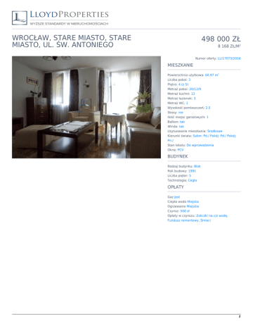 WROCŁAW, STARE MIASTO, STARE MIASTO, UL. ŚW. ANTONIEGO 498 000 ZŁ 8 168 ZŁ/M2 Numer oferty: LL/17073/2016 MIESZKANIE Powierzchnia użytkowa: 60.97 m2 Liczba pokoi: 3 Piętro: 4 (z 5) Metraż pokoi: 20/12/9 Metraż kuchni: 12 Metraż łazienek: 3 Metraż WC: 1 Wysokość pomieszczeń: 2.5 Skosy: nie Ilość miejsc garażowych: 1 Balkon: tak Winda: tak Usytuowanie mieszkania: Środkowe Kierunki świata: Salon: Pd./ Pokój: Pd./ Pokój: Pn./ Stan lokalu: Do wprowadzenia Okna: PCV BUDYNEK Rodzaj budynku: Blok Rok budowy: 1991 Liczba pięter: 5 Technologia: Cegła OPŁATY Gaz Jest Ciepła woda Miejska Ogrzewanie Miejskie Czynsz: 500 zł Opłaty w czynszu: Zaliczki na c/z wodę, Fundusz remontowy, Śmieci 1 Maciej Tylman Property Expert & Manager + 48 512 483 903 [email protected] OPIS Dwustronny układ pomieszczeń sprawia, że miejsce jest dobrze doświetlone. Od południa znajdują się 2 pokoje (20 i 12 m2) z wyjściem na ok. 4-metrowy balkon w sypialni. Z drugiej strony znajduje się trzeci pokój (ok. 9 m2) oraz imponująca, widna kuchnia (ok. 12 m2). Wszystkie pomieszczenia są ustawne. Całości dopełnia łazienka z wanną oraz osobna toaleta co bardzo ułatwia życie na co dzień. Przestronny hall wejściowy zagospodarowany jest przez głębokie szafy gwarantując spoto miejsca na przechowywanie rzeczy. Mieszkanie jest po remontach co sprawia, że można się tu wprowadzać od zaraz i bardzo zmniejsza koszty potrzebne do wprowadzenia. Ostanio kuchnia została kapitalnie wyremontowana. W całym mieszkaniu czuć świeżość i dbałość o szczegóły wykończenia. Na podłogach jest wycyklinowany parkiet a ściany są wygładzone. Usytuowanie na 4 piętrze budynku z 1991 z windą zapewnia komfortowe użytkowanie na co dzień. Wejście na klatkę prowadzi przez zadbany dziedziniec stanowiąc pewien bufor od zgiełku miasta. Instalacje są w pelni sprawne a ostanio wyremontowano klatkę i dach. Do mieszkania przynależy 6-metrowa piwnica. Na terenie wewnętrznym jest możliwość parkowania auta co w tej okolicy może być bardzo pomocne. Promenada Staromiejska zaraz obok i wygodny dostęp zarówno do atrakcji miasta jak również do dobrze zorganizowanej komunikacji z każdą częśćią miasta rzucają się w oczy już przy pierwszym kontakcie. Bliskość Rynku jak również centrum miasta daje dostęp do pełnej, potrzebnej infrastruktury. 2