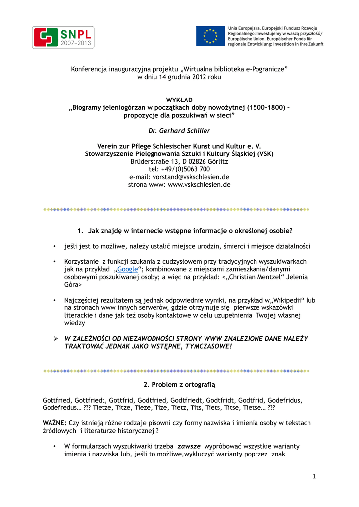 Konferencja inauguracyjna projektu „Wirtualna biblioteka e-Pogranicze” w dniu 14 grudnia 2012 roku WYKŁAD „Biogramy jeleniogórzan w początkach doby nowożytnej (1500-1800) – propozycje dla poszukiwań w sieci” Dr. Gerhard Schiller Verein zur Pflege Schlesischer Kunst und Kultur e. V. Stowarzyszenie Pielęgnowania Sztuki i Kultury Śląskiej (VSK) Brüderstraße 13, D 02826 Görlitz tel: +49/(0)5063 700 e-mail: [email protected] strona www: www.vskschlesien.de 1. Jak znajdę w internecie wstępne informacje o określonej osobie? • jeśli jest to możliwe, należy ustalić miejsce urodzin, śmierci i miejsce działalności • Korzystanie z funkcji szukania z cudzysłowem przy tradycyjnych wyszukiwarkach jak na przykład „Google“; kombinowane z miejscami zamieszkania/danymi osobowymi poszukiwanej osoby; a więc na przykład: <„Christian Mentzel“ Jelenia Góra> • Najczęściej rezultatem są jednak odpowiednie wyniki, na przykład w„Wikipedii“ lub na stronach www innych serwerów, gdzie otrzymuje się pierwsze wskazówki literackie i dane jak też osoby kontaktowe w celu uzupełnienia Twojej własnej wiedzy W ZALEŻNOŚCI OD NIEZAWODNOŚCI STRONY WWW ZNALEZIONE DANE NALEŻY TRAKTOWAĆ JEDNAK JAKO WSTĘPNE, TYMCZASOWE! 2. Problem z ortografią Gottfried, Gottfriedt, Gottfrid, Godtfried, Godtfriedt, Godtfridt, Godtfrid, Godefridus, Godefredus… ??? Tietze, Titze, Tieze, Tize, Tietz, Tits, Tiets, Titse, Tietse… ??? WAŻNE: Czy istnieją różne rodzaje pisowni czy formy nazwiska i imienia osoby w tekstach źródłowych i literaturze historycznej ? • W formularzach wyszukiwarki trzeba zawsze wypróbować wszystkie warianty imienia i nazwiska lub, jeśli to możliwe,wykluczyć warianty poprzez znak 1 zastępczy („?“ lub „*“): na przykład <Christian Men*> (zawsze należy sprawdzać starannie pomoc online dla funkcji wyszukiwania!) • Jakie warianty są typowe dla Śląska w niemieckiej ortografii z początków czasów nowożytnych? • Aby zdobyć wyczucie dla powszechnych w regionie wariantów ortograficznych zaleca się lekturę transkrybowanego tekstu odręcznego z odpowiedniego okresu czasu • Dla wieku XVIII na przykład - fragment z Pomnożonych Jeleniogórskich osobliwości miejskiego kronikarza Davida Zellera (1676-1738) (transkrybowany przez Ullricha Junkera w Jeleniogórskiej Bibliotece Cyfrowej) 2.1. Warianty spółgłosek „s“ może występować jako „ss“ lub „ß“; ciągle należy sprawdzać wszystkie warianty, ponieważ nie wszystkie formularze wyszukiwarek przeobrażają „ß“ w „ss“ („Kießling“/„Kiesling“/„Kiessling“) „t“ w nagłosie lub wygłosie lub „t“ przed samogłoską było często pisane jako „th“ („Mohrenthal“/„Mohrental“, „Baumgart“/„Baumgarth“ lub „Thielschen“/„Tielschen“) „t“ występuje czasami jako „d“, lub na końcu wyrazu jako „dt“ lub „tt“ i odwrotnie(„Bernhard“/„Bernhardt“/„Bernhartt“/„Bernhart“) „z“ występuje jako „tz“ lub rzadko jako „zz“ („Menzel“/„Mentzel“ lub „Scholz“/ „Scholtz“/„Scholzz“) Wiele podwójnych spółgłosek na przykład jeśli w głosce spółgłoska następuje po dyftongu lub poprzedzającej spółgłosce. Szczególnie „f“ („Kauffmann“/„Kaufmann“, „Kupferberg“/„Kupfferberg“, „Adolf“/“Adolff“, „Hanß“/„Hans“ lub „Sparr“/„Spar“) Odwrotnie: zamiast podwójnej spółgłoski na końcu głoski tylko zwykła spółgłoska („Ullmann“/„Ulmann“ lub „Tham“/„Thamm“ lub „Johann“/„Johan“ lub „Hoffmann“/„Hofmann“ lub „Riemann“/„Rieman“) „c“, „k“ i „ck“, rzadziej „kk“ są często stosowane alternatywnie: („Jakob“/„Jacob“, „Winkler“/„Winckler“, „Handwerker“/„Handwercker“) Dzisiejsze „f“ pojawia się często jako „ph“: („Stefan“/„Stephan“, „Adolf“/Adolph“) Szczególnie w wyrazach obcego pochodzenia pojawia się „c“ zamiast „z“ („Societät“/„Sozietät“) Dla „z“ często „tz“ lub rzadzej „ts“ („Tietz“/„Tits“) 2 2.2. Warianty w obszarze samogłosek „j“ było pierwotnie wyłącznie formą oboczną „i“; a więc zawsze należy szukać obu wariantów („Jhle“/„Ihle“ zamiast „au“ często występuje „aw“; zamiast „eu“ „ew“ („Neuer“/„Newer“) „w“ należy przy tym rozumieć jeszcze jako pierwotne „podwójne u“ przegłos „ei“ może występować jako : „ai“, „ay“, „aÿ“, „ey“ lub „eÿ“; tak należy na przykład sprawdzić słowo „Meier“ we wszystkich formach („Schneyder“/„Schneider“…) na Śląsku występuje czasami dla „ö“ lub „ä“ „e“ („Kätzler“/“Ketzler“, „Bäcker“/„Becker“) lub dla „ü“ „i“ i odwrotnie: („Ehrenschild“/„Ehrenschüld“) zamiast „ie“ często występuje „i“ jak: („Tietze“/„Titze“, „Gottfrid“/„Gottfried“, „Dietrich“/Dittrich“) Często brakuje „h“ do przedłużenia po samogłosce : („Frölich“/„Fröhlich“) Odjęcie lub dodanie niemego„e“ na końcu głoski: („Hofmann“/„Hofemann“ lub „Tietz“/Tietze“) 2.3. Ogólnie Przegłosy „ä“, „ö“ „ü“ należy wprowadzać do formularzy wyszukiwarek także ciągle jako „ae“, „oe“ lub „ue“ jak też „a“, „o“, „u“ Zwracać uwagę na zamienione na łacińskie formy imion i nazwisk, szczególnie w wypadku osób po studiach: („Thebesius“/„Thebes“, „Köhler“/„Colerus“/„Collerius“, „George“/„Georgius“, „Adolph“/“Adolphi“) Czasami występuje także w oparciu o łacinę „v“ zamiast „u“ Przy nazwiskach kobiet dodano prawie zawsze końcówkę „-in“: („Baumgarth[in]“, „Scholz[zin]“, „Thebesius[in]“, „Rabe“/„Rabin“) Szczególnie w wypadku artystów imiona były często tłumaczone na różne języki (