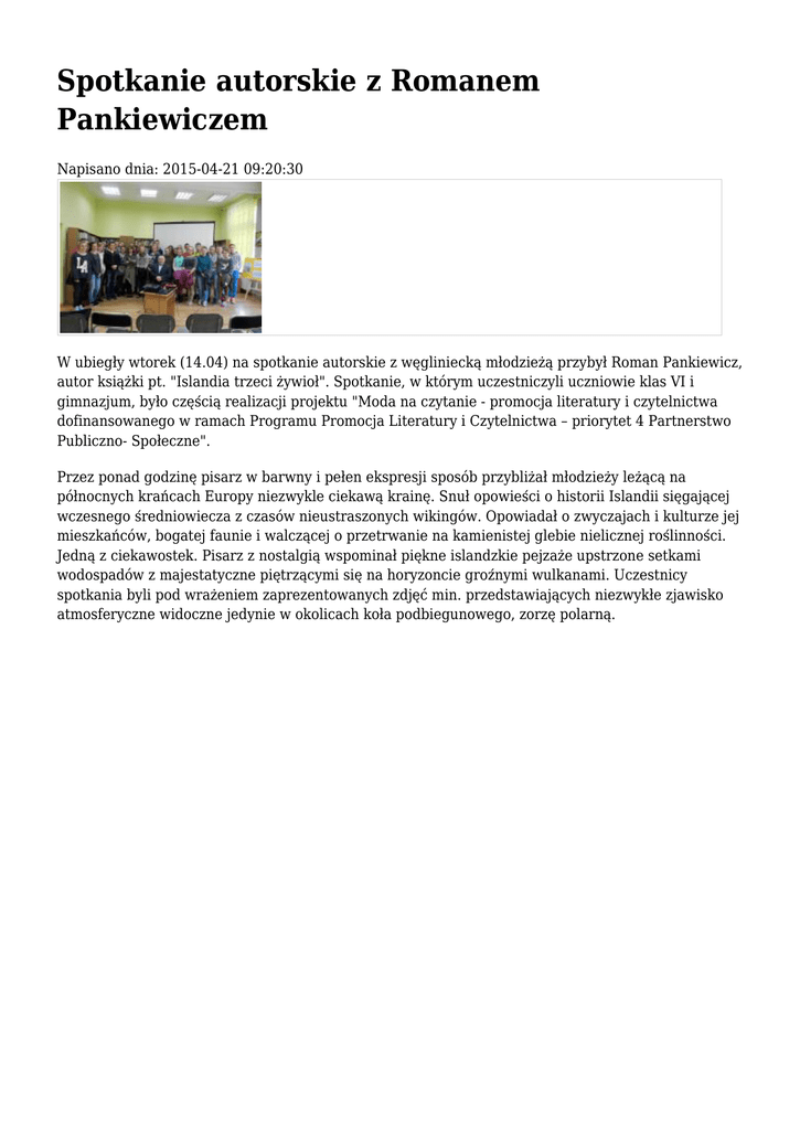 Spotkanie autorskie z Romanem Pankiewiczem Napisano dnia: 2015-04-21 09:20:30 W ubiegły wtorek (14.04) na spotkanie autorskie z węgliniecką młodzieżą przybył Roman Pankiewicz, autor książki pt. "Islandia trzeci żywioł". Spotkanie, w którym uczestniczyli uczniowie klas VI i gimnazjum, było częścią realizacji projektu "Moda na czytanie - promocja literatury i czytelnictwa dofinansowanego w ramach Programu Promocja Literatury i Czytelnictwa – priorytet 4 Partnerstwo Publiczno- Społeczne". Przez ponad godzinę pisarz w barwny i pełen ekspresji sposób przybliżał młodzieży leżącą na północnych krańcach Europy niezwykle ciekawą krainę. Snuł opowieści o historii Islandii sięgającej wczesnego średniowiecza z czasów nieustraszonych wikingów. Opowiadał o zwyczajach i kulturze jej mieszkańców, bogatej faunie i walczącej o przetrwanie na kamienistej glebie nielicznej roślinności. Jedną z ciekawostek. Pisarz z nostalgią wspominał piękne islandzkie pejzaże upstrzone setkami wodospadów z majestatyczne piętrzącymi się na horyzoncie groźnymi wulkanami. Uczestnicy spotkania byli pod wrażeniem zaprezentowanych zdjęć min. przedstawiających niezwykłe zjawisko atmosferyczne widoczne jedynie w okolicach koła podbiegunowego, zorzę polarną.