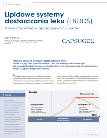 8 | polski przemysł Lipidowe systemy dostarczania leku (LBDDS) Nowe narzędzie w opracowywaniu leków Frédéric Carrière Dyrektor ds. Badań w CNRS, Laboratory of Enzymology at Interfaces and Physiology of Lipolysis, Marsylia, Francja Podawanie doustne to preferowany sposób podawania leków. Wynika to z jego zalet – jest nieinwazyjne, tanie, nie powoduje efektów ubocznych (jak na przykład reakcje miejscowe na iniekcje itp.), a także jest najłatwiejszą i najdogodniejszą metodą w wypadku długotrwałych terapii. Projektowanie nowych substancji czynnych (NME) do podawania rozpuszczalność farmakoforu w wodzie, to trzeba pamiętać, że lipofilność doustnego jest aktualnie jednym z największych wyzwań stojących leków często ściśle wpływa na ich wiązanie substancji docelowej, a co za przed naukowcami pracującymi w przemyśle farmaceutycznym. Chociaż tym idzie, na ich efektywność. Wiele różnych formuł substancji czynnych wciąż uważa się, że metodami chemii kombinatorycznej można poprawić pozostaje dziś niewykorzystanych. W skrócie • LBDDS poprawia rozpuszczalność i biodostępność słabo rozpuszczalnych leków. • Dostosowanie istniejących leków do LBDDS może zmienić ich właściwości farmakokinetyczne, zoptymalizować zależność dawka-odpowiedź i poprawić skuteczność leczenia • Powstają nowe możliwości w zarządzaniu cyklem życia leku na rynku oraz rozszerzaniu własności przemysłowej przy użyciu LBDDS 1/2011 e-w ydanie do pobrania na: www.farmacom.com.pl polski przemysł | 9 Substancje pomocnicze w formulacji Oleje: triglicerydy lub mieszanka mono- i diglicerydów Surfaktanty rozpuszczalne w wodzie (HLB > 12) Surfaktanty nierozpuszczalne w wodzie (HLB < 12) Hydrofilne kosolwenty (np. PEG, glikol propylenowy, transkutol) Zawartość w formulacji (w/w) Typ I 100 - Typ II 40-80 20-60 - Typ IIIA 40-80 20-40 0-40 Typ IIIB <20 20-50 20-50 Typ IV 30-80 0-20 0-50 Tab. 1. System klasyfikacji lipidowych substancji pomocniczych (LFCS) (1, 2) Lipidowe systemy dostarczania leku (LBDDS) Lipidowe substancje pomocnicze mogą zwiększyć biodostępność pokojowej, często trudno poddają się formulacji leków w postaci suchych proszków, zwykle wymagając użycia dużej ilości substancji pomocniczych. podawanych doustnie środków — głównie przez poprawienie ich Wrażliwość na wilgotność może też wpływać na stabilność chemiczną rozpuszczalności w płynach ustrojowych (w przewodzie pokarmowym). leków, a co za tym idzie efektywność in vivo. Problem ten można Mogą też pozytywnie wpłynąć na wchłanialność jelitową, stabilność leku, rozwiązać z użyciem matryc lipofilnych. i w szczególnych przypadkach zredukować jego rozpad pod wpływem LBDDS zwykle buduje się z użyciem różnych mieszanek olejów, niektórych enzymów obecnych w przewodzie pokarmowym. Ogólnie surfaktantów i kosolwentów. Skład ten pozwala na ich klasyfikację mówiąc, LBDDS mogą zwiększyć ilość leku dostarczaną do krążenia (tabela 1 (1, 2)). ogólnego pacjenta. Ponieważ lipoliza w układzie pokarmowym zachodzi głównie w jelicie cienkim, przewiduje się, że LBDDS mogą zostać zastosowane do kontrolowanego uwalniania substancji czynnych z ulegającej trawieniu matrycy lipidowej. Ponadto LBDDS dają różnorakie korzyści jeśli chodzi o samą formulację postaci leku. Niepolarne związki o niskiej rozpuszczalności w wodzie (poniżej 20 µg/ml), mogą być łatwiej rozpuszczalne dzięki umieszczeniu ich w matrycy lipidowej. Projektowanie leków klasy II BCS (system klasyfikacji biofarmaceutycznej) jest często dużym wyzwaniem ze względu na na trudności w uzyskaniu jednorodności składu, a LBDDS łatwo stosuje się w celu otrzymania mieszanek izotropicznych. Substancje o niskiej temperaturze Użycie LBDDS daje szereg korzyści przy formulacji leku topnienia (tzn. < 100°C), również te, które są ciekłe w temperaturze e-w ydanie do pobrania na: www.farmacom.com.pl 1/2011 10 | polski przemysł Typ LCFS Charakterystyka Zalety Wady Typ I Brak dyspersji, wymaga trawienia Uważane za bezpieczne (status GRAS amerykańskiej FDA); proste; idealnie nadają się do kapsułek Małe możliwości rozpuszczania, chyba że lek jest wysoce lipofilny Typ II SEDDS ze składnikami rozpuszczalnymi w wodzie Raczej nie traci możliwości rozpuszczania przy dyspersji Duży rozmiar cząstek emulsji o/w (0,25-2μm) Typ IIIA SEDDS/SMEDDS ze składnikami rozpuszczalnymi w wodzie Czysta lub prawie czysta dyspersja; wchłanianie leku bez trawienia Prawdopodobna utrata mozliwości rozpuszczania przy dyspersji, trudniej trawione Typ IIIB SMEDDS ze składnikami rozpuszczalnymi w wodzie i niską zawartością olejów Czysta dyspersja; wchłanianie leku bez trawienia Prawdopodobna utrata możliwości rozpuszczania przy dyspersji Typ IV Bezolejowe formuły oparte na substancjach powierzchniowo czynnych i kosolwentach Dobra możliwość rozpuszczania dla wielu leków; dyspersja z micelami Utrata mozliwości rozpuszczania przy dyspersji; mogą nie być możliwe do trawienia Tab. 2. Cechy charakterystyczne, zalety i wady różnych typów lipidowych substancji pomocniczych (1, 2) Użycie LBDDS do poprawy możliwości rozpuszczania/dyspersji oraz biodostępności trudno rozpuszczalnych leków dobór mieszanki lipid/surfaktant/kosolwent — dostępne są LBDDS W zależności od skladu, LBDDS mogą mieć pewne właściwości czynnikami wpływającymi na jego efektywność. Lek może działać samodzielnie tworzące mikroemulsje (SMEDDS) i nanoemulsje (SNEDDS). Rozpuszczalność i wchłanianie leku są kluczowymi fizyczne (nierozproszona faz olejowa, emulsje róznych rozmiarów, struktury jedynie pod warunkiem, ze zostanie rozpuszczony i przeniknie przez micelarne i lamelarne), a co za tym idzie różne zalety jeśli chodzi barierę jelitową, gdzie naturalnie następuje wchłonięcie składników o monitorowanie rozpuszczalności, dyspersji i wchłaniania (tabel