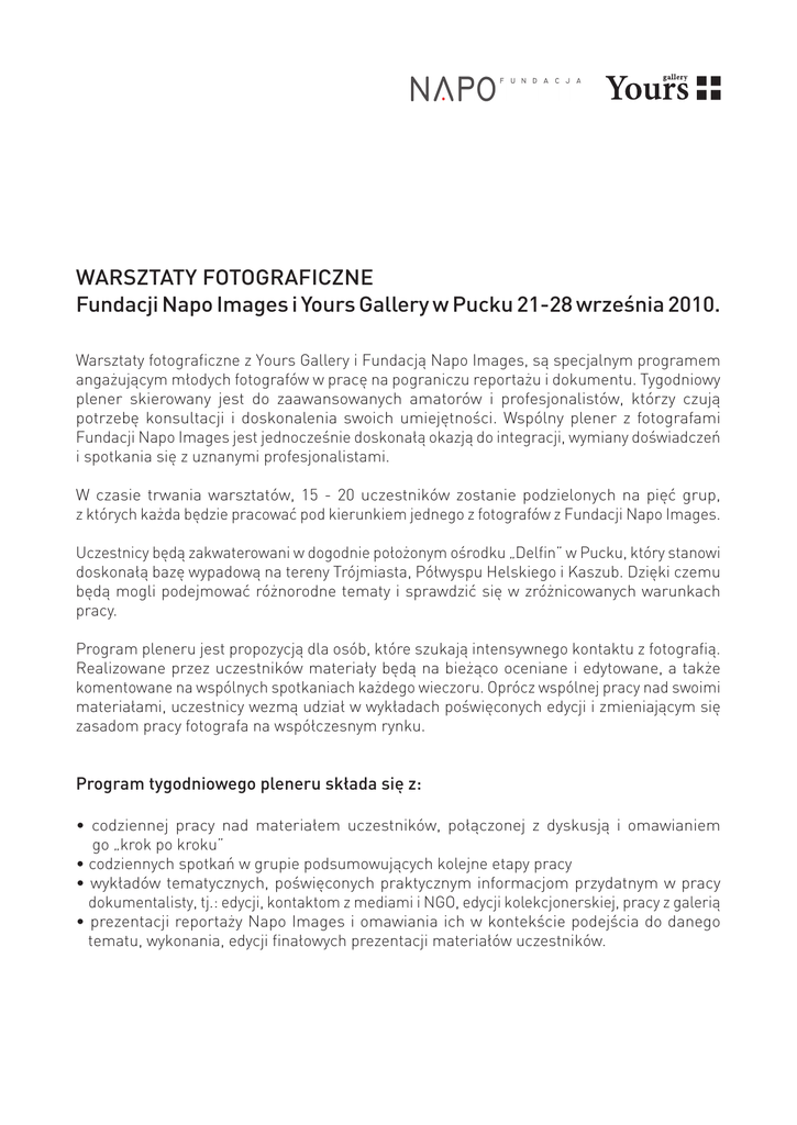 WARSZTATY FOTOGRAFICZNE Fundacji Napo Images i Yours Gallery w Pucku 21-28 września 2010. Warsztaty fotograficzne z Yours Gallery i Fundacją Napo Images, są specjalnym programem angażującym młodych fotografów w pracę na pograniczu reportażu i dokumentu. Tygodniowy plener skierowany jest do zaawansowanych amatorów i profesjonalistów, którzy czują potrzebę konsultacji i doskonalenia swoich umiejętności. Wspólny plener z fotografami Fundacji Napo Images jest jednocześnie doskonałą okazją do integracji, wymiany doświadczeń i spotkania się z uznanymi profesjonalistami. W czasie trwania warsztatów, 15 - 20 uczestników zostanie podzielonych na pięć grup, z których każda będzie pracować pod kierunkiem jednego z fotografów z Fundacji Napo Images. Uczestnicy będą zakwaterowani w dogodnie położonym ośrodku „Delfin” w Pucku, który stanowi doskonałą bazę wypadową na tereny Trójmiasta, Półwyspu Helskiego i Kaszub. Dzięki czemu będą mogli podejmować różnorodne tematy i sprawdzić się w zróżnicowanych warunkach pracy. Program pleneru jest propozycją dla osób, które szukają intensywnego kontaktu z fotografią. Realizowane przez uczestników materiały będą na bieżąco oceniane i edytowane, a także komentowane na wspólnych spotkaniach każdego wieczoru. Oprócz wspólnej pracy nad swoimi materiałami, uczestnicy wezmą udział w wykładach poświęconych edycji i zmieniającym się zasadom pracy fotografa na współczesnym rynku. Program tygodniowego pleneru składa się z: • codziennej pracy nad materiałem uczestników, połączonej z dyskusją i omawianiem go „krok po kroku” • codziennych spotkań w grupie podsumowujących kolejne etapy pracy • wykładów tematycznych, poświęconych praktycznym informacjom przydatnym w pracy dokumentalisty, tj.: edycji, kontaktom z mediami i NGO, edycji kolekcjonerskiej, pracy z galerią • prezentacji reportaży Napo Images i omawiania ich w kontekście podejścia do danego tematu, wykonania, edycji finałowych prezentacji materiałów uczestników. Uczestnicy będą mogli pracować w grupach z: Wojtkiem Grzędzińskim (1980) Studiował Stosowane Nauki Społeczne, Etnologię i Antropologię Kulturową oraz Pedagogikę Resocjalizacyjną. Pracował dla gazet codziennych min. „Rzeczpospolitej”, „Dziennika”. W fotografii interesuje go człowiek - zarówno zanurzony w codzienności, jak i w zderzeniu z sytuacjami ekstremalnymi. Uczestnik warsztatów fotograficznych organizowanych przez Agencję VII. Zdobywca World Press Photo 2009. Adamem Lachem (1983) Z wyróżnieniem ukończył Akademię Fotografii WSF AFA we Wrocławiu. Jest laureatem wielu konkursów fotografii prasowej. Realizował projekty fotograficzne na terenie Mołdawi, Nadniestrzańskiej Republiki Mołdawskiej, Rumunii i Niemiec. Od 2006r. stały współpracownik tygodnika „Newsweek Polska”. Filipem Ćwikiem (1973) Fotoreporter tygodnika „Newsweek Polska”, wcześniej związany z „Gazetą Wyborczą”. Tworzył i prowadził Dział Foto w dzienniku „Polska The Times”. Pomysłodawca i juror konkursu „Newsreportaż”. Studiował kulturoznawstwo na Uniwersytecie im. Adama Mickiewicza w Poznaniu oraz fotografię na Akademii Sztuk Wizualnych w Poznaniu. Interesują go wszelkie formy multimedialne. Piotrem Małeckim (1967) Studiował na Wydziale Operatorskim w Katowicach i fotografię w Anglii na BPCAD Bournemouth. Fotografuje od początku lat 90-tych. Pracował jako fotoreporter tygodnika „Wprost”, a po paru latach zaczął działać niezależnie. Koncentruje się głównie na fotoreportażu. Portretuje artystów, polityków, aktorów. Czuje się równie dobrze pracując małoobrazkowym aparatem cyfrowym, jak też średnioformatowym sprzętem. Pracuje dla magazynów polskich i zagranicznych. Maciejem Jeziorkiem (1973) Absolwent studiów teologicznych na Papieskim Wydziale Teologicznym w Warszawie i Studium Fotografii w Zespole Szkół Fototechnicznych im. Juria Gagarina w Warszawie. Uczestnik Credit Suisse Masterclass for photojournalists from East-Central Europe, Budapeszt 2004. Pracował dla „Tygodnika Solidarność”, „Życia Warszawy”, dziennika „Życie” i „Polska The Times”. Od roku 2002 współpracuje z Polską Agencją Fotografów Forum. Wielokrotnie nagradzany na konkursach fotografii prasowej: Polska Fotografia Prasowa, Newsreportaż, Grand Press Photo, BZ WBK Press Photo. Zasady uczestnictwa w warsztatach: Pierwszym warunkiem uczestnictwa jest przejście selekcji, która będzie dokonywana na podstawie nadesłanych 20-30 zdjęć. Zdjęcia powinny mieć w dłuższym boku 1200 pikseli, mogą być ułożone w cykl lub cykle. Do zdjęć dołączony powinien być życiorys autora wraz z danymi kontaktowymi oraz nazwisko fotografa Fundacji Napo Images, pod kierunkiem którego uczestnik chce pracować. Po obradach jury złożonego z członków Fundacji Napo Images i Yours Gallery, do udziału w warsztatach zaproszonych zostanie 15 - 20 osób Uczestnik musi być przygotowany to udziału w warsztatach tak, jak do realizacji reportażu (mieć ze sobą aparat cyfrowy oraz laptop). Koszt uczestnictwa w warsztatach to 2.500 PLN (w cenie warsztatów wliczony jest koszt noclegów wraz ze śniadaniami. Na miejscu istnieje możliwość wykupienia obiadu. Organizatorzy nie zapewniają transportu na miejsce ani transportu lokalnego) Zdjęcia należy wysłać na adres ftp: ftp://ftp.napo.nazwa.pl login: napo_warsztaty haslo: Fotograf01 Każdy uczestnik proszony jest o zrobienie swojej imiennej teczki na wskazanym wyżej FTP Termin nadsyłania zgłoszeń upływa w dniu 31 lipca 2010r. Ogłoszenie wyników nastąpi 07 sierpnia 2010 r. Yours Gallery, Krakowskie Przedmieście 33, 00-071 Warszawa, t +48 22 890 95 00, [email protected], www.yoursgallery.com