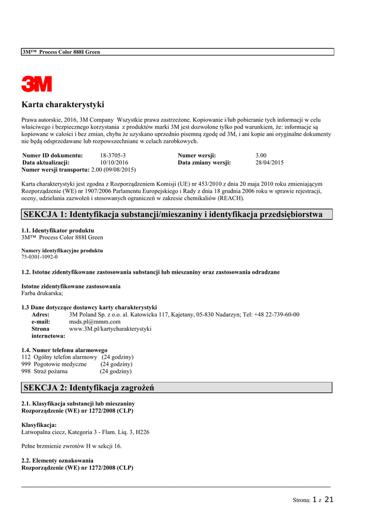 3M™ Process Color 888I Green Karta charakterystyki Prawa autorskie, 2016, 3M Company Wszystkie prawa zastrzeżone. Kopiowanie i/lub pobieranie tych informacji w celu właściwego i bezpiecznego korzystania z produktów marki 3M jest dozwolone tylko pod warunkiem, że: informacje są kopiowane w całości i bez zmian, chyba że uzyskano uprzednio pisemną zgodę od 3M, i ani kopie ani oryginalne dokumenty nie będą odsprzedawane lub rozpowszechniane w celach zarobkowych. 18-3705-3 Numer ID dokumentu: 10/10/2016 Data aktualizacji: Numer wersji transportu: 2.00 (09/08/2015) Numer wersji: Data zmiany wersji: 3.00 28/04/2015 Karta charakterystyki jest zgodna z Rozporządzeniem Komisji (UE) nr 453/2010 z dnia 20 maja 2010 roku zmieniającym Rozporządzenie (WE) nr 1907/2006 Parlamentu Europejskiego i Rady z dnia 18 grudnia 2006 roku w sprawie rejestracji, oceny, udzielania zazwoleń i stosowanych ograniczeń w zakresie chemikaliów (REACH). SEKCJA 1: Identyfikacja substancji/mieszaniny i identyfikacja przedsiębiorstwa 1.1. Identyfikator produktu 3M™ Process Color 888I Green Numery identyfikacyjne produktu 75-0301-1092-0 1.2. Istotne zidentyfikowane zastosowania substancji lub mieszaniny oraz zastosowania odradzane Istotne zidentyfikowane zastosowania Farba drukarska; 1.3 Dane dotyczące dostawcy karty charakterystyki 3M Poland Sp. z o.o. al. Katowicka 117, Kajetany, 05-830 Nadarzyn; Tel: +48 22-739-60-00 Adres: [email protected] e-mail: www.3M.pl/kartycharakterystyki Strona internetowa: 1.4. Numer telefonu alarmowego 112 Ogólny telefon alarmowy (24 godziny) 999 Pogotowie medyczne (24 godziny) 998 Straż pożarna (24 godziny) SEKCJA 2: Identyfikacja zagrożeń 2.1. Klasyfikacja substancji lub mieszaniny Rozporządzenie (WE) nr 1272/2008 (CLP) Klasyfikacja: Łatwopalna ciecz, Kategoria 3 - Flam. Liq. 3, H226 Pełne brzmienie zwrotów H w sekcji 16. 2.2. Elementy oznakowania Rozporządzenie (WE) nr 1272/2008 (CLP) __________________________________________________________________________________________ Strona: 1 z 21 3M™ Process Color 888I Green Hasło ostrzegawcze: UWAGA Symbole:: GHS02 (Płomień) Piktogramy: Zwroty wskazujące rodzaj zagrożenia: H226 Łatwopalna ciecz i pary. Zwroty wskazujące środki ostrożności: Zapobieganie: P210A Reagowanie: P370 + P378G Przechowywać z dala od źródeł ciepła, gorących powierzchni, iskrzenia, otwartego ognia i innych źródeł zapłonu. Palenie wzbronione. W przypadku pożaru: Użyć środka gaśniczego odpowiedniego dla cieczy palnych, takich jak suche chemikalia lub dwutlenek węgla do gaszenia. Informacje uzupełniające: Informacje uzupełniające o zagrożeniach: EUH205 Zawiera składniki epoksydowe. Może powodować wystąpienie reakcji alergicznej. EUH208 Zawiera: Neodekanoan 2,3-epoksypropylu. | Metakrylan butylu. Może powodować wystąpienie reakcji alergicznej. 2.3. Inne zagrożenia Nieznane SEKCJA 3: Skład/informacja o składnikach Nazwa substancji Octan 1-(2-metoksy-metylo-etoksy) propanolu (Numer rejestracji REACH:010000015637-64) Nr CAS 88917-22-0 Polimer metakrylanu butylu z metakrylanem metylu Octan 2-metoksy-1-metyloetylu (Numer rejestracji REACH:01-2119475791-29) Cykloheksanon (Numer rejestracji REACH:01-2119453616-35) 25608-33-7 Nr WE Stężenie % 30 - 50 15 - 40 108-65-6 203-603-9 7 - 13 108-94-1 203-631-1 7 - 13 Klasyfikacja Substancja z określoną na poziomie Wspólnoty wartością najwyższego dopuszczalnego stężenia w środowisku pracy Substancja niesklasyfikowana jako niebezpieczna Flam. Liq. 3, H226 (CLP) Flam. Liq. 3, H226; Acute Tox. 4, H332 (CLP) Acute Tox. 4, H312; Acute Tox. 4, H302; Skin Irrit. 2, H315; Eye Irrit. 2, H319 (Klasyfikacja 3M) __________________________________________________________________________________________ Strona: 2 z 21 3M™ Process Color 888I Green Polimer winylowy C.I. Pigment green 7 Tajemnica handlowa 1328-53-6 1 - 10 215-524-7 1 - 10 Neodekanoan 2,3-epoksypropylu 26761-45-5 247-979-2 < 0,5 Toluen 108-88-3 203-625-9 < 0,2 Etylobenzen 100-41-4 202-849-4 < 0,2 Metakrylan butylu 97-88-1 202-615-1 < 0,2 Substancja niesklasyfikowana jako niebezpieczna Substancja niesklasyfikowana jako niebezpieczna Skin Sens. 1, H317; Muta. 2, H341; Aquatic Chronic 2, H411 (Klasyfikacja 3M) Flam. Liq. 2, H225; Asp. Tox. 1, H304; Skin Irrit. 2, H315; Repr. 2, H361d; STOT SE 3, H336; STOT RE 2, H373 (CLP) Aquatic Chronic 3, H412 (Dostawca) Eye Irrit. 2, H319 (Klasyfikacja 3M) Flam. Liq. 2, H225; Acute Tox. 4, H332; Asp. Tox. 1, H304; STOT RE 2, H373 (CLP) Aquatic Chronic 3, H412 (Dostawca) Flam. Liq. 3, H226; Skin Irrit. 2, H315; Eye Irrit. 2, H319; Skin Sens. 1B, H317; STOT SE 3, H335 - Nota D (CLP) W sekcji 16 znajduje się pełny tekst zwrotów H użytych w powyższej tabeli. Informacje dotyczące najwyższych dopuszczalnych stężeń i substancji PBT i vPvB znajdują się w sekcji 8 i 12 karty charakterystyki. SEKCJA 4: Środki pierwszej pomocy 4.1. Opis środków pierwszej pomocy Drogi oddechowe Jeżeli objawy narażenia wystąpią, wyprowadzić poszkodowanego na świeże powietrze. Jeżeli objawy podrażnienia nie ustępują, wezwać lekarza. Kontakt ze skórą Natychmiast przemyć dużą ilością wody z mydłem. Zanieczyszczone ubranie i buty wyczyścić przed ponownym użyciem. Jeżeli objawy narażenia wystąpią, skontaktować się z lekarzem. Kontakt z oczami Natychmiast płukać dużą ilością wody. Wyjąć soczewki kontaktowe, jeżeli są i można je łatwo usunąć. Nadal płukać. Skontaktować się z lekarzem. W przypadku połknięcia: Wypłukać usta. Jeżeli objawy podrażnienia nie ustępują, wezwać lekarza. 4.2. Najważniejsze ostre i opóźnione objawy oraz skutki narażenia Patrz Sekcja 11.1 Informacje dotyczące skutków toksykologicznych 4.3. Wskazania dotyczące wszelkiej natychmiastowej pomocy lekarskiej i szczególnego postępowania z poszkodowanym Nie dotyczy __________________________________________________________________________________________ Strona: 3 z 21 3