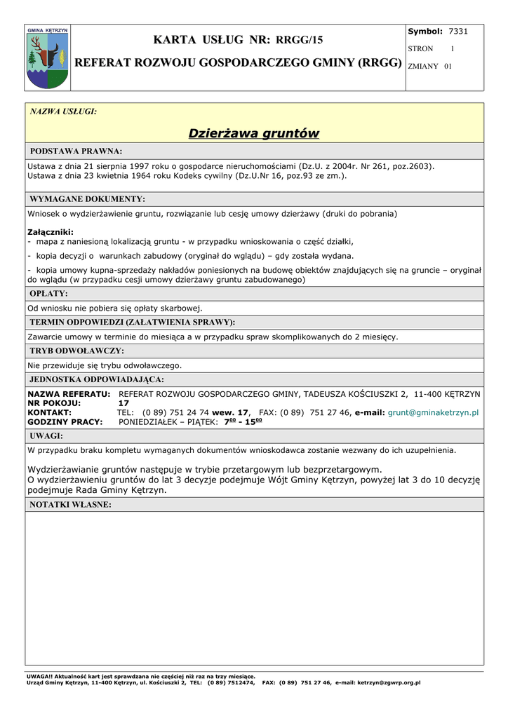 KARTA USŁUG NR: RRGG/15 REFERAT ROZWOJU GOSPODARCZEGO GMINY (RRGG) Symbol: 7331 STRON 1 ZMIANY 01 NAZWA USŁUGI: Dzierżawa gruntów PODSTAWA PRAWNA: Ustawa z dnia 21 sierpnia 1997 roku o gospodarce nieruchomościami (Dz.U. z 2004r. Nr 261, poz.2603). Ustawa z dnia 23 kwietnia 1964 roku Kodeks cywilny (Dz.U.Nr 16, poz.93 ze zm.). WYMAGANE DOKUMENTY: Wniosek o wydzierżawienie gruntu, rozwiązanie lub cesję umowy dzierżawy (druki do pobrania) Załączniki: - mapa z naniesioną lokalizacją gruntu - w przypadku wnioskowania o część działki, - kopia decyzji o warunkach zabudowy (oryginał do wglądu) – gdy została wydana. - kopia umowy kupna-sprzedaży nakładów poniesionych na budowę obiektów znajdujących się na gruncie – oryginał do wglądu (w przypadku cesji umowy dzierżawy gruntu zabudowanego) OPŁATY: Od wniosku nie pobiera się opłaty skarbowej. TERMIN ODPOWIEDZI (ZAŁATWIENIA SPRAWY): Zawarcie umowy w terminie do miesiąca a w przypadku spraw skomplikowanych do 2 miesięcy. TRYB ODWOŁAWCZY: Nie przewiduje się trybu odwoławczego. JEDNOSTKA ODPOWIADAJĄCA: NAZWA REFERATU: REFERAT ROZWOJU GOSPODARCZEGO GMINY, TADEUSZA KOŚCIUSZKI 2, 11-400 KĘTRZYN NR POKOJU: 17 KONTAKT: TEL: (0 89) 751 24 74 wew. 17, FAX: (0 89) 751 27 46, e-mail: [email protected] GODZINY PRACY: PONIEDZIAŁEK – PIĄTEK: 700 - 1500 UWAGI: W przypadku braku kompletu wymaganych dokumentów wnioskodawca zostanie wezwany do ich uzupełnienia. Wydzierżawianie gruntów następuje w trybie przetargowym lub bezprzetargowym. O wydzierżawieniu gruntów do lat 3 decyzje podejmuje Wójt Gminy Kętrzyn, powyżej lat 3 do 10 decyzję podejmuje Rada Gminy Kętrzyn. NOTATKI WŁASNE: UWAGA!! Aktualność kart jest sprawdzana nie częściej niż raz na trzy miesiące. Urząd Gminy Kętrzyn, 11-400 Kętrzyn, ul. Kościuszki 2, TEL: (0 89) 7512474, FAX: (0 89) 751 27 46, e-mail: [email protected]