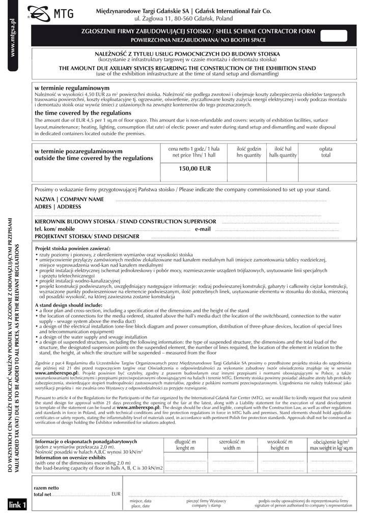 www.mtgsa.pl Międzynarodowe Targi Gdańskie SA | Gdańsk International Fair Co. ul. Żaglowa 11, 80-560 Gdańsk, Poland ZGŁOSZENIE FIRMY ZABUDOWUJĄCEJ STOISKO / SHELL SCHEME CONTRACTOR FORM POWIERZCHNIA NIEZABUDOWANA/ NO BOOTH SPACE NALEŻNOŚĆ Z TYTUŁU USŁUG POMOCNICZYCH DO BUDOWY STOISKA (korzystanie z infrastruktury targowej w czasie montażu i demontażu stoiska) THE AMOUNT DUE AXILIARY SEVICES REGARDING THE CONSTRUCTION OF THE EXHIBITION STAND (use of the exhibition infrastructure at the time of stand setup and dismantling) w terminie regulaminowym Należność w wysokości 4,50 EUR za m2 powierzchni stoiska. Należność nie podlega zwrotowi i obejmuje koszty zabezpieczenia obiektów targowych trasowania powierzchni, koszty eksploatacyjne tj. ogrzewanie, oświetlenie, zryczałtowane koszty zużycia energii elektrycznej i wody podczas montażu i demontażu stoisk oraz wywóz śmieci z ustawionych na zewnątrz kontenerów do tego przeznaczonych. the time covered by the regulations The amount due of EUR 4,5 per 1 sq.m of floor space. This amount due is non-refundable and covers: security of exhibition facilities, surface layout,mainetenance; heating, lighting, consumption (flat rate) of electic power and water during stand setup and dismantling and waste disposal in dedicated containers located outside the premises. w terminie pozaregulaminowym outside the time covered by the regulations cena netto 1 godz./ 1 hala net price 1hrs/ 1 hall ilość godzin hrs quantity ilość hal halls quantity opłata total 150,00 EUR Prosimy o wskazanie firmy przygotowującej Państwa stoisko / Please indicate the company commissioned to set up your stand. NAZWA | COMPANY NAME ADRES | ADDRESS ............................................................................................................................................................................... DO WSZYSTKICH CEN NALEŻY DOLICZYĆ NALEŻNY PODATEK VAT ZGODNIE Z OBOWIĄZUJĄCYMI PRZEPISAMI VALUE ADDED TAX (VAT) DUE IS TO BE ADDED TO ALL PRICES, AS PER THE RELEVANT REGULATIONS .............................................................................................................................................................................................................................................. KIEROWNIK BUDOWY STOISKA / STAND CONSTRUCTION SUPERVISOR ................................................................................................. tel. kom/ mobile ........................................................................................... e-mail ....................................................................................................... PROJEKTANT STOISKA/ STAND DESIGNER ............................................................................................................................................................ Projekt stoiska powinien zawierać: • rzuty poziomy i pionowy, z określeniem wymiarów oraz wysokości stoiska • umiejscowienie przyłączy zamówionych mediów zlokalizowane nad kanałem medialnym hali (miejsce zamontowania tablicy rozdzielczej, miejsce wyprowadzenia wod-kan nad kanałem medialnym) • projekt instalacji elektrycznej (schemat jednokreskowy i pobór mocy, rozmieszczenie urządzeń trójfazowych, usytuowanie linii specjalnych i sprzętu teletechnicznego) • projekt instalacji wodno-kanalizacyjnej • projekt konstrukcji podwieszanych, uwzględniający następujące informacje: rodzaj podwieszanej konstrukcji, gabaryty i całkowity ciężar konstrukcji, wyznaczone punkty podwieszeniowe na elemencie podwieszanym, ilość potrzebnych linek, usytuowanie elementu w stosunku do stoiska, mierzoną od posadzki wysokość, na której zawieszona zostanie konstrukcja A stand design should include: • a floor plan and cross-section, including a specification of the dimensions and the height of the stand • the location of connections for the media ordered, situated above the hall’s media duct (the location of the switchboard, connection to the water supply - sewage system above the media duct) • a design of the electrical installation (one-line block diagram and power consumption, distribution of three-phase devices, location of special lines and telecommunication equipment) • a design of the water supply and sewage installation • a design of suspended structures, including the following information: the type of suspended structure, the dimensions and the total load of the structure, the designated suspension points on the suspended element, the number of lines required, the location of the element in relation to the stand, the height, at which the structure will be suspended – measured from the floor Zgodnie z par.4 Regulaminu dla Uczestników Targów Organizowanych przez Międzynarodowe Targi Gdańskie SA prosimy o przedłożone projektu stoiska do uzgodnienia nie później niż 21 dni przed rozpoczęciem targów oraz Oświadczenia o odpowiedzialności za wykonanie zabudowy (wzór oświadczenia znajduje się w serwisie www.amberexpo.pl). Projekt powinien być czytelny, zgodny z prawem budowlanym oraz innymi przepisami i normami obowiązującymi w Polsce, a także uwarunkowaniami technicznymi i przepisami przeciwpożarowymi obowiązującymi na halach i terenie MTG. Elementy stoiska powinny posiadać aktualne atesty lub protokoły zabezpieczenia, stwierdzające stopień trudnopalności zastosowanych materiałów, zgodnie z polskimi normami przeciwpożarowymi. Uzgodnienia nie należy traktować jako weryfikacji projektu i nie zwalnia ono Wystawcy z odpowiedzialności za przyjęte rozwiązanie. Pursuant to article 4 of the Regulations for the Participants of the Fair organized by the International Gdańsk Fair Center (MTG), we would like to kindly request that you submit the stand design for approval within 21 days preceding the opening of the fair at the latest, along with a Liability statement for the execution of stand development (a template o