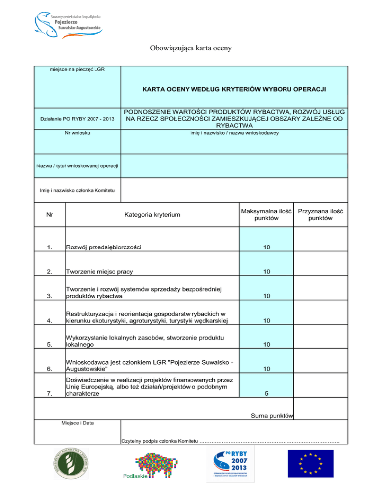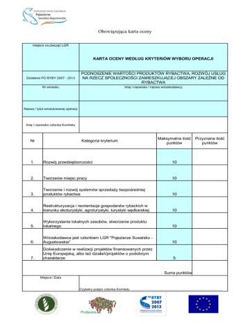 Obowiązująca karta oceny miejsce na pieczęć LGR KARTA OCENY WEDŁUG KRYTERIÓW WYBORU OPERACJI Działanie PO RYBY 2007 - 2013 PODNOSZENIE WARTOŚCI PRODUKTÓW RYBACTWA, ROZWÓJ USŁUG NA RZECZ SPOŁECZNOŚCI ZAMIESZKUJĄCEJ OBSZARY ZALEŻNE OD RYBACTWA Nr wniosku Imię i nazwisko / nazwa wnioskodawcy Nazwa / tytuł wnioskowanej operacji Imię i nazwisko członka Komitetu Nr Kategoria kryterium Maksymalna ilość punktów 1. Rozwój przedsiębiorczości 10 2. Tworzenie miejsc pracy 10 3. Tworzenie i rozwój systemów sprzedaży bezpośredniej produktów rybactwa 10 4. Restrukturyzacja i reorientacja gospodarstw rybackich w kierunku ekoturystyki, agroturystyki, turystyki wędkarskiej 10 5. Wykorzystanie lokalnych zasobów, stworzenie produktu lokalnego 10 6. Wnioskodawca jest członkiem LGR "Pojezierze Suwalsko Augustowskie" 10 7. Doświadczenie w realizacji projektów finansowanych przez Unię Europejską, albo też działań/projektów o podobnym charakterze 5 Przyznana ilość punktów Suma punktów Miejsce i Data Czytelny podpis członka Komitetu ………………………………………………………………………. Podpisy członków Komisji Skrutacyjnej 1. ………………………………………………… 2. ………………………………………….. Instrukcja wypełniania karty 1. Pola zacienione wypełnia Biuro LGR. 2. Członek Komitetu wpisuje swoje nazwisko w wierszu: Imię i nazwisko członka Komitetu 3. Członek Komitetu wpisuje przyznaną liczbę punktów w kolumnie: Przyznana ilość punktów oraz sumę punktów w wierszu: Suma punktów 4.Członek Komitetu wpisuje miejsce i datę wypełnienia karty w wierszu: Miejsce i data 5. Członek Komitetu podpisuje Kartę w miejscu: Czytelny podpis członka Komitetu 6. Członkowie Komisji Skrutacyjnej sprawdzają prawidłowość wypełnienia Karty i podpisują się w wierszu: Podpisy członków Komisji Skrutacyjnej Uwaga: Karty powinny być wypełnione czytelnie i trwale (długopisem lub piórem). Nie wpisanie nazwiska, miejsca, daty i czytelnego podpisu przez członka Komitetu skutkuje nieważnością karty. Zmieniona karta oceny miejsce na pieczęć LGR KARTA OCENY WEDŁUG KRYTERIÓW WYBORU OPERACJI Działanie PO RYBY 2007 - 2013 PODNOSZENIE WARTOŚCI PRODUKTÓW RYBACTWA, ROZWÓJ USŁUG NA RZECZ SPOŁECZNOŚCI ZAMIESZKUJĄCEJ OBSZARY ZALEŻNE OD RYBACTWA Nr wniosku Imię i nazwisko / nazwa wnioskodawcy Nazwa / tytuł wnioskowanej operacji Imię i nazwisko członka Komitetu Nr Kategoria kryterium Maksymalna ilość punktów 1. Rozwój przedsiębiorczości 10 2. Tworzenie miejsc pracy 10 3. Tworzenie i rozwój systemów sprzedaży bezpośredniej produktów rybactwa 10 4. Operacja dotyczy rozwoju turystyki w tym ekoturystyki, agroturystki, turystyki wędkarskiej na obszarze LSROR 10 5. Wykorzystanie lokalnych zasobów, stworzenie produktu lokalnego 10 6. Wnioskodawca jest członkiem LGR "Pojezierze Suwalsko Augustowskie" 10 7. Doświadczenie w realizacji projektów finansowanych przez Unię Europejską, albo też działań/projektów o podobnym charakterze 5 Suma punktów Przyznana ilość punktów Miejsce i Data Czytelny podpis członka Komitetu ………………………………………………………………………. Podpisy członków Komisji Skrutacyjnej 1. ………………………………………………… 2. ………………………………………….. Instrukcja wypełniania karty 1. Pola zacienione wypełnia Biuro LGR. 2. Członek Komitetu wpisuje swoje nazwisko w wierszu: Imię i nazwisko członka Komitetu 3. Członek Komitetu wpisuje przyznaną liczbę punktów w kolumnie: Przyznana ilość punktów oraz sumę punktów w wierszu: Suma punktów 4.Członek Komitetu wpisuje miejsce i datę wypełnienia karty w wierszu: Miejsce i data 5. Członek Komitetu podpisuje Kartę w miejscu: Czytelny podpis członka Komitetu 6. Członkowie Komisji Skrutacyjnej sprawdzają prawidłowość wypełnienia Karty i podpisują się w wierszu: Podpisy członków Komisji Skrutacyjnej Uwaga: Karty powinny być wypełnione czytelnie i trwale (długopisem lub piórem). Nie wpisanie nazwiska, miejsca, daty i czytelnego podpisu przez członka Komitetu skutkuje nieważnością karty.