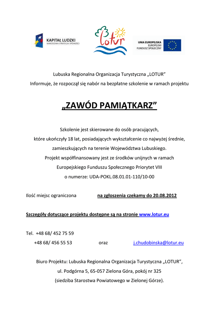 Lubuska Regionalna Organizacja Turystyczna „LOTUR” Informuje, że rozpoczął się nabór na bezpłatne szkolenie w ramach projektu „ZAWÓD PAMIĄTKARZ” Szkolenie jest skierowane do osób pracujących, które ukończyły 18 lat, posiadających wykształcenie co najwyżej średnie, zamieszkujących na terenie Województwa Lubuskiego. Projekt współfinansowany jest ze środków unijnych w ramach Europejskiego Funduszu Społecznego Priorytet VIII o numerze: UDA-POKL.08.01.01-110/10-00 Ilość miejsc ograniczona na zgłoszenia czekamy do 20.08.2012 Szczegóły dotyczące projektu dostępne są na stronie www.lotur.eu Tel. +48 68/ 452 75 59 +48 68/ 456 55 53 oraz [email protected] Biuro Projektu: Lubuska Regionalna Organizacja Turystyczna „LOTUR”, ul. Podgórna 5, 65-057 Zielona Góra, pokój nr 325 (siedziba Starostwa Powiatowego w Zielonej Górze).