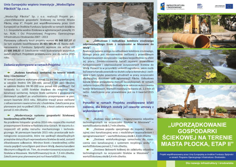 Unia Europejska wspiera inwestycje „Wodociągów Płockich” Sp. z o.o. ,,Wodociągi Płockie” Sp. z o.o. realizują Projekt pn.: „Uporządkowanie gospodarki ściekowej na terenie Miasta Płocka, etap II”. Projekt jest współfinansowany przez Unię Europejską ze środków Funduszu Spójności w ramach działania 1.1. Gospodarka wodno-ściekowa w aglomeracjach powyżej 15 tys. RLM, I Osi Priorytetowej Programu Operacyjnego Infrastruktura i Środowisko 2007 – 2013 Planowany całkowity koszt projektu wynosi 45 949 557,37 zł (w tym wydatki kwalifikowane 25 421 585,90 zł). Kwota dofinansowania z Funduszu Spójności wyniesie nie więcej niż 21 608 348,02 zł. Zakończenie robót budowlanych wszystkich zadań objętych Projektem przewidywane jest do końca 2015 roku. Zadania wykonywane w ramach Projektu: ,,Odbudowa i rozbudowa kolektora zrzutowego odprowadzającego ścieki z oczyszczalni w Maszewie do Wisły”. Realizacja zadania polega na odbudowie kolektora zrzutowego, którego praca jest nierozerwalnie związana z prawidłowym funkcjonowaniem oczyszczalni i wpływa bezpośrednio na efekt jej pracy. Zmodernizowany kanał zapewni prawidłowe funkcjonowanie i odprowadzanie oczyszczonych ścieków do Wisły. Pozwoli to w przyszłości uniknąć zagrożenia, jakim może być awaria kanału powstała na skutek zużycia konstrukcji i związane z tym ryzyko powstania utrudnień w pracy oczyszczalni obsługującej docelowo całą aglomerację Płocka. Odbudowa kanału będzie prowadzona metodą bezwykopową. W ramach zadania rozpoczęto roboty budowlane w zakresie wykonywania komór żelbetowych. Wartość inwestycji to kwota ok. 2,0 mln zł netto. Zakończenie prac przewidziane jest na II kwartał 2015 roku. „Budowa kanalizacji sanitarnej na terenie osiedli Góry i Ciechomice” W ramach zadania wykonano ponad 11 km sieci grawitacyjnej w zakresie średnic DN 200-400, ponad 4 km sieci tłocznej w zakresie średnic DN 90-200 oraz ponad 400 podłączeń. Od listopada b.r. część ścieków dopływa do miejskiej sieci kanalizacji sanitarnej. Kolejne ścieki sanitarne z gospodarstw domowych popłyną po uruchomieniu przepompowni w pierwszym kwartale 2015 roku. Aktualnie trwają prace związane z odtworzeniem nawierzchni ulic i chodników. Zakończenie prac planowane jest na połowę 2015 roku, a koszt zadania wyniesie ponad 11 mln zł netto. Ponadto w ramach Projektu zrealizowane będą zadania, dla których zostały już zawarte umowy z wykonawcami: „Modernizacja systemu gospodarki ściekowej lewobrzeżnej części Płocka” Na przełomie listopada i grudnia 2014 roku rozpoczęto montaż przepompowni ścieków w Radziwiu oraz Górach. W styczniu b.r. rozpoczną się próby rozruchu mechanicznego i technologicznego. W pierwszym kwartale 2015 roku przestarzałe technologicznie oczyszczalnie, które nie spełniają obowiązujących przepisów dotyczących wprowadzania ścieków do wód, zostaną zlikwidowane całkowicie. Wkrótce ścieki z lewobrzeżnej części miasta popłyną rurociągiem pod dnem Wisły, dwoma kanałami tłocznymi o długości ok. 7 km, do zmodernizowanej oczyszczalni ścieków w Maszewie. Wartość inwestycji to ok. 7,3 mln zł netto. Zakończenie prac planowane jest na II kwartał 2015 roku. ,,Budowa stacji odbioru i magazynowania odpadów technologicznych na oczyszczalni ścieków w Maszewie” – wartość zadania około 3,7 mln zł netto, ,,Dostawa pojazdu specjalnego do inspekcji telewizyjnej sieci kanalizacyjnej wraz z niezbędnym wyposażeniem i oprogramowaniem” – wartość dostawy około 1,4 mln zł netto ,,Dostawa wielofunkcyjnego samochodu do czyszczenia sieci kanalizacyjnej z systemem recyklingu wody,” – wartość dostawy ponad 2,7 mln zł netto, ,,Dostawa ładowarki kołowej do załadunku odpadów technologicznych na oczyszczalni ścieków w Maszewie” – wartość dostawy około 0,4 mln zł netto. PRZYŁĄCZ SIĘ, BĄDŹ EKOLOGICZNY! Budowa kanalizacji sanitarnej na terenie osiedli Góry i Ciechomice praktycznie została zakończona. Prawdopodobnie wczesną wiosną przepompownie ścieków zostaną zaopatrzone w energię elektryczną i wówczas ścieki ze wszystkich Państwa posesji będą mogły być włączone do systemu miejskiego. Teraz jest czas na podłączenie się do kanalizacji! W tym celu należy: 1. Wykonać odcinek kanalizacji sanitarnej pomiędzy studnią rewizyjną znajdującą się na działce a budynkiem. Zalecamy zastosowanie następujących materiałów: rur kamionkowych uszczelnianych na uszczelki, z litego polipropylenu lub nieplastyfikowanego polichlorku winylu, o średnicy 160 mm i sztywności min. SN8. Wybudowane przyłącze pozostanie na majątku i w eksploatacji właściciela działki, w związku z tym, w celu uniknięcia w przyszłości awarii należy wybudować ją zgodnie ze sztuką budowlaną i należytą starannością. 4. Po bezusterkowym odbiorze zapraszamy do Biura Obsługi Klienta do siedziby Spółki przy ul. Harc. A. Gradowskiego 11 w Płocku, w celu podpisania umowy na odprowadzanie ścieków. Kontakt telefoniczny do Biura Obsługi Klienta - 24 364 42 30 lub 24 364 42 32. Do podpisania umowy niezbędne są: aktualny tytuł prawny do nieruchomości (wypis z księgi wieczystej, akt notarialny lub inny), w przypadku współwłasności nieruchomości - pełnomocnictwa do reprezentowania współwłaścicieli wydane osobie działającej w ich imieniu z czytelnym podpisem, wzór druku do pobrania na stronie internetowej: www.wodociagi.pl/artykul/wnioski-i-formularze-do-pobrania Dokument taki jest niezbędny do jednoznacznego sprecyzowania w umowie prawa własności właściciela nieruchomości. dowód osobisty. 5. Jednocześnie informujemy, iż na potrzeby zawarcia umowy na odprowadzanie ścieków, nie jest konieczne opracowanie projektu technicznego przyłącza kanalizacyjnego na odcinku od studni do budynku. Podłączenie do sieci kanalizacyjnej przyniesie wymierne korzyści każdemu użytkownikowi, m.in.: 