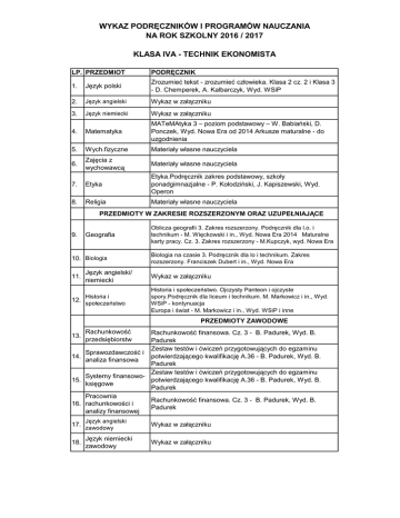 WYKAZ PODRĘCZNIKÓW I PROGRAMÓW NAUCZANIA NA ROK SZKOLNY 2016 / 2017 KLASA IVA - TECHNIK EKONOMISTA LP. PRZEDMIOT PODRĘCZNIK 1. Język polski Zrozumieć tekst - zrozumieć człowieka. Klasa 2 cz. 2 i Klasa 3 - D. Chemperek, A. Kalbarczyk, Wyd. WSiP 2. Język angielski Wykaz w załączniku 3. Język niemiecki Wykaz w załączniku 4. Matematyka MATeMAtyka 3 – poziom podstawowy – W. Babiański, D. Ponczek, Wyd. Nowa Era od 2014 Arkusze maturalne - do uzgodnienia 5. Wych.fizyczne Materiały własne nauczyciela 6. Zajęcia z wychowawcą Materiały własne nauczyciela 7. Etyka Etyka.Podręcznik zakres podstawowy, szkoły ponadgimnazjalne - P. Kołodziński, J. Kapiszewski, Wyd. Operon 8. Religia Materiały własne nauczyciela PRZEDMIOTY W ZAKRESIE ROZSZERZONYM ORAZ UZUPEŁNIAJĄCE 9. Geografia 10. Biologia 11. Język angielski/ niemiecki Historia i 12. społeczeństwo Oblicza geografii 3. Zakres rozszerzony. Podręcznik dla l.o. i technikum - M. Więckowski i in., Wyd. Nowa Era 2014 Maturalne karty pracy. Cz. 3. Zakres rozszerzony - M.Kupczyk, wyd. Nowa Era Biologia na czasie 3. Podręcznik dla lo i technikum. Zakres rozszerzony. Franciszek Dubert i in., Wyd. Nowa Era Wykaz w załączniku Historia i społeczeństwo. Ojczysty Panteon i ojczyste spory.Podręcznik dla liceum i technikum. M. Markowicz i in., Wyd. WSiP - kontynuacja Europa i świat - M. Markowicz i in., Wyd. WSiP i inne PRZEDMIOTY ZAWODOWE 13. Rachunkowość przedsiębiorstw 17. Język angielski zawodowy Wykaz w załączniku 18. Język niemiecki zawodowy Wykaz w załączniku Rachunkowość finansowa. Cz. 3 - B. Padurek, Wyd. B. Padurek Zestaw testów i ćwiczeń przygotowujących do egzaminu Sprawozdawczość i 14. potwierdzającego kwalifikację A.36 - B. Padurek, Wyd. B. analiza finansowa Padurek Zestaw testów i ćwiczeń przygotowujących do egzaminu Systemy finansowo15. potwierdzającego kwalifikację A.36 - B. Padurek, Wyd. B. księgowe Padurek Pracownia Rachunkowość finansowa. Cz. 3 - B. Padurek, Wyd. B. 16. rachunkowości i Padurek analizy finansowej