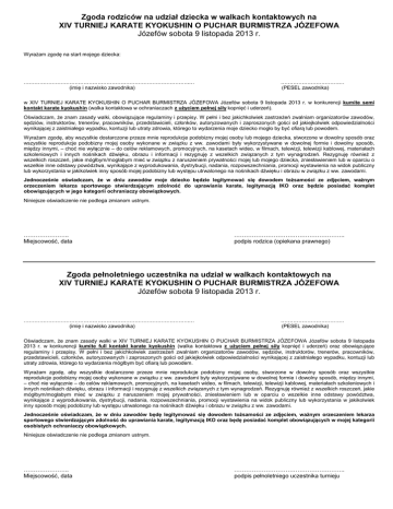 Zgoda rodziców na udział dziecka w walkach kontaktowych na XIV TURNIEJ KARATE KYOKUSHIN O PUCHAR BURMISTRZA JÓZEFOWA Józefów sobota 9 listopada 2013 r. Wyrażam zgodę na start mojego dziecka: ………………………………………………………………………………….… (imię i nazwisko zawodnika) ……………………………… (PESEL zawodnika) w XIV TURNIEJ KARATE KYOKUSHIN O PUCHAR BURMISTRZA JÓZEFOWA Józefów sobota 9 listopada 2013 r. w konkurencji kumite semi kontakt karate kyokushin (walka kontaktowa w ochraniaczach z użyciem pełnej siły kopnięć i uderzeń). Oświadczam, że znam zasady walki, obowiązujące regulaminy i przepisy. W pełni i bez jakichkolwiek zastrzeżeń zwalniam organizatorów zawodów, sędziów, instruktorów, trenerów, pracowników, przedstawicieli, członków, autoryzowanych i zaproszonych gości od jakiejkolwiek odpowiedzialności wynikającej z zaistniałego wypadku, kontuzji lub utraty zdrowia, którego to wydarzenia moje dziecko mogło by być ofiarą lub powodem. Wyrażam zgodę, aby wszystkie dostarczone przeze mnie reprodukcje podobizny mojej osoby lub mojego dziecka, stworzone w dowolny sposób oraz wszystkie reprodukcje podobizny mojej osoby wykonane w związku z ww. zawodami były wykorzystywane w dowolnej formie i dowolny sposób, między innymi, – choć nie wyłącznie – do celów reklamowych, promocyjnych, na kasetach wideo, w filmach, telewizji, telewizji kablowej, materiałach szkoleniowych i innych nośnikach dźwięku, obrazu i informacji i rezygnuję z wszelkich związanych z tym wynagrodzeń. Rezygnuję również z wszelkich roszczeń, jakie mógłbym/mogłabym mieć w związku z naruszeniem prywatności mojej lub mojego dziecka, zniesławieniem lub w oparciu o wszelkie inne odstawy powództwa, wynikające z wyprodukowania, dystrybucji, nadania, rozpowszechniania, promocji wystawienia na widok publiczny lub wykorzystania w jakikolwiek inny sposób mojej podobizny lub występu utrwalonego na nośnikach dźwięku i obrazu w związku z ww. zawodami. Jednocześnie oświadczam, że w dniu zawodów moje dziecko będzie legitymować się dowodem tożsamości ze zdjęciem, ważnym orzeczeniem lekarza sportowego stwierdzającym zdolność do uprawiania karate, legitymacją IKO oraz będzie posiadać komplet obowiązujących w jego kategorii ochraniaczy obowiązkowych. Niniejsze oświadczenie nie podlega zmianom ustnym. ………………….. Miejscowość, data ……………………………………………….. podpis rodzica (opiekana prawnego) Zgoda pełnoletniego uczestnika na udział w walkach kontaktowych na XIV TURNIEJ KARATE KYOKUSHIN O PUCHAR BURMISTRZA JÓZEFOWA Józefów sobota 9 listopada 2013 r. ………………………………………………………………………………….… (imię i nazwisko zawodnika) ……………………………… (PESEL zawodnika) Oświadczam, że znam zasady walki w XIV TURNIEJ KARATE KYOKUSHIN O PUCHAR BURMISTRZA JÓZEFOWA Józefów sobota 9 listopada 2013 r. w konkurencji kumite full kontakt karate kyokushin (walka kontaktowa z użyciem pełnej siły kopnięć i uderzeń) oraz obowiązujące regulaminy i przepisy. W pełni i bez jakichkolwiek zastrzeżeń zwalniam organizatorów zawodów, sędziów, instruktorów, trenerów, pracowników, przedstawicieli, członków, autoryzowanych i zaproszonych gości od jakiejkolwiek odpowiedzialności wynikającej z zaistniałego wypadku, kontuzji lub utraty zdrowia, którego to wydarzenia mógłbym być ofiarą lub powodem. Wyrażam zgodę, aby wszystkie dostarczone przeze mnie reprodukcje podobizny mojej osoby, stworzone w dowolny sposób oraz wszystkie reprodukcje podobizny mojej osoby wykonane w związku z ww. zawodami były wykorzystywane w dowolnej formie i dowolny sposób, między innymi, – choć nie wyłącznie – do celów reklamowych, promocyjnych, na kasetach wideo, w filmach, telewizji, telewizji kablowej, materiałach szkoleniowych i innych nośnikach dźwięku, obrazu i informacji i rezygnuję z wszelkich związanych z tym wynagrodzeń. Rezygnuję również z wszelkich roszczeń, jakie mógłbym/mogłabym mieć w związku z naruszeniem mojej prywatności, zniesławieniem lub w oparciu o wszelkie inne odstawy powództwa, wynikające z wyprodukowania, dystrybucji, nadania, rozpowszechniania, promocji wystawienia na widok publiczny lub wykorzystania w jakikolwiek inny sposób mojej podobizny lub występu utrwalonego na nośnikach dźwięku i obrazu w związku z ww. zawodami. Jednocześnie oświadczam, że w dniu zawodów będę legitymować się dowodem tożsamości ze zdjęciem, ważnym orzeczeniem lekarza sportowego stwierdzającym zdolność do uprawiania karate, legitymacją IKO oraz będę posiadać komplet obowiązujących w mojej kategorii osobistych ochraniaczy obowiązkowych. Niniejsze oświadczenie nie podlega zmianom ustnym. ………………….. Miejscowość, data ……………………………………………….. podpis pełnoletniego uczestnika turnieju