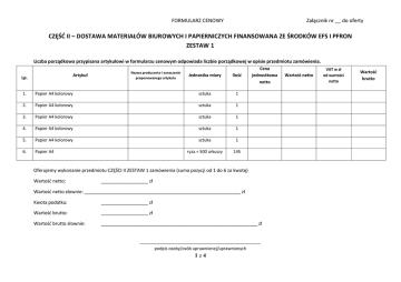 FORMULARZ CENOWY Załącznik nr __ do oferty CZĘŚĆ II – DOSTAWA MATERIAŁÓW BIUROWYCH I PAPIERNICZYCH FINANSOWANA ZE ŚRODKÓW EFS I PFRON ZESTAW 1 Liczba porządkowa przypisana artykułowi w formularzu cenowym odpowiada liczbie porządkowej w opisie przedmiotu zamówienia. Artykuł Lp. Nazwa producenta i oznaczenie proponowanego artykułu Jednostka miary Ilość 1. Papier A4 kolorowy sztuka 1 2. Papier A4 kolorowy sztuka 1 3. Papier A4 kolorowy sztuka 1 4. Papier A4 kolorowy sztuka 1 5. Papier A4 kolorowy sztuka 1 6. Papier A4 ryza = 500 arkuszy 145 Cena jednostkowa netto Oferujemy wykonanie przedmiotu CZĘŚCI II ZESTAW 1 zamówienia (suma pozycji od 1 do 6 za kwotę) Wartość netto: __________________ zł Wartość netto słownie: ____________________________________________________________ zł Kwota podatku: __________________ zł Wartość brutto: __________________ zł Wartość brutto słownie: ____________________________________________________________ zł ___________________________________________________ podpis osoby/osób uprawnionej/uprawnionych 1z4 Wartość netto VAT w zł od wartości netto Wartość brutto ZESTAW 2 Lp. 1. 2. 3. 4. 5. 6. 7. 8. 9. 10. 11. Artykuł Nazwa producenta i oznaczenie proponowanego artykułu Jednostka miary Ilość Bloczek samoprzylepny 76 x 76 sztuka 16 Bloczki samoprzylepne 76 x 127 sztuka 16 Bloczek samoprzylepny 38 x 51 opakowanie = 3 bloczki 15 Cienkopis czarny sztuka 6 Cienkopis czerwony sztuka 6 Cienkopis zielony sztuka 6 opakowanie = 100 sztuk 12 sztuka 10 Płyty DVD+R opakowanie = 25 sztuk 3 Przekładki indeksujące kartonowe 1-31 opakowanie = 31 kart 15 sztuka 10 Koszulki krystaliczne A4 Marker cienki do płyt Segregator A4 50 mm Cena jednostkowa netto ___________________________________________________ podpis osoby/osób uprawnionej/uprawnionych 2z4 Wartość netto VAT w zł od wartości netto Wartość brutto Lp. 12. 13. 14. 15. 16. 17. Nazwa producenta i oznaczenie proponowanego artykułu Artykuł Jednostka miary Ilość Segregator A4 75 mm sztuka 40 Skoroszyt plastikowy zawieszany sztuka 200 opakowanie = 50 sztuk 15 bloczek 15 opakowanie = 1000 sztuk 6 ryza = 500 arkuszy 140 Spinacze Zakładki indeksujące Zszywki 24/6 Papier A4 Cena jednostkowa netto Oferujemy wykonanie przedmiotu CZĘŚCI II ZESTAW 2 zamówienia (suma pozycji od 1 do 17 za kwotę) Wartość netto: __________________ zł Wartość netto słownie: ____________________________________________________________ zł Kwota podatku: __________________ zł Wartość brutto: __________________ zł Wartość brutto słownie: ____________________________________________________________ zł ___________________________________________________ podpis osoby/osób uprawnionej/uprawnionych 3z4 Wartość netto VAT w zł od wartości netto Wartość brutto ZESTAW 3 Lp. 1. Artykuł Nazwa producenta i oznaczenie proponowanego artykułu Papier A4 Jednostka miary Ilość ryza = 500 arkuszy 115 Cena jednostkowa netto Oferujemy wykonanie przedmiotu CZĘŚCI II ZESTAW 3 za kwotę Wartość netto: __________________ zł Wartość netto słownie: ____________________________________________________________ zł Kwota podatku: __________________ zł Wartość brutto: __________________ zł Wartość brutto słownie: ____________________________________________________________ zł RAZEM CZĘŚĆ II SUMA ZESTAWÓW OD 1 DO 3 Wartość netto: __________________ zł Wartość netto słownie: ____________________________________________________________ zł Kwota podatku: __________________ zł Wartość brutto: __________________ zł Wartość brutto słownie: ____________________________________________________________ zł ___________________________________________________ podpis osoby/osób uprawnionej/uprawnionych do reprezentowania wykonawcy, do występowania w obrocie prawnym i składania oświadczeń woli w jego imieniu 4z4 Wartość netto VAT w zł od wartości netto Wartość brutto