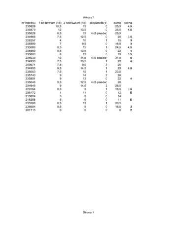 Arkusz1 nr indeksu 235629 235879 235028 234966 226257 235599 235086 235559 230603 235039 234930 209671 234953 235050 235740 235851 235046 234946 229164 235172 213624 218258 235568 235654 201713 1 kolokwium (15) 2 kolokwium (15) 10,5 15 12 13,5 6,5 15 7,5 12,5 4 10 7 9,5 8,5 15 9,5 12,5 6 13 13 14,5 7,5 13,5 7,5 9,5 9,5 14,5 7,5 15 9 14 9 13 9,5 12,5 9 14,5 8,5 9 1 11 5 9 5 6 6,5 13 8,5 8 0 0 aktywność(4) 0 0 4 (5 plusów) 0 1 0 1 0 0 4 (9 plusów) 1 3 1 1 3 0 4 (5 plusów) 3 1 0 0 0 1 0 0 Strona 1 suma ocena 25,5 4,5 25,5 4,5 25,5 20 3,5 15 3 16,5 3 24,5 4,5 22 4 19 3,5 31,5 5 22 4 20 25 4,5 23,5 26 22 4 26 26,5 18,5 3,5 12 E 14 11 E 20,5 16,5 3 0 2