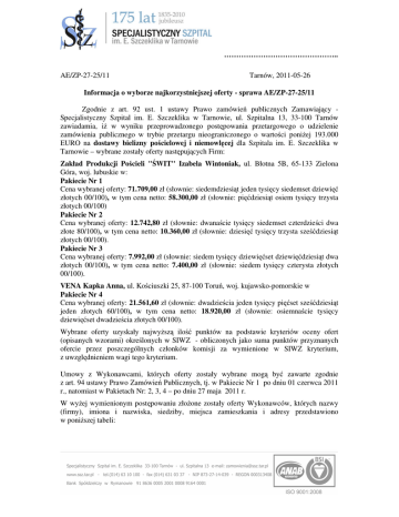 ……………………………………….. AE/ZP-27-25/11 Tarnów, 2011-05-26 Informacja o wyborze najkorzystniejszej oferty - sprawa AE/ZP-27-25/11 Zgodnie z art. 92 ust. 1 ustawy Prawo zamówień publicznych Zamawiający Specjalistyczny Szpital im. E. Szczeklika w Tarnowie, ul. Szpitalna 13, 33-100 Tarnów zawiadamia, iż w wyniku przeprowadzonego postępowania przetargowego o udzielenie zamówienia publicznego w trybie przetargu nieograniczonego o wartości poniżej 193.000 EURO na dostawy bielizny pościelowej i niemowlęcej dla Szpitala im. E. Szczeklika w Tarnowie – wybrane zostały oferty następujących Firm: Zakład Produkcji Pościeli "ŚWIT" Izabela Wintoniak, ul. Błotna 5B, 65-133 Zielona Góra, woj. lubuskie w: Pakiecie Nr 1 Cena wybranej oferty: 71.709,00 zł (słownie: siedemdziesiąt jeden tysięcy siedemset dziewięć złotych 00/100), w tym cena netto: 58.300,00 zł (słownie: pięćdziesiąt osiem tysięcy trzysta złotych 00/100) Pakiecie Nr 2 Cena wybranej oferty: 12.742,80 zł (słownie: dwanaście tysięcy siedemset czterdzieści dwa złote 80/100), w tym cena netto: 10.360,00 zł (słownie: dziesięć tysięcy trzysta sześćdziesiąt złotych 00/100). Pakiecie Nr 3 Cena wybranej oferty: 7.992,00 zł (słownie: siedem tysięcy dziewięćset dziewięćdziesiąt dwa złotych 00/100), w tym cena netto: 7.400,00 zł (słownie: siedem tysięcy czterysta złotych 00/100). VENA Kapka Anna, ul. Kościuszki 25, 87-100 Toruń, woj. kujawsko-pomorskie w Pakiecie Nr 4 Cena wybranej oferty: 21.561,60 zł (słownie: dwadzieścia jeden tysięcy pięćset sześćdziesiąt jeden złotych 60/100), w tym cena netto: 18.920,00 zł (słownie: osiemnaście tysięcy dziewięćset dwadzieścia złotych 00/100). Wybrane oferty uzyskały najwyższą ilość punktów na podstawie kryteriów oceny ofert (opisanych wzorami) określonych w SIWZ - obliczonych jako suma punktów przyznanych ofercie przez poszczególnych członków komisji za wymienione w SIWZ kryterium, z uwzględnieniem wagi tego kryterium. Umowy z Wykonawcami, których oferty zostały wybrane mogą być zawarte zgodnie z art. 94 ustawy Prawo Zamówień Publicznych, tj. w Pakiecie Nr 1 po dniu 01 czerwca 2011 r., natomiast w Pakietach Nr: 2, 3, 4 – po dniu 27 maja 2011 r. W wyżej wymienionym postępowaniu złożone zostały oferty Wykonawców, których nazwy (firmy), imiona i nazwiska, siedziby, miejsca zamieszkania i adresy przedstawiono w poniższej tabeli: Nr Nazwy (firmy), imiona i nazwiska, siedziby, miejsca oferty zamieszkania i adresy Wykonawcy "METALPOL" Marek Polaczek Zakład ProdukcyjnoI Handlowy, ul. Grunwaldzka 33, 91-337 Łódź, woj. łódzkie Zakład Produkcji Pościeli "ŚWIT" Izabela Wintoniak, II ul. Błotna 5B, 65-133 Zielona Góra, woj. lubuskie VENA Kapka Anna, ul. Kościuszki 25, 87-100 Toruń, III woj. kujawsko-pomorskie Pakiety, w których Wykonawca złożył ofertę Pakiety Nr: 1, 2, 3, 4 Pakiety Nr: 1, 2, 3 Pakiety Nr: 1, 2, 3, 4 Punktację przyznaną ofertom w każdym kryterium oceny ofert i łączną punktację przedstawiono poniżej: Pakiet Nr 1 Numer oferty Liczba punktów w kryterium cena brutto Razem Oferta Nr I 283,55 283,55 Oferta Nr II 500,00 500,00 Pakiet Nr 2 Numer oferty Liczba punktów w kryterium cena brutto Razem Oferta Nr I 368,40 368,40 Oferta Nr II 500,00 500,00 Oferta Nr III 437,50 437,50 Pakiet Nr 3 Numer oferty Liczba punktów w kryterium cena brutto Razem Oferta Nr I 304,15 304,15 Oferta Nr II 500,00 500,00 Oferta Nr III 462,15 462,15 Pakiet Nr 4 Numer oferty Liczba punktów w kryterium cena brutto Razem Oferta Nr I 466,40 466,40 Oferta Nr III 500,00 500,00 W niniejszym postępowaniu nie wykluczono żadnego Wykonawcy Informacja o Wykonawcach których oferty zostały odrzucone - sprawa AE/ZP-27-25/11 Zamawiający zgodnie z art. 92 ust. 1 pkt. 2 ustawy Prawo Zamówień publicznych zawiadamia Wykonawców, którzy złożyli oferty do postępowaniu w sprawie udzielenia zamówienia publicznego prowadzonego w trybie przetargu nieograniczonego o wartości poniżej 193.000 EURO na dostawy bielizny pościelowej i niemowlęcej, iż: − na podstawie art. 89 ust. 1 pkt 2 cytowanej ustawy odrzucił w Pakiecie Nr 1 ofertę złożoną przez VENA Kapka Anna, ul. Kościuszki 25, 87-100 Toruń, woj. kujawsko- pomorskie (dalej Wykonawca). Zgodnie z wymaganiami określonymi w pkt IV.4.2 do oferty należało załączyć próbki kolorów materiałów z których uszyty będzie asortyment oferowany w Pakiecie 1 poz. 1 – 3 (Zamawiający wymagał kolorów: jasna zieleń, żółty, pomarańczowy, jasnoniebieski, ecru). Wykonawca nie załączył do oferty próbki kolorów materiałów z których uszyty będzie asortyment oferowany w Pakiecie 1 poz. 1 – 3, natomiast na wezwanie Zamawiającego przysłał tyko próbki w kolorze: żółtym, jasnozielonym i pomarańczowym. W związku z czym oferta została odrzucona. Otrzymują: 1. Wszyscy Wykonawcy którzy złożyli oferty 2. Strona internetowa Zamawiającego 3. a/a