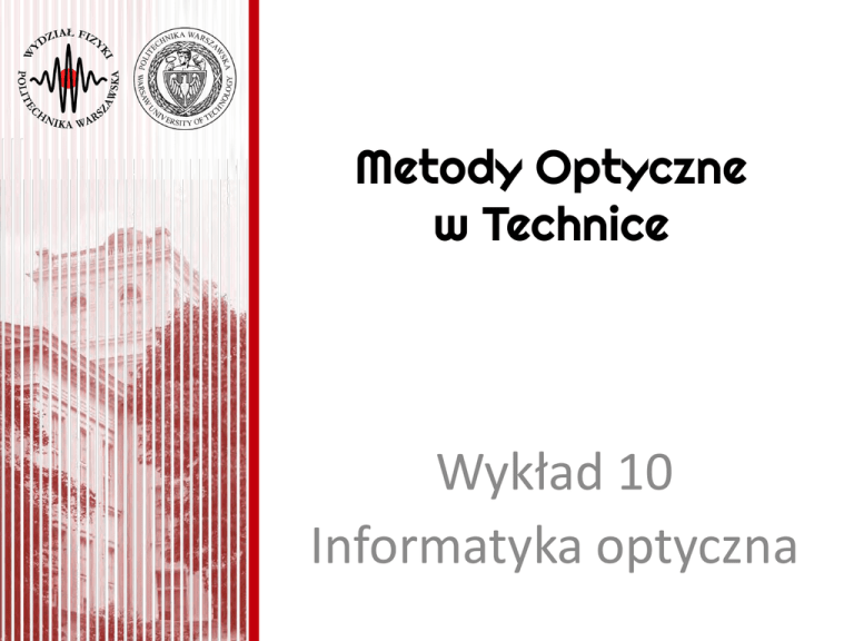 Metody Optyczne w Technice Wykład 10 Informatyka optyczna Informatyka optyczna a inne dziedziny nauki i techniki Teoria elementów optycznych i optoelektr. Fizyka ciała stałego i ciekłych kryształów Teoria sygnałów i układów Optyka Eletronika Optoeletronika Informatyka optyczna Teoria informacji Zastosowania informatyki optycznej Analiza częstościowa układów optycznych Wizualizacja obiektów fazowych Poprawianie obrazów Realizacja operacji matematycznych i logicznych Informatyka optyczna Rozpoznawanie i klasyfikacja obrazów Właściwości informatyki optycznej • Fala świetlna jako nośnik informacji • Informacja kodowana w amplitudzie, fazie, częstości, natężeniu, stanie polaryzacji – sygnał optyczny • Sygnał jest dwuwymiarowy (x,y) (sygnał elektryczny jest jednowymiarowy (t) ) • Podstawą przetwarzania sygnały staje się przekształcenie Fouriera (analiza fourierowska) Sygnał optyczny • Funkcje specjalne: – – – – – – – – – – Funkcja stała Skok jednostkowy Signum Funkcja prostokątna (rectus) Funkcja trójkątna Funkcja kołowa (circus) Sincus Sombrero (funkcja Bessela 1. rodzaju i 1. rzedu) Delta Diraca Funkcja grzebieniowa (combus) Funkcje sinc i somb Funkcja delta Diraca ( x) 0 dla x 0 • Właściwość próbkowania • Właściwość filtracji ( x)dx 1 f ( x) ( x) f 0 ( x) f ( x) ( x)dx f 0 • Właściwość skalowania x x0 b x x0 b cx x0 x 1 x 0 c c Sygnał optyczny • Operacje – Splot – Korelacja wzajemna i autokorelacja – Dwuwymiarowe przekształcenie Fouriera – Przekształcenie Fouriera-Bessela – Przekształcenie Hilberta – Przekształcenie Mellina Splot f ( x) g ( x) f ( x' ) g ( x x' )dx' • Operacja przemienna, łączna, rozdzielna względem dodawania • Operacja niezmiennicza względem przesunięcia • Funkcja wynikowa jest wygładzona i rozmyta • Operacja splotu polega na wstawieniu w każdym punkcie jednej funkcji całego przebiegu drugiej funkcji a następnie scałkowaniu wyniku Korelacja f ( x)g ( x) f ( x' ) g ( x' x)dx' • Brak przemienności • Korelacja jest wypikowana tym bardziej im bardziej podobne są sygnały • Jeśli f(x)=g(x) korelacja staje się autokorelacją Przekształcenie Fouriera f ( x, y ) F ( f x , f y ) f ( x, y ) e 2i xf x yf y dxdy 1 F ( f x , f y ) f ( x, y ) F( f x , f y )e 2i xf x yf y df x df y • Transformacja Fouriera przyporządkowuje funkcji f(x,y) nieskończony ciąg funkcji sinus i cosinus; F jest amplitudami kolejnych funkcji, zaś fx ich częstościami Przekształcenie Fouriera • Operacja liniowa • Przeskalowanie współrzędnych (x,y) a razy powoduje przeskalowanie częstości (fx,fy) oraz amplitud F 1/a raza • Transformata splotu dwóch funkcji jest równa iloczynowi ich transformat i odwrotnie • Całka z kwadratu funkcji w (x,y) jest równa całce z kwadratu jej transformaty Przekształcenie Fouriera rect ( x, y ) sinc( f x , f y ) ( x, y ) 1( f x , f y ) 1( x, y ) ( f x , f y ) comb( x, y ) comb( f x , f y ) circ ( x, y ) J1 (2 ) gdzie f x2 f y2 Przekształcenie Hilberta f x x f x ' dx' x' x 1 1 x f x f x ' dx' x' x 1 • Teoretyczna podstawa cieniowych metod wizualizacji przedmiotów fazowych • Optyczne rozpoznawanie obrazów • Optyka Hilberta Przekształcenie Mellina FM ( s ) f ( x) x s 1dx 0 c i 1 s f ( x) F ( s ) x ds M 2i c i • Poprawianie obrazów zniekształconych czynnikami o charakterze nieinwariantnym przestrzennie • Optyczne metody rozpoznawania obrazów nieczułe na zmianę skali obiektu Twierdzenie o próbkowaniu • Funkcja g(x,y) której transformata G(fx,fy) jest równa zeru dla |fx max|>A; |fy max|>B jest jednoznacznie i całkowicie określona przez zbiór swoich wartośći (próbek) w punktach odległych od siebie o stałe odstępy x<1/2A; y<1/2B odpowiednio w kierunkach osi x i y. x y g ( x, y ) comb , g ( x, y ) h( x, y ) a b gdzie h( x, y ) H ( f x , f y ) 2 A2 B sinc2 Ax sinc2 By Układy liniowe niezmiennicze przestrzennie • Suma dwóch sygnałów poddanych operacji liniowej będzie sumą tych sygnałów poddanych owej operacji z osobna • Każdy punkt sygnału wejściowego jest poddawany operacji w ten sam sposób (kształt odpowiedzi nie zależy od przesunięć sygnału wejściowego) Odpowiedź impulsowa • Odpowiedź impulsowa to sygnał wyjściowy układu (operacji) jeśli sygnałem wejściowym jest punkt (delta Diraca) • Ponieważ każdą funkcję można zapisać jako jej splot z funkcją delta Diraca (każdy obiekt składa się z punktów) oraz zakładamy izoplanatyczność sygnał wyjściowy będzie splotem odpowiedzi impulsowej i obrazu idealnego • Odpowiedź impulsowana nazywana jest też funkcją rozmycia punktu (ang. Point spread function, PSF) Funkcja przenoszenia • Jeśli sygnałem wejściowym jest sygnał sinusoidalny o amplitudzie A, to sygnał wyjściowy będzie charakteryzowała amplituda B. Stosunek B/A w zależności od częstości sygnału wejściowego nazywamy funkcją przenoszenia układu • Funkcja przenoszenia jest transformatą Fouriera odpowiedzi impulsowej Odpowiedź impulsowa wolnej przestrzeni eikz 2ikz x 2 y 2 e hF ( x, y ) iz u ( x, y, z ) u ( x, y,0) hF ( x, y ) • Wolna przestrzeń ma ograniczoną funkcję przenoszenia – część częstości przestrzennych nie jest przenoszona! Soczewka • Soczewka w swoim ognisku realizuje transformatę Fouriera • Dzieje się tak przy założeniu nieskończonych rozmiarów przestrzennych soczewki. W rzeczywistości transformata Fouriera sygnału jest spleciona z transformatą Fouriera apertury (kształtu) soczewki • Soczewka sferyczna realizuje transformatę dwuwymiarową, soczewki cylindryczne realizują transformatę w jednym wymiarze. Soczewka jako element odwzorowujący • Soczewka obrazuje ostro elementy spełniające równanie soczewkowe: 1/x+1/y=1/f • Odpowiedzią impulsową idealnej (bezaberacyjnej, nieskończonej) soczewki jest punkt czyli delta Diraca. W rzeczywistych przypadkach dobrym przybliżeniem jest transform