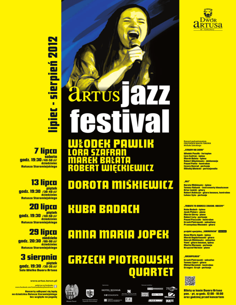 lipiec - sierpień 2012 7 lipca sobota godz. 19:30 /40-50 zł/ dziedziniec Ratusza Staromiejskiego jazz festival Włodek Pawlik Lora Szafran Marek Bałata Robert Więckiewicz 13 lipca piątek Dorota Miśkiewicz 20 lipca piątek Kuba Badach 29 lipca niedziela Anna Maria Jopek godz. 19:30 /30-40 zł/ dziedziniec Ratusza Staromiejskiego godz. 19:30 /40-50 zł/ dziedziniec Ratusza Staromiejskiego godz. 20:30 /80-90 zł/ dziedziniec Ratusza Staromiejskiego 3 sierpnia piątek godz. 19:30 /30-35 zł/ Sala Wielka Dworu Artusa Koncert pod patronatem PREZYDENTA MIASTA TORUNIA Michała Zaleskiego „Struny na ziemi” Włodek Pawlik - fortepian Lora Szafran - śpiew Marek Bałata - śpiew Robert Więckiewicz - deklamacja Paweł Pańta - kontrabas Cezary Konrad - perkusja Mikołaj Wielecki - perkusjonalia „Ale” Dorota Miśkiewicz - śpiew Tomasz Kałwak - instrumenty klawiszowe Artur Lesicki - gitary Robert Kubiszyn - gitara basowa, kontrabas Łukasz Żyta - perkusja „Tribute to Andrzej Zaucha. OBECNY” Kuba Badach - śpiew Jacek Piskorz - piano Marcin Górny - piano Robert Luty - perkusja Paweł Puszczało - kontrabas Grzech Piotrowski - saksofony Przemysław Maciołek - gitara Grzech Piotrowski Quartet projekt specjalny „Sobremesa” Anna Maria Jopek - śpiew Marek Napiórkowski - gitara Henryk Miśkiewicz - saksofon Yami - gitara basowa, śpiew Marito Marques - perkusja Krzysztof Herdzin - piano World Music „Archipelago” Grzech Piotrowski - saksofon Tomasz Lipert - gitara Michał Barański - kontrabas Grzegorz Grzyb - perkusja www.artus.torun.pl polub nas na facebooku www.facebook.com/CentrumKulturyDworArtusa Sponsorzy: Patronat medialny: Bilety w kasie Dworu Artusa pon. - pt. w godz. 12:00 - 18:00 oraz godzinę przed koncertem Koncerty odbywać się będą na dziedzińcu Ratusza Staromiejskiego bez względu na pogodę Miasto Toruń Samorząd Województwa Kujawsko-Pomorskiego
