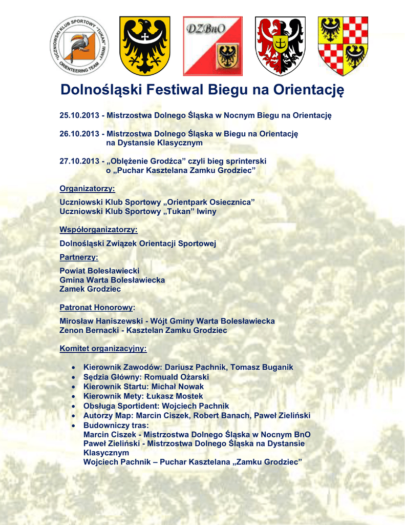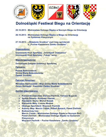 Dolnośląski Festiwal Biegu na Orientację 25.10.2013 - Mistrzostwa Dolnego Śląska w Nocnym Biegu na Orientację 26.10.2013 - Mistrzostwa Dolnego Śląska w Biegu na Orientację na Dystansie Klasycznym 27.10.2013 - „Oblężenie Grodźca” czyli bieg sprinterski o „Puchar Kasztelana Zamku Grodziec” Organizatorzy: Uczniowski Klub Sportowy „Orientpark Osiecznica” Uczniowski Klub Sportowy „Tukan” Iwiny Współorganizatorzy: Dolnośląski Związek Orientacji Sportowej Partnerzy: Powiat Bolesławiecki Gmina Warta Bolesławiecka Zamek Grodziec Patronat Honorowy: Mirosław Haniszewski - Wójt Gminy Warta Bolesławiecka Zenon Bernacki - Kasztelan Zamku Grodziec Komitet organizacyjny: Kierownik Zawodów: Dariusz Pachnik, Tomasz Buganik Sędzia Główny: Romuald Ożarski Kierownik Startu: Michał Nowak Kierownik Mety: Łukasz Mostek Obsługa Sportident: Wojciech Pachnik Autorzy Map: Marcin Ciszek, Robert Banach, Paweł Zieliński Budowniczy tras: Marcin Ciszek - Mistrzostwa Dolnego Śląska w Nocnym BnO Paweł Zieliński - Mistrzostwa Dolnego Śląska na Dystansie Klasycznym Wojciech Pachnik – Puchar Kasztelana „Zamku Grodziec” Program Zawodów: 25.10.2013 Piątek Mistrzostwa Dolnego Śląska w Nocnym Biegu na Orientację. Centrum zawodów: Zespół Szkolno-Przedszkolny w Iwinach, N:51°13’1.68’’; E:15°43’22.45’’ Biuro czynne w godz.17.00-22.00 Start interwałowy; minuta 00 – godz.19.00 Start dla kategorii do KM14 w budynku szkoły – wyjście południowe Start dla kategorii KM16 i starsi, dojście 1700 m znakowane odblaskami. Meta dla wszystkich kategorii w centrum zawodów na terenie szkoły. Limit czasowy: do KM14 – 30 minut; KM16 i starsi – 90 minut Mapy dla kategorii do KM14 i OPEN 1- „IWINY SZKOŁA” - skala 1:1000; e-1m (sporządzona wg normy ISSOM 2007). Boksy startowe będą się znajdować wewnątrz budynku. Start mapowy bezpośrednio po wyjściu z budynku (na schodach po prawej stronie). Mapa dla kategorii KM16 i starszych oraz OPEN 2 , to kombinacja dwóch map. Pierwsza to mapa w skali 1:10000; e-2,5m; „ORIENTPARK IWINY II (sporządzona wg normy ISOM 2000). Na tej mapie odbywa się większość biegu. Końcówka biegu to mapa w skali 1:1000; e-1m; „IWINY SZKOŁA” (sporządzona wg normy ISSOM 2007). Po dobiegnięciu do PK nr 49, należy odwrócić mapę, na której będzie kontynuacja trasy. Kategorie: K10N,K12,K14,K16/18,K35 M10N,M12,M14,M16/18,M21,M45,M50,M55 OPEN 1;OPEN2; Rodzinna Strefa startu będzie wewnątrz budynku szkolnego i będzie obowiązywała tylko kategorie do KM 14 oraz OPEN 1. Strefa zostaje zamknięta o godz.18.30 Meta dla wszystkich kategorii będzie zlokalizowana w bezpośredniej bliskości startu. Prosimy osoby kończące bieg o wchodzenie do szkoły przez łącznik Sali gimnastycznej, tam nastąpi sczytanie kart SI, oraz będzie można napić się wody, herbaty lub kawy Wszystkie mapy będą zabezpieczone folią. Mapy po zakończeniu biegu nie będą zbierane. Prosimy o zachowanie zasady fair-play. Opisy będą na mapach, a dodatkowe w pakietach startowych. Punkty kontrolne będą wyposażone w odblaski (bez lampionów) Uroczystość dekoracji zwycięzców odbędzie się w sobotę o godz.14.00 w centrum zawodów biegu klasycznego. Medale, dyplomy oraz drobne upominki za miejsca 1-3 w kategoriach sportowych oraz dyplomy i upominki w kategoriach OPEN Toalety i prysznic dostępne w budynku szkoły (zaplecze sanitarne przy Sali gimnastycznej). Parking. Prosimy o nie wjeżdżanie na teren szkoły i zaparkowanie od północnej strony szkoły. Kolacja dla osób które nocują w szkole (i zamówiły posiłek) w godz.21.00-21.30 Dodatkowe uwagi: Ze względu na sporą ilość jeżyn na terenie zawodów(część leśna) organizator zaleca użycie ochraniaczy na nogi. Obsługę medyczną zawodów zapewnia Niepubliczny Zakład Opieki Medycznej z Zagrodna – lek. med. Barbara Kołodziej (dostępna w centrum zawodów) 26.10.2013 – Sobota Mistrzostwa Dolnego Śląska na Dystansie Klasycznym; Centrum zawodów: Wieża obserwacyjna w pobliżu miejscowości Okmiany: N:51°14’11.8’’ E:15°45’39.98’’’ Biuro czynne w godz.10.00-14.00 Start interwałowy; minuta 00 – godz.12.00 Dojście na start z CZ 100 m Meta w centrum zawodów Limit czasowy: 120 minut Mapa „ORIENTPARK LUBKÓW” - skala 1:10000; e-2,5m (sporządzona wg normy ISOM 2000). Kategorie: K10N,K12,K14,K16/18,K21, K35 M10N,M12,M14,M16/18,M21,M40/45/50,M55,M60+ OPEN 1;OPEN2; Rodzinna Wszystkie mapy będą zabezpieczone folią. Mapy po zakończeniu biegu nie będą zbierane. Prosimy o zachowanie zasady fair-play. Opisy będą na mapach, a dodatkowe w pakietach startowych. Uroczystość dekoracji zwycięzców odbędzie się w sobotę o godz.14.00 w centrum zawodów. Nagrody we wszystkich kategoriach dyplomy i medale za miejsca 1-3 Dodatkowe informacje: Odległość od boksów startowych do startu mapowego 75 m. Parking – wg schematu na mapce. Prosimy o ustawianie pojazdów po południowej stronie drogi 27.10.2013 – Niedziela „Oblężenie Grodźca” czyli bieg sprinterski o „Puchar Kasztelana Zamku Grodziec” 51.176975,15.759498 Biuro czynne w godz.8.30 -12.00 Start interwałowy, minuta 00 – godz.10.00 Dojście na start z centrum zawodów –150m Meta w centrum zawodów Zakończenie imprezy ok.12.30 (zależnie od pogody, na dziedzińcu zamku lub w Sali Rycerskiej). Limit czasowy: 30 minut Mapa „ORIENTPARK ZAMEK GRODZIEC” - skala 1:10000; e-2,5m (sporządzona wg normy ISSOM 2007). Kategorie: K10N,K12,K14,K16/18,K21, K35 M10N,M12,M14,M16/18,M21,M40/45/50,M55,M60+ OPEN 1;OPEN2; Rodzinna Wszystkie mapy będą zabezpieczone folią. Mapy po zakończeniu biegu nie będą zbierane. Prosimy o zachowanie zasady fair-play. Opisy będą na mapach, a dodatkowe w pakietach startowych. Uroczystość dekoracji zwycięzców odbędzie się w sobotę o godz.12.30 w centrum zawodów. Uwaga !!! kategorie KM21- na trasie biegu nastąpi zmiana mapy przy punkcie kontr