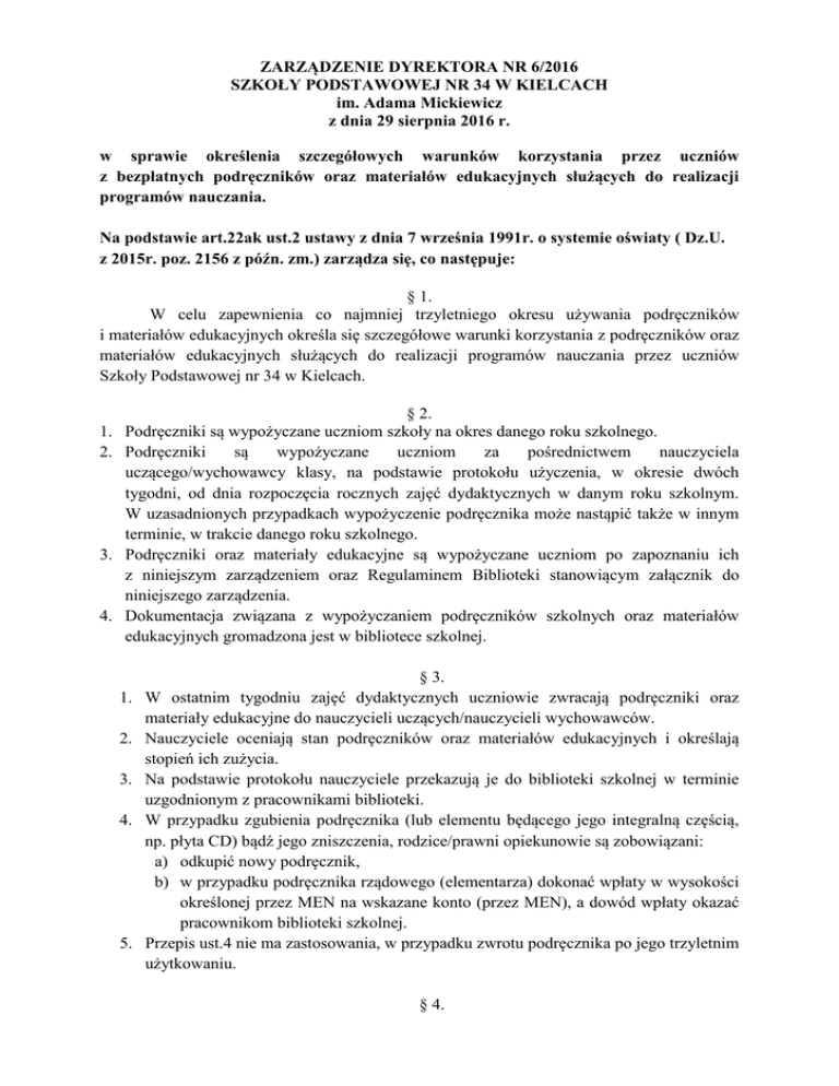 ZARZĄDZENIE DYREKTORA NR 6/2016 SZKOŁY PODSTAWOWEJ NR 34 W KIELCACH im. Adama Mickiewicz z dnia 29 sierpnia 2016 r. w sprawie określenia szczegółowych warunków korzystania przez uczniów z bezpłatnych podręczników oraz materiałów edukacyjnych służących do realizacji programów nauczania. Na podstawie art.22ak ust.2 ustawy z dnia 7 września 1991r. o systemie oświaty ( Dz.U. z 2015r. poz. 2156 z późn. zm.) zarządza się, co następuje: § 1. W celu zapewnienia co najmniej trzyletniego okresu używania podręczników i materiałów edukacyjnych określa się szczegółowe warunki korzystania z podręczników oraz materiałów edukacyjnych służących do realizacji programów nauczania przez uczniów Szkoły Podstawowej nr 34 w Kielcach. § 2. 1. Podręczniki są wypożyczane uczniom szkoły na okres danego roku szkolnego. 2. Podręczniki są wypożyczane uczniom za pośrednictwem nauczyciela uczącego/wychowawcy klasy, na podstawie protokołu użyczenia, w okresie dwóch tygodni, od dnia rozpoczęcia rocznych zajęć dydaktycznych w danym roku szkolnym. W uzasadnionych przypadkach wypożyczenie podręcznika może nastąpić także w innym terminie, w trakcie danego roku szkolnego. 3. Podręczniki oraz materiały edukacyjne są wypożyczane uczniom po zapoznaniu ich z niniejszym zarządzeniem oraz Regulaminem Biblioteki stanowiącym załącznik do niniejszego zarządzenia. 4. Dokumentacja związana z wypożyczaniem podręczników szkolnych oraz materiałów edukacyjnych gromadzona jest w bibliotece szkolnej. 1. 2. 3. 4. 5. § 3. W ostatnim tygodniu zajęć dydaktycznych uczniowie zwracają podręczniki oraz materiały edukacyjne do nauczycieli uczących/nauczycieli wychowawców. Nauczyciele oceniają stan podręczników oraz materiałów edukacyjnych i określają stopień ich zużycia. Na podstawie protokołu nauczyciele przekazują je do biblioteki szkolnej w terminie uzgodnionym z pracownikami biblioteki. W przypadku zgubienia podręcznika (lub elementu będącego jego integralną częścią, np. płyta CD) bądź jego zniszczenia, rodzice/prawni opiekunowie są zobowiązani: a) odkupić nowy podręcznik, b) w przypadku podręcznika rządowego (elementarza) dokonać wpłaty w wysokości określonej przez MEN na wskazane konto (przez MEN), a dowód wpłaty okazać pracownikom biblioteki szkolnej. Przepis ust.4 nie ma zastosowania, w przypadku zwrotu podręcznika po jego trzyletnim użytkowaniu. § 4. 1. W przypadku, gdy uczeń odchodzi ze szkoły w trakcie trwania roku szkolnego, rodzic/ opiekun prawny zobowiązany jest do oddania do biblioteki wszystkich wypożyczonych podręczników i materiałów edukacyjnych. 2. Przepis ust. 1 nie ma zastosowania w przypadku ucznia niepełnosprawnego, przechodzi on do innej szkoły z podręcznikami i materiałami edukacyjnymi, z których korzysta. § 5. Uczniowie mają obowiązek używania podręcznika zgodnie z jego przeznaczeniem, zachowania troski o jego walor użytkowy i estetyczny, chronienia go przed zniszczeniem bądź zagubieniem. §6. Zobowiązuje się nauczycieli wychowawców do zapoznania uczniów i ich rodziców z niniejszym zarządzeniem. § 7. 1. Zarządzenie stosuje się do: uczniów klas I – V szkoły podstawowej– w roku szkolnym 2016/2017. 2. Począwszy od roku szkolnego 2017/2018 zarządzenie stosuje się do wszystkich uczniów szkoły podstawowej. § 8. Zarządzenie podlega ogłoszeniu na szkolnej tablicy ogłoszeń oraz na stronie internetowej szkoły. § 9. Zarządzenie wchodzi w życie z dniem podpisania. Załącznik do Zarządzenia Nr 6 /2016 Dyrektora Szkoły 29 sierpnia 2016r. REGULAMIN BIBLIOTEKI 1. Z biblioteki szkolnej mogą korzystać wszyscy uczniowie, nauczyciele i inni pracownicy szkoły. 2. Jednorazowo wypożyczyć można trzy książki na okres jednego miesiąca (nie dotyczy podręczników). 3. Podręczniki i materiały edukacyjne wypożyczane są za pośrednictwem nauczyciela uczącego/wychowawcy klasy na okres danego roku szkolnego po zapoznaniu się z Zarządzeniem Nr 6/2016 Dyrektora Szkoły z dnia 29 sierpnia 2016r. 4. Wypożyczone książki należy chronić przed zniszczeniem i zgubieniem. 5. Za książkę zniszczoną, zgubioną (nie dotyczy podręcznika) czytelnik musi odkupić taką samą lub inną (w cenie nie niższej niż zagubiona). 6. W przypadku zgubienia podręcznika (lub elementu będącego jego integralną częścią, np. płyta CD) bądź jego zniszczenia, rodzice/prawni opiekunowie są zobowiązani: a) odkupić nowy podręcznik, b) w przypadku podręcznika rządowego (elementarza) dokonać wpłaty w wysokości określonej przez MEN na wskazane przez nich konto, a dowód wpłaty okazać pracownikom biblioteki szkolnej. 7. Uczniowie klas szóstych zobowiązani są do zwrotu wszystkich książek przed końcem roku szkolnego. 8. W bibliotece i czytelni obowiązuje cisza.