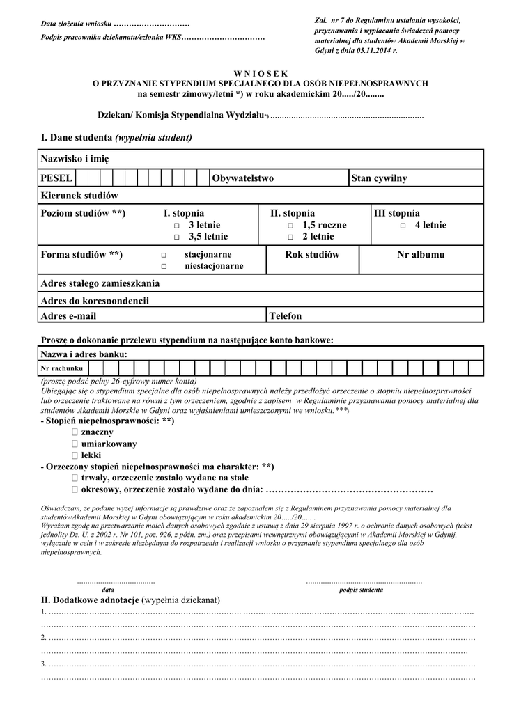 Zał. nr 7 do Regulaminu ustalania wysokości, przyznawania i wypłacania świadczeń pomocy materialnej dla studentów Akademii Morskiej w Gdyni z dnia 05.11.2014 r. Data złożenia wniosku ………………………… Podpis pracownika dziekanatu/członka WKS…………………………… WNIOSEK O PRZYZNANIE STYPENDIUM SPECJALNEGO DLA OSÓB NIEPEŁNOSPRAWNYCH na semestr zimowy/letni *) w roku akademickim 20...../20........ Dziekan/ Komisja Stypendialna Wydziału*) .................................................................. I. Dane studenta (wypełnia student) Nazwisko i imię PESEL Obywatelstwo Stan cywilny Kierunek studiów Poziom studiów **) Forma studiów **) I. stopnia □ 3 letnie □ 3,5 letnie □ □ stacjonarne niestacjonarne II. stopnia □ 1,5 roczne □ 2 letnie □ Rok studiów III stopnia □ 4 letnie Nr albumu Adres stałego zamieszkania Adres do korespondencji Adres e-mail Telefon Proszę o dokonanie przelewu stypendium na następujące konto bankowe: Nazwa i adres banku: Nr rachunku (proszę podać pełny 26-cyfrowy numer konta) Ubiegając się o stypendium specjalne dla osób niepełnosprawnych należy przedłożyć orzeczenie o stopniu niepełnosprawności lub orzeczenie traktowane na równi z tym orzeczeniem, zgodnie z zapisem w Regulaminie przyznawania pomocy materialnej dla studentów Akademii Morskie w Gdyni oraz wyjaśnieniami umieszczonymi we wniosku.***) - Stopień niepełnosprawności: **) znaczny umiarkowany lekki - Orzeczony stopień niepełnosprawności ma charakter: **) trwały, orzeczenie zostało wydane na stałe okresowy, orzeczenie zostało wydane do dnia: ……………………………………………… Oświadczam, że podane wyżej informacje są prawdziwe oraz że zapoznałem się z Regulaminem przyznawania pomocy materialnej dla studentówAkademii Morskiej w Gdyni obowiązującym w roku akademickim 20…../20….. . Wyrażam zgodę na przetwarzanie moich danych osobowych zgodnie z ustawą z dnia 29 sierpnia 1997 r. o ochronie danych osobowych (tekst jednolity Dz. U. z 2002 r. Nr 101, poz. 926, z późn. zm.) oraz przepisami wewnętrznymi obowiązującymi w Akademii Morskiej w Gdynij, wyłącznie w celu i w zakresie niezbędnym do rozpatrzenia i realizacji wniosku o przyznanie stypendium specjalnego dla osób niepełnosprawnych. ..................................... data ....................................................... podpis studenta II. Dodatkowe adnotacje (wypełnia dziekanat) 1. …………………………………………………………………. ………………………………………………………………………………. ……………………………………………………………………………………………………………………………………………………… 2. …………………………………………………………………………………………………………………………………………………… …………………………………………………………………………………………………………………………………………………… 3. …………………………………………………………………………………………………………………………………………………… ……………………………………………………………………………………………………………………………………………………… III. Decyzja Dziekana (Wydziałowej Komisji Stypendialnej) *) w roku akademickim 20.…/20.…: Dane studenta………………………………………………………………………………………………………. Semestr zimowy/semestr letni Przyznana kwota (zł/miesięcznie) stypendium specjalne dla osób niepełnosprawnych: przyznano / nie przyznano*) stypendium przyznano na okres od ……………….…. do…………………….…… uzasadnienie odmowy przyznania stypendium: …………………………………………....................................................... ………………………………………………………………………………………………………………………………... …………….………………………………………………… data, pieczęć i podpis Dziekana (Przewodniczącego Wydziałowej Komisji Stypendialnej)*) _______________________________________________________________________________________________________ *) niepotrzebne skreślić **) właściwe zaznaczyć ***) Zgodnie z ustawą z dnia 27 sierpnia 1997 r. o rehabilitacji zawodowej i społecznej oraz zatrudnianiu osób niepełnosprawnych (. j. Dz. U. z 2008 r. Nr 14, poz. 92 z późn. zm.) za równoważne (o ile nie utraciło ono ważności przed dniem wejścia w życie ww. ustawy tj.przed dniem 1 stycznia 1998 r.) uznaje się odpowiednio: 1) na równi z orzeczeniem o znacznym stopniu niepełnosprawności: a) orzeczenie lekarza orzecznika ZUS o całkowitej niezdolności do pracy i niezdolności do samodzielnej egzystencji; b) orzeczenie o zaliczeniu do I grupy inwalidów; c) w przypadku osób o stałej albo długotrwałej niezdolności do pracy w gospodarstwie rolnym - osoby niepełnosprawne, którym przysługuje zasiłek pielęgnacyjny; 2) na równi z orzeczeniem o umiarkowanym stopniu niepełnosprawności: a) orzeczenie lekarza orzecznika ZUS o całkowitej niezdolności do pracy; b) orzeczenie o zaliczeniu do II grypy inwalidów; 3) na równi z orzeczeniem o lekkim stopniu niepełnosprawności: a) orzeczenie lekarza orzecznika ZUS o częściowej niezdolnoścido pracy oraz celowości przekwalifikowania; b) orzeczenie o zaliczeniu do III grypy inwalidów; c) w przypadku osób o stałej albo długotrwałej niezdolności do pracy w gospodarstwie rolnym - pozostałe osoby niepełnosprawne.
