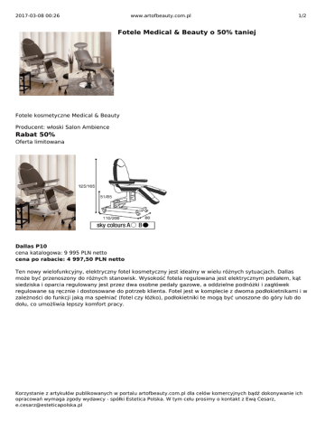 2017-03-08 00:26 www.artofbeauty.com.pl 1/2 Fotele Medical & Beauty o 50% taniej Fotele kosmetyczne Medical & Beauty Producent: włoski Salon Ambience Rabat 50% Oferta limitowana Dallas P10 cena katalogowa: 9 995 PLN netto cena po rabacie: 4 997,50 PLN netto Ten nowy wielofunkcyjny, elektryczny fotel kosmetyczny jest idealny w wielu różnych sytuacjach. Dallas może być przenoszony do różnych stanowisk. Wysokość fotela regulowana jest elektrycznym pedałem, kąt siedziska i oparcia regulowany jest przez dwa osobne pedały gazowe, a oddzielne podnóżki i zagłówek regulowane są ręcznie i dostosowane do potrzeb klienta. Fotel jest w komplecie z dwoma podłokietnikami i w zależności do funkcji jaką ma spełniać (fotel czy łóżko), podłokietniki te mogą być unoszone do góry lub do dołu, co umożliwia lepszy komfort pracy. Korzystanie z artykułów publikowanych w portalu artofbeauty.com.pl dla celów komercyjnych bądź dokonywanie ich opracowań wymaga zgody wydawcy - spółki Estetica Polska. W tym celu prosimy o kontakt z Ewą Cesarz, [email protected] 2017-03-08 00:26 www.artofbeauty.com.pl 2/2 Dallas P10 cena katalogowa: 9 995 PLN netto cena po rabacie: 4 997,50 PLN netto Ten nowy wielofunkcyjny, elektryczny fotel kosmetyczny jest idealny w wielu różnych sytuacjach. Dallas może być przenoszony do różnych stanowisk. Wysokośc fotela regulowana jest elektrycznym pedałem, kąt siedziska i oparcia regulowany jest przez dwa osobne pedały gazowe, a podnóżek i zagłówek regulowane są ręcznie i dostosowane do potrzeb klienta. Fotel jest w komplecie z dwoma podłokietnikami i w zależności do funkcji jaką ma spełniać (fotel czy łóżko), podłokietniki te mogą być unoszone do góry lub do dołu, co umożliwia lepszy komfort pracy. New Jersey P1 cena katalogowa: 4 745 PLN netto cena po rabacie: 2 372,50 PLN netto Profesjonalny fotel do pedicure, z regulowanym oparciem, zagłówkiem oraz niezależnymi od siebie podnóżkami, które są regulowane w pionie i poziomie. Fotel obity jest materiałem Sky, dostępnym w 44 kolorach. Podłokietniki wykonane są z czarnego tworzywa sztucznego, a podstawa z chromowanego metalu. Wysokość siedzenia jest regulowana poprzez pompę hydrauliczną z blokadą. Kontakt: 601 620 455 [email protected] Korzystanie z artykułów publikowanych w portalu artofbeauty.com.pl dla celów komercyjnych bądź dokonywanie ich opracowań wymaga zgody wydawcy - spółki Estetica Polska. W tym celu prosimy o kontakt z Ewą Cesarz, [email protected]