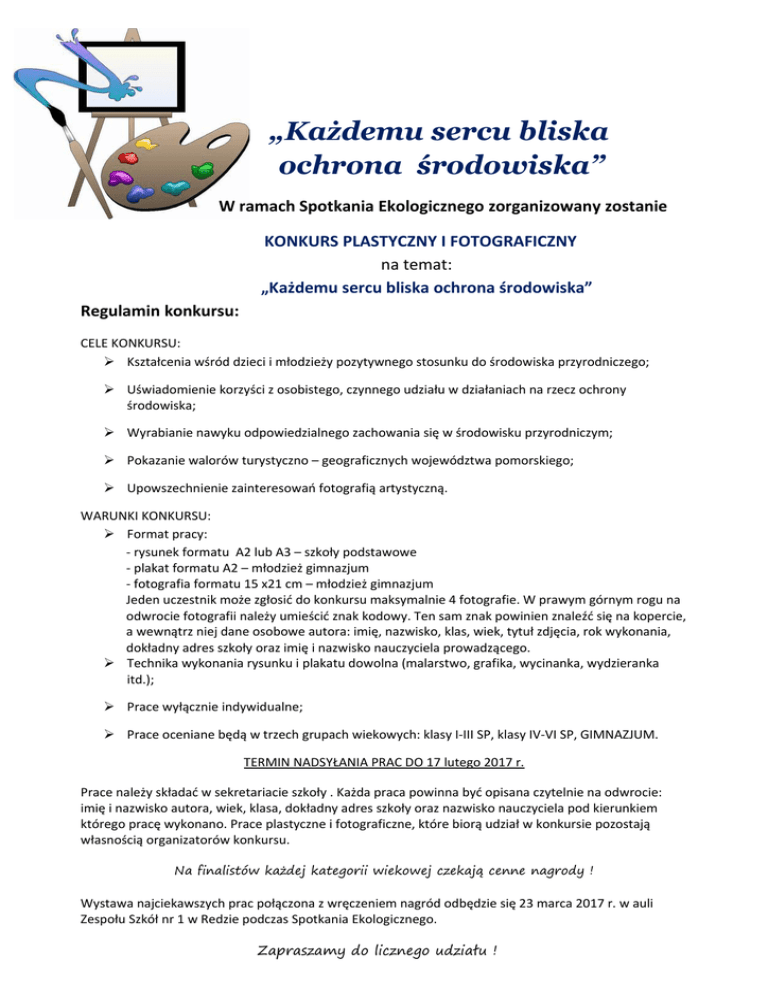 „Każdemu sercu bliska ochrona środowiska” W ramach Spotkania Ekologicznego zorganizowany zostanie KONKURS PLASTYCZNY I FOTOGRAFICZNY na temat: „Każdemu sercu bliska ochrona środowiska” Regulamin konkursu: CELE KONKURSU: Kształcenia wśród dzieci i młodzieży pozytywnego stosunku do środowiska przyrodniczego; Uświadomienie korzyści z osobistego, czynnego udziału w działaniach na rzecz ochrony środowiska; Wyrabianie nawyku odpowiedzialnego zachowania się w środowisku przyrodniczym; Pokazanie walorów turystyczno – geograficznych województwa pomorskiego; Upowszechnienie zainteresowań fotografią artystyczną. WARUNKI KONKURSU: Format pracy: - rysunek formatu A2 lub A3 – szkoły podstawowe - plakat formatu A2 – młodzież gimnazjum - fotografia formatu 15 x21 cm – młodzież gimnazjum Jeden uczestnik może zgłosić do konkursu maksymalnie 4 fotografie. W prawym górnym rogu na odwrocie fotografii należy umieścić znak kodowy. Ten sam znak powinien znaleźć się na kopercie, a wewnątrz niej dane osobowe autora: imię, nazwisko, klas, wiek, tytuł zdjęcia, rok wykonania, dokładny adres szkoły oraz imię i nazwisko nauczyciela prowadzącego. Technika wykonania rysunku i plakatu dowolna (malarstwo, grafika, wycinanka, wydzieranka itd.); Prace wyłącznie indywidualne; Prace oceniane będą w trzech grupach wiekowych: klasy I-III SP, klasy IV-VI SP, GIMNAZJUM. TERMIN NADSYŁANIA PRAC DO 17 lutego 2017 r. Prace należy składać w sekretariacie szkoły . Każda praca powinna być opisana czytelnie na odwrocie: imię i nazwisko autora, wiek, klasa, dokładny adres szkoły oraz nazwisko nauczyciela pod kierunkiem którego pracę wykonano. Prace plastyczne i fotograficzne, które biorą udział w konkursie pozostają własnością organizatorów konkursu. Na finalistów każdej kategorii wiekowej czekają cenne nagrody ! Wystawa najciekawszych prac połączona z wręczeniem nagród odbędzie się 23 marca 2017 r. w auli Zespołu Szkół nr 1 w Redzie podczas Spotkania Ekologicznego. Zapraszamy do licznego udziału !