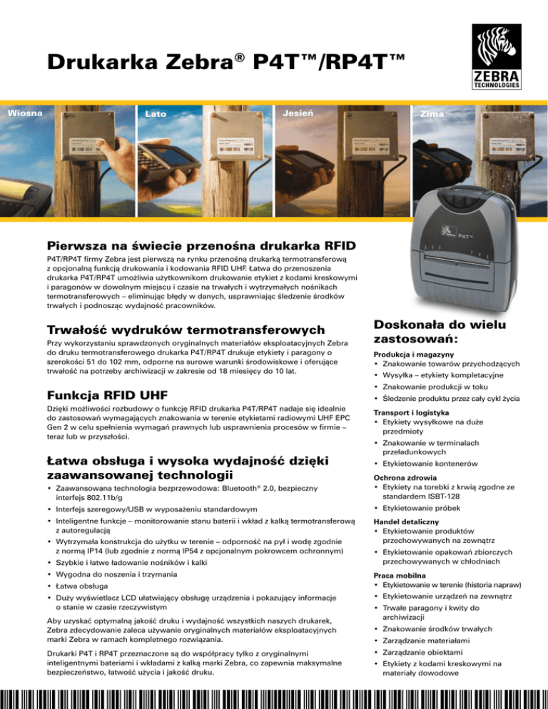 Drukarka Zebra® P4T™/RP4T™ Wiosna Lato Jesień Zima Pierwsza na świecie przenośna drukarka RFID P4T/RP4T firmy Zebra jest pierwszą na rynku przenośną drukarką termotransferową z opcjonalną funkcją drukowania i kodowania RFID UHF. Łatwa do przenoszenia drukarka P4T/RP4T umożliwia użytkownikom drukowanie etykiet z kodami kreskowymi i paragonów w dowolnym miejscu i czasie na trwałych i wytrzymałych nośnikach termotransferowych – eliminując błędy w danych, usprawniając śledzenie środków trwałych i podnosząc wydajność pracowników. Trwałość wydruków termotransferowych Przy wykorzystaniu sprawdzonych oryginalnych materiałów eksploatacyjnych Zebra do druku termotransferowego drukarka P4T/RP4T drukuje etykiety i paragony o szerokości 51 do 102 mm, odporne na surowe warunki środowiskowe i oferujące trwałość na potrzeby archiwizacji w zakresie od 18 miesięcy do 10 lat. Funkcja RFID UHF Dzięki możliwości rozbudowy o funkcję RFID drukarka P4T/RP4T nadaje się idealnie do zastosowań wymagających znakowania w terenie etykietami radiowymi UHF EPC Gen 2 w celu spełnienia wymagań prawnych lub usprawnienia procesów w firmie – teraz lub w przyszłości. Łatwa obsługa i wysoka wydajność dzięki zaawansowanej technologii Doskonała do wielu zastosowań: Produkcja i magazyny • Znakowanie towarów przychodzących • Wysyłka – etykiety kompletacyjne • Znakowanie produkcji w toku • Śledzenie produktu przez cały cykl życia Transport i logistyka • Etykiety wysyłkowe na duże przedmioty • Znakowanie w terminalach przeładunkowych • Etykietowanie kontenerów • Zaawansowana technologia bezprzewodowa: Bluetooth® 2.0, bezpieczny interfejs 802.11b/g Ochrona zdrowia • Etykiety na torebki z krwią zgodne ze standardem ISBT-128 • Interfejs szeregowy/USB w wyposażeniu standardowym • Etykietowanie próbek • Inteligentne funkcje – monitorowanie stanu baterii i wkład z kalką termotransferową z autoregulacją Handel detaliczny • Etykietowanie produktów przechowywanych na zewnątrz • Wytrzymała konstrukcja do użytku w terenie – odporność na pył i wodę zgodnie z normą IP14 (lub zgodnie z normą IP54 z opcjonalnym pokrowcem ochronnym) • Szybkie i łatwe ładowanie nośników i kalki • Wygodna do noszenia i trzymania • Łatwa obsługa • Duży wyświetlacz LCD ułatwiający obsługę urządzenia i pokazujący informacje o stanie w czasie rzeczywistym Aby uzyskać optymalną jakość druku i wydajność wszystkich naszych drukarek, Zebra zdecydowanie zaleca używanie oryginalnych materiałów eksploatacyjnych marki Zebra w ramach kompletnego rozwiązania. Drukarki P4T i RP4T przeznaczone są do współpracy tylko z oryginalnymi inteligentnymi bateriami i wkładami z kalką marki Zebra, co zapewnia maksymalne bezpieczeństwo, łatwość użycia i jakość druku. • Etykietowanie opakowań zbiorczych przechowywanych w chłodniach Praca mobilna • Etykietowanie w terenie (historia napraw) • Etykietowanie urządzeń na zewnątrz • Trwałe paragony i kwity do archiwizacji • Znakowanie środków trwałych • Zarządzanie materiałami • Zarządzanie obiektami • Etykiety z kodami kreskowymi na materiały dowodowe Podstawowe dane techniczne* Wyposażenie standardowe Parametry pracy • Pamięć flash 8 MB/SRAM 16 MB • Interfejs USB 2.0/szeregowy • Procesor 32-bitowy • Druk w trybie termotransferowym lub termicznym (z automatycznym czujnikiem) • Duży wyświetlacz LCD • Obsługa nośników składanych • Konstrukcja OpenACCESS™ zapewniająca łatwe ładowanie nośników i kalki • Odporność na wielokrotne upadki na beton z wysokości do 1,52 m • Czujnik przerwy, czarnego znacznika, nośnika, szerokości nośnika, otwartej pokrywy i kalki • Inteligentna bateria i wkład z kalką • Pasek na ramię Środowiskowe • Temp. pracy (dr. termiczny): -20°C do 50°C • Temp. pracy (dr. termotrans.): 0°C do 45°C • Temp. przechowywania: -30°C do 65°C • Wilgotność pracy: 10% do 90% bez kondensacji Elektryczne • Inteligentna bateria litowo-jonowa wielokrotnego ładowania, 7,4 V, 4200 mAh Spełniane normy EMC: • FCC część 15 i EN 55022 klasa B • Zgodność z wymaganiami dla łączności bezprzewodowej – Bluetooth, 802.11b/g i RFID • FCC, Industry Canada • Uchwyt RAM® do montażu w pojazdach i wózkach widłowych • Zestaw montażowy do wózków widłowych do prac ciężkich • Zasilacz DC • Ładowarka samochodowa • Pokrowiec nylonowy • Zapasowa bateria • Kable • Obsługa nośników składanych Rozwiązania ZebraLink™ Oprogramowanie/praca w sieci/firmware • CPCL • ZPL** • EPL™ • XML, WML do programowania wyświetlacza **ZPL wymagany do obsługi RFID Dane techniczne drukarki Bezpieczeństwo: • IEC 60950, znak NRTL dla USA i Kanady Rozdzielczość: • 8 punktów na mm/203 dpi UE: • Dyrektywy EMC, LVD, R&TTE Pamięć: • Flash 8 MB /SRAM 16 MB Parametry fizyczne Maks. szerokość druku: • 104 mm Szerokość: • 177,8 mm Szybkość druku: • Termiczny 76,2 mm na sekundę • Termotransferowy 38,1 mm na sekundę Wysokość: • 218,4 mm Głębokość: • 76,2 mm • Kody liniowe: Codabar (NW-7), Code 39, Code 93, Code 128, EAN-8, EAN-13, FIM Postnet, Interleaved 2-of-5, MSI, Plessey, UCC/EAN128, UPC-A, UPC-E, rozszerzenia 2- lub 5-cyfrowe • Dwuwymiarowe: Aztec Code, Data Matrix, GS1 DataBar™ (RSS), MaxiCode, PDF417, QR Code • Stosunek kresek: 1,5:1, 2:1, 2,5:1, 3:1, 3,5:1 Parametry nośników Masa: • 1,32 kg z kalką i baterią Czcionki i grafika Maksymalna szerokość etykiet z podkładem: • 104,78 mm Maksymalne wymiary rolki z nośnikiem: • Średnica zewn. 66 mm na rdzeniu o średnicy wewn. 19,1 mm (nośniki bez RFID) • Średnica zewn. 66 mm na rdzeniu o średnicy wewn. 34,9 mm (nośniki RFID) Grubość nośników: • 0,08 mm do 0,216 mm Rodzaje nośników: • Paragony, etykiety syntetyczne lub papierowe Parametry kalki Rodzaj kalk