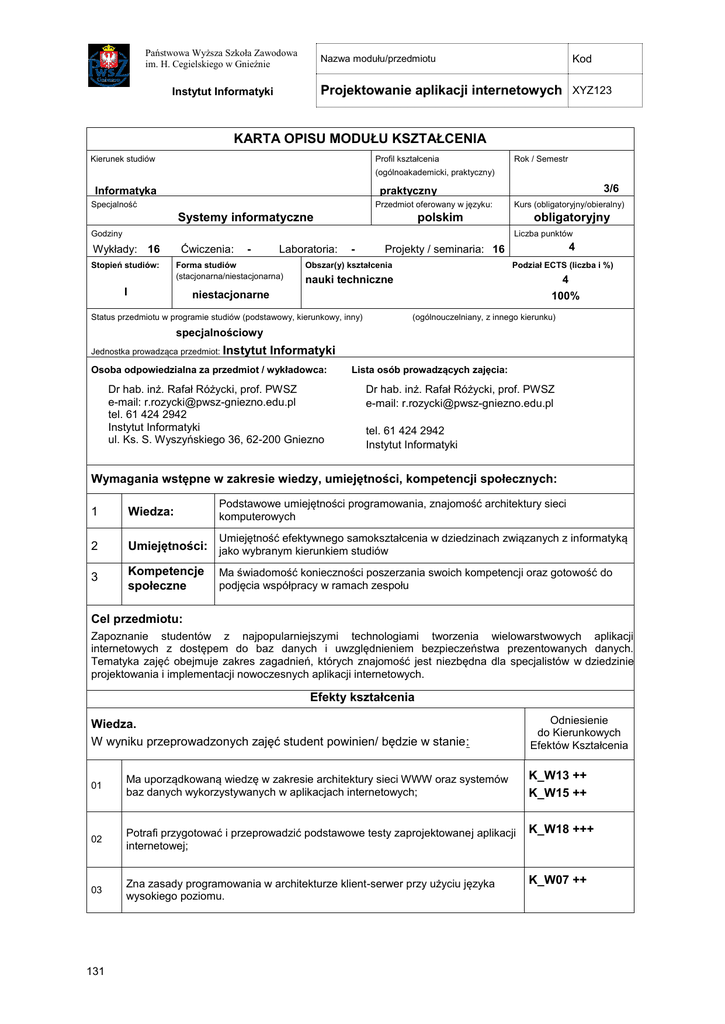 Państwowa Wyższa Szkoła Zawodowa im. H. Cegielskiego w Gnieźnie Kod Nazwa modułu/przedmiotu Projektowanie aplikacji internetowych XYZ123 Instytut Informatyki KARTA OPISU MODUŁU KSZTAŁCENIA Kierunek studiów Profil kształcenia Rok / Semestr (ogólnoakademicki, praktyczny) Informatyka 3/6 praktyczny Specjalność Przedmiot oferowany w języku: Systemy informatyczne Kurs (obligatoryjny/obieralny) polskim Godziny obligatoryjny Liczba punktów Wykłady: 16 Stopień studiów: Ćwiczenia: - Laboratoria: Forma studiów (stacjonarna/niestacjonarna) I - 4 Projekty / seminaria: 16 Obszar(y) kształcenia Podział ECTS (liczba i %) nauki techniczne 4 100% niestacjonarne Status przedmiotu w programie studiów (podstawowy, kierunkowy, inny) Liczba punktów (ogólnouczelniany, z innego kierunku) specjalnościowy Jednostka prowadząca przedmiot: Instytut Informatyki Osoba odpowiedzialna za przedmiot / wykładowca: Dr hab. inż. Rafał Różycki, prof. PWSZ e-mail: [email protected] tel. 61 424 2942 Instytut Informatyki ul. Ks. S. Wyszyńskiego 36, 62-200 Gniezno xx xxx Lista osób prowadzących zajęcia: Dr hab. inż. Rafał Różycki, prof. PWSZ e-mail: [email protected] tel. 61 424 2942 Instytut Informatyki Wymagania wstępne w zakresie wiedzy, umiejętności, kompetencji społecznych: Podstawowe umiejętności programowania, znajomość architektury sieci komputerowych 1 Wiedza: 2 Umiejętności: jako wybranym kierunkiem studiów 3 Kompetencje społeczne Umiejętność efektywnego samokształcenia w dziedzinach związanych z informatyką Ma świadomość konieczności poszerzania swoich kompetencji oraz gotowość do podjęcia współpracy w ramach zespołu Cel przedmiotu: Zapoznanie studentów z najpopularniejszymi technologiami tworzenia wielowarstwowych aplikacji internetowych z dostępem do baz danych i uwzględnieniem bezpieczeństwa prezentowanych danych. Tematyka zajęć obejmuje zakres zagadnień, których znajomość jest niezbędna dla specjalistów w dziedzinie projektowania i implementacji nowoczesnych aplikacji internetowych. Efekty kształcenia Wiedza. W wyniku przeprowadzonych zajęć student powinien/ będzie w stanie: Odniesienie do Kierunkowych Efektów Kształcenia 01 Ma uporządkowaną wiedzę w zakresie architektury sieci WWW oraz systemów baz danych wykorzystywanych w aplikacjach internetowych; K_W13 ++ K_W15 ++ 02 Potrafi przygotować i przeprowadzić podstawowe testy zaprojektowanej aplikacji internetowej; K_W18 +++ 03 Zna zasady programowania w architekturze klient-serwer przy użyciu języka wysokiego poziomu. K_W07 ++ 131 Projektowanie aplikacji internetowych Umiejętności. W wyniku przeprowadzonych zajęć student będzie potrafił: Odniesienie do Kierunkowych Efektów Kształcenia 01 potrafi opracować specyfikację i dokumentację projektową realizowanego projektu aplikacji internetowej K_U03 ++ 02 wykonać, uruchomić oraz przetestować zaprojektowany prosty system informatyczny K_U16 +++ 03 skonstruować algorytm oraz posłużyć się właściwie dobranymi środowiskami programistycznymi, symulatorami oraz narzędziami komputerowo wspomaganego projektowania do symulacji, projektowania i weryfikacji elementów systemu informatycznego K_U09 ++ Kompetencje społeczne. W wyniku przeprowadzonych zajęć student zdobędzie następujące kompetencje: Odniesienie do Kierunkowych Efektów Kształcenia 01 Rozumie potrzebę permanentnego kształcenia się w zakresie szczególnie szybko rozwijającej się technologii światowej sieci WWW. K_K01 + 02 Ma świadomość aspektów prawnych i konieczności przestrzegania etyki zawodowej związanej z prezentowaniem danych poprzez sieć Internet K_K04 + Sposoby sprawdzenia efektów kształcenia Wykład egzamin: pisemny test wielokrotnego wyboru + ewentualna część ustna (dla osób starających się o wyższą ocenę) , Projekt: ocena realizacji projektów cząstkowych w danej technologii internetowej; ocena projektu przygotowanego w ramach pracy własnej. Uzyskiwanie punktów dodatkowych za aktywność podczas zajęć, a szczególnie za: zrealizowaną dodatkową funkcjonalność nie przewidzianą w wymaganiach projektu cząstkowego; propozycję własnych tematów projektów zaliczeniowych; umiejętność współpracy w ramach zespołu praktycznie realizującego projekt zaliczeniowy; Treści programowe Architektura Internetu (WWW, protokoły HTTP, HTTPS), wybrane technologie prezentacji danych (HTML5, CSS, XML, XSLT, SVG), wybrane języki i techniki skryptowe (JavaScript, DOM, AJAX), wybrane technologie tworzenia serwisów po stronie serwera (PHP/MySQL, ASP.NET), podstawy mobilnych aplikacji WWW. Literatura podstawowa: 1. 2. 3. Szajkowska J., AJAX i PHP. Tworzenie interaktywnych aplikacji internetowych , Helion, 2011 Szczepaniak M., Skalowalne witryny internetowe. Budowa, skalowanie i optymalizacja aplikacji internetowych nowej generacji, Helion, 2007 Liberty J., ASP.NET 3.5. Programowanie, Helion, 2010 Literatura uzupełniająca: 1. 132 WWW – strony i portale internetowe Projektowanie aplikacji internetowych Obciążenie pracą studenta forma aktywności godzin ECTS Łączny nakład pracy 80 1) 5 Zajęcia wymagające indywidualnego kontaktu z nauczycielem 38 2) 3 Zajęcia o charakterze praktycznym 26 3) 2 1 pkt ECTS 25-30 h pracy studenta – do określenia poszczególnych składowych proszę przyjąć dotychczasową liczbę punktów. 1) – łączne obciążenie studenta 2) - zajęcia dydaktyczne {w+c+L+p} + konsultacje +egzamin, 3) Zajęcia laboratoryjne+przygotowanie do tych zajęć+opracowanie sprawozdań+zajęcia projektowe+przygotowanie do zajęć projektowych+konsulatcje w sprawie projektów+realizacja projektu. KOMEK_2014_PrakNSTt_v2.doc 133