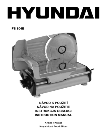 FS 804E NÁVOD K POUŽITÍ NÁVOD NA POUŽITIE INSTRUKCJA OBSŁUGI INSTRUCTION MANUAL Kráječ / Krájač Krajalnica / Food Slicer Před prvním použitím kráječe si pozorně přečtěte celý návod k obsluze a pokyny pro bezpečnost a seznamte se se všemi funkcemi přístroje. Může být užitečné ponechat si otevřenou stránku s vyobrazením kráječe a jeho ovládání. Tyto pokyny si dobře uschovejte a pokud je potřeba předejte je dalšímu uživateli. Správné používání Tento přístroj je určen výhradně ke krájení běžných potravin v domácnosti. Potraviny, které budete krájet, musí být předem rozmražené, vybalené a zbavené kostí. Jiný způsob používání nebo úpravy přístroje budou považovány za nesprávné používání a vést k vážnému poškození. Vlastnosti 1) Tělo kráječe ) Spínač 3) Krájecí nůž ) Posuvný podávací stůl ) Držák potravin ) Zástrčka ) Ovladač pro nastavení tloušťky ) Opěrná deska potravin ) Upevňovací šroub nože Důležité bezpečnostní pokyny • Kráječ musí být připojen pouze k elektrické síti s napětím 230 V. • Před čistěním kráječe, při jeho poškození nebo po ukončení práce jej vždy odpojte z elektrické zásuvky. Pro odpojení přístroje z elektrické zásuvky nikdy netáhněte za kabel, vždy uchopte přímo zástrčku. • Pouze pro vnitřní použití: Přístroj nikdy neponořujte do vody a nevystavujte jej dešti nebo vlhkosti. Dojde-li ke spadnutí přístroje do vody, nejprve odpojte zástrčku ze zásuvky a teprve potom vyjměte přístroj z vody. Před dalším použitím nechejte kráječ zkontrolovat v autorizovaném servisním středisku. • Nepoužívejte krájet s mokrýma rukama nebo když stojíte na mokré podlaze. Nepoužívejte kráječ pokud je mokrý nebo vlhký. • Tento přístroj je určen pouze pro domácí použití a nikoliv pro komerční nebo průmyslový provoz. • Sestavujte a ukládejte kráječ mimo dosah dětí. • Pokud je zapnutý a v provozu, nenechávejte jej bez dozoru. • Před používáním vždy zkontrolujte, zda je kráječ bezpečně sestaven a nainstalován. • Kráječ by měl být vždy používán s nasazeným posuvným podávacím stolem a držákem kousků, pokud je to možné vzhledem k velikosti nebo tvaru potravin. Nepoužívejte kráječ pro řezání kostí nebo hluboce zmrazených potravin. • Nepoužívejte kráječ pokud je jakýmkoliv způsobem poškozen. V takovém případě jej nechejte ihned opravit v autorizovaném servisním středisku nebo jiným kvalifikovaným opravářem. • Kráječ používejte pouze s dodávaným příslušenstvím. • Žádný požadavek na záruku nebo odpovědnost za poškození nebudou akceptovány, pokud je jejich příčinou nevhodné nebo nesprávné použití kráječe. • Před odstraněním nože nebo když se jej chcete dotknout při provozu, kráječ vypněte. • Pokud je poškozena síťová šňůra, musí být vyměněna výrobcem, jeho servisním zástupcem nebo podobně kvalifikovanou osobou, aby se předešlo nebezpečí. CZ - CZ • Tento spotřebič není určen pro používání osobami (včetně dětí), jimž fyzická, smyslová, nebo mentální neschopnost či nedostatek zkušeností a znalostí zabraňuje v bezpečném používání spotřebiče, pokud na ně nebude dohlíženo nebo pokud nebyly instruovány ohledně použití spotřebiče osobou zodpovědnou za jejich bezpečnost. • Na děti by se mělo dohlížet, aby se zajistilo, že si nebudou se spotřebičem hrát. Před prvním použitím Kráječ opatrně vyjměte z krabice. Odstraňte všechny obalové materiály a uložte je společně s krabicí. Před kontaktem kráječe s potravinami jej vyčistěte (viz část označená Čištění) Sestavení kráječe Specifické pokyny pro umístění kráječe 1) Kráječ nikdy nestavte na horký povrch nebo do blízkosti otevřeného plamene. ) Ujistěte se, zda síťová šňůra nevede před horké předměty nebo ostré hrany 3) Nedovolte, aby došlo k vytvoření smyčky na šňůře nebo zachycení ani ji neomotávejte kolem kráječe. ) Postavte kráječ na rovný, neklouzavý povrch do blízkosti elektrické zásuvky. ) Odmotejte požadovanou délku síťové šňůry a zapojte zástrčku do elektrické zásuvky. ) Držák potravin5 nasaďte tlakem na posuvný podávací stůl4. Krájení Specifické bezpečnostní pokyny pro krájení a zacházení s kráječem 1) Nikdy se nedotýkejte nože, pokud je kráječ v provozu! Nebezpečí poranění! ) Vždy používejte držák potravin (vyjma v případě velmi velkých kusů potravin). Kousek potraviny, kterou budete krájet, tlačte dopředu pomocí držáku potravin. 3) Kráječ používejte pouze pro krájení běžných potravin v domácnosti a nikoliv pro jiné účely. Nepoužívejte kráječ pro krájení hluboce zmrazených potravin, kostí, potravin s velkými jádry nebo pro krájení balených potravin. ) Kráječ nepoužívejte v trvalém provozu delším než 10 minut. ) Krájecí nůž3 pokračuje v rotaci i po vypnutí kráječe. ) Z důvodu bezpečnosti musí být po použití nastavení tloušťky krájených kousků vráceno do polohy “0”. Provoz kráječe Stiskněte přepínač do polohy “ON”, krájecí nůž se roztočí. Zastavení nepřetržitého provozu: Přesuňte přepínač rychle do polohy “OFF” a počkejte až se krájecí nůž úplně zastaví. Nastavení tloušťky krájených kousků Tloušťku plátků lze nastavit mezi 0 a přibližně 12 mm. Požadovanou tloušťku nastavte pomocí ovladače7. Nastavení na stupnici neodpovídá tloušťce plátků v mm. Z bezpečnostních důvodů je krájecí nůž v poloze ”0” zakrytý. Potravinu, kterou budete krájet, položte na posuvný podávací stůl. Poté ji mírně stlačte pomocí držáku potravin5 proti opěrné desce potravin8. Přístroj zapněte a s mírným tlakem na pot